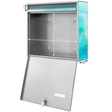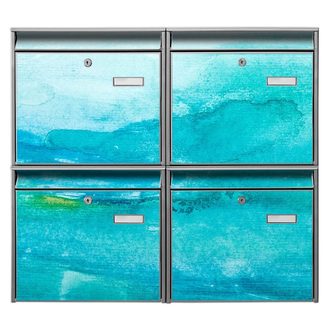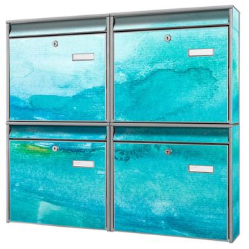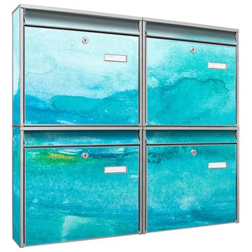 FUNKTION: Die Burg-Wächter Briefkastenanlage mit Motiv Aquarell Blau bietet Ihnen ausreichend Fassungsvermögen um auch A4 und C4 Sendungen zu empfangen. Das integrierte Namensschild lässt sich individuell beschriften. Wählen Sie aus den Grundfarben weiß, silber und schwarz. DESIGN: Die 4 Briefkästen haben ein ansprechendes und zeitloses Design, ohne dabei auf Funktionalität zu verzichten. Das Material ist sehr stabil, wetterfest und rostfrei. Durch das Motiv Aquarell Blau werden die Postkästen zu einem Blickfang. DETAILS: Die Postkästen bestehen aus verzinktem Stahl der zusätzlich mit Klarlack versiegelt wurde. Die Kästen sind gesamt 64,5cm hoch, 72,5cm breit und 10cm tief. Das Motiv besteht aus einer wetter- und UV-festen Folie, die Ihren Briefkasten zusätzlich vor Kratzern schützt. Die Postkästen werden mit Montagematerial, je einem Namensschild und je zwei Schlüsseln geliefert. NUTZEN: Das Briefkastenset eignet sich für die Wandmontage, die Größe bietet genügend Platz für Sendungen aller Art. Das zeitlose Design sowie die stabile Bauart bieten Ihnen einen treuen Begleiter für Ihre Post. BANJADO: