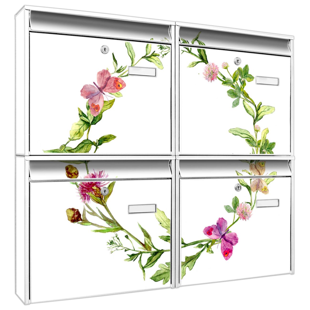 FUNKTION: Die Burg-Wächter Briefkastenanlage mit Motiv Aquarell Blumenring bietet Ihnen ausreichend Fassungsvermögen um auch A4 und C4 Sendungen zu empfangen. Das integrierte Namensschild lässt sich individuell beschriften. Wählen Sie aus den Grundfarben weiß, silber und schwarz. DESIGN: Die 4 Briefkästen haben ein ansprechendes und zeitloses Design, ohne dabei auf Funktionalität zu verzichten. Das Material ist sehr stabil, wetterfest und rostfrei. Durch das Motiv Aquarell Blumenring werden die Postkästen zu einem Blickfang. DETAILS: Die Postkästen bestehen aus verzinktem Stahl der zusätzlich mit Klarlack versiegelt wurde. Die Kästen sind gesamt 64,5cm hoch, 72,5cm breit und 10cm tief. Das Motiv besteht aus einer wetter- und UV-festen Folie, die Ihren Briefkasten zusätzlich vor Kratzern schützt. Die Postkästen werden mit Montagematerial, je einem Namensschild und je zwei Schlüsseln geliefert. NUTZEN: Das Briefkastenset eignet sich für die Wandmontage, die Größe bietet genügend Platz für Sendungen aller Art. Das zeitlose Design sowie die stabile Bauart bieten Ihnen einen treuen Begleiter für Ihre Post. BANJADO: