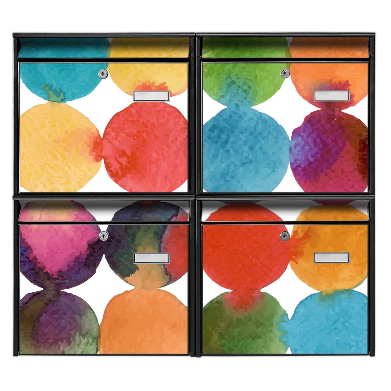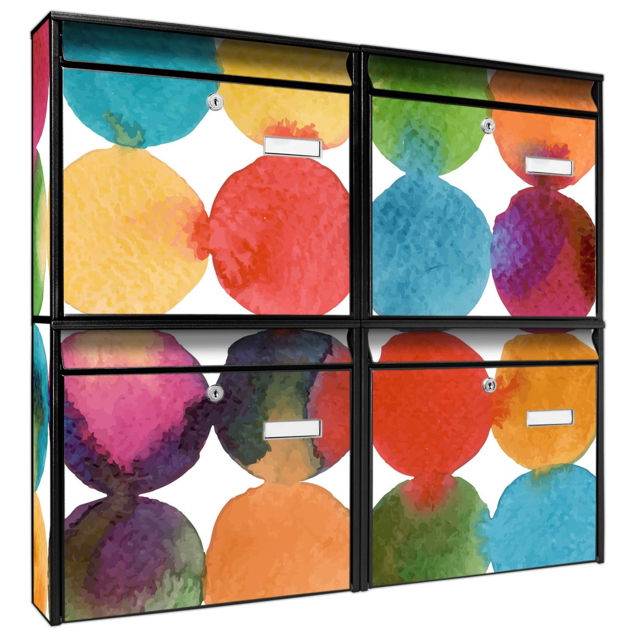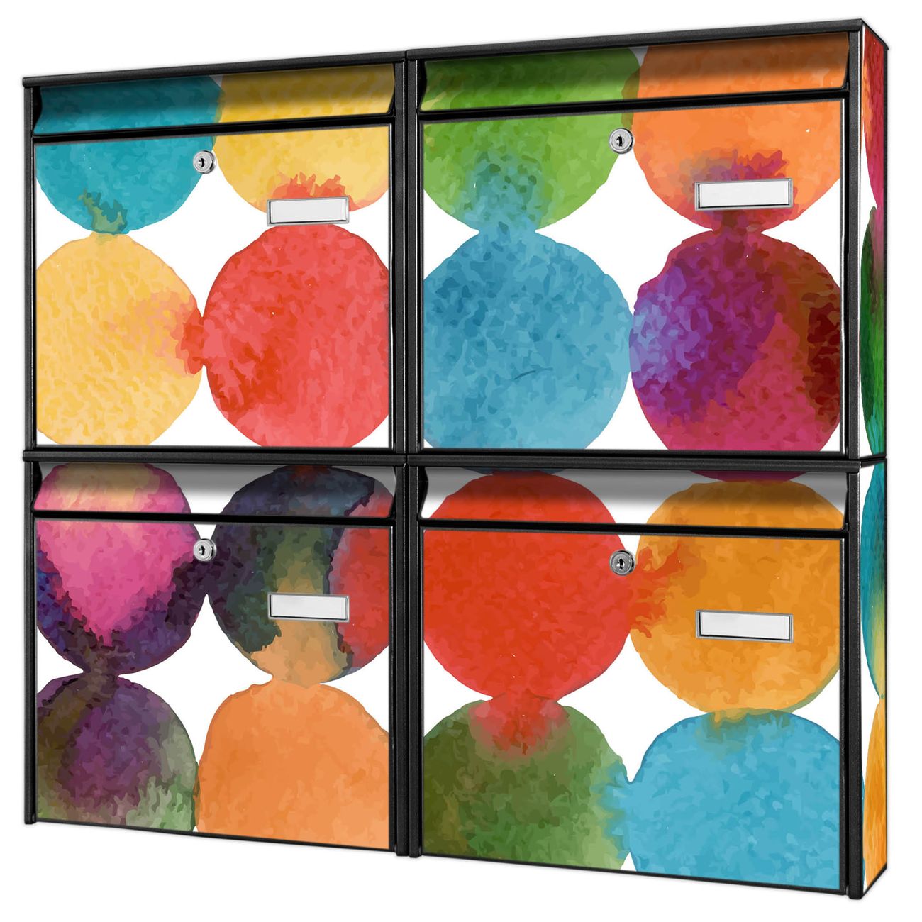 FUNKTION: Die Burg-Wächter Briefkastenanlage mit Motiv Aquarell Kreise bietet Ihnen ausreichend Fassungsvermögen um auch A4 und C4 Sendungen zu empfangen. Das integrierte Namensschild lässt sich individuell beschriften. Wählen Sie aus den Grundfarben weiß, silber und schwarz. DESIGN: Die 4 Briefkästen haben ein ansprechendes und zeitloses Design, ohne dabei auf Funktionalität zu verzichten. Das Material ist sehr stabil, wetterfest und rostfrei. Durch das Motiv Aquarell Kreise werden die Postkästen zu einem Blickfang. DETAILS: Die Postkästen bestehen aus verzinktem Stahl der zusätzlich mit Klarlack versiegelt wurde. Die Kästen sind gesamt 64,5cm hoch, 72,5cm breit und 10cm tief. Das Motiv besteht aus einer wetter- und UV-festen Folie, die Ihren Briefkasten zusätzlich vor Kratzern schützt. Die Postkästen werden mit Montagematerial, je einem Namensschild und je zwei Schlüsseln geliefert. NUTZEN: Das Briefkastenset eignet sich für die Wandmontage, die Größe bietet genügend Platz für Sendungen aller Art. Das zeitlose Design sowie die stabile Bauart bieten Ihnen einen treuen Begleiter für Ihre Post. BANJADO:
