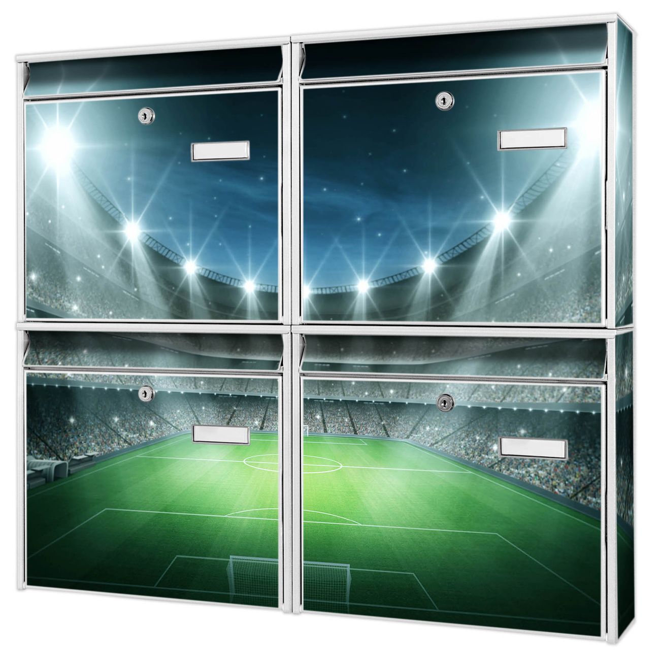 FUNKTION: Die Burg-Wächter Briefkastenanlage mit Motiv Arena bietet Ihnen ausreichend Fassungsvermögen um auch A4 und C4 Sendungen zu empfangen. Das integrierte Namensschild lässt sich individuell beschriften. Wählen Sie aus den Grundfarben weiß, silber und schwarz. DESIGN: Die 4 Briefkästen haben ein ansprechendes und zeitloses Design, ohne dabei auf Funktionalität zu verzichten. Das Material ist sehr stabil, wetterfest und rostfrei. Durch das Motiv Arena werden die Postkästen zu einem Blickfang. DETAILS: Die Postkästen bestehen aus verzinktem Stahl der zusätzlich mit Klarlack versiegelt wurde. Die Kästen sind gesamt 64,5cm hoch, 72,5cm breit und 10cm tief. Das Motiv besteht aus einer wetter- und UV-festen Folie, die Ihren Briefkasten zusätzlich vor Kratzern schützt. Die Postkästen werden mit Montagematerial, je einem Namensschild und je zwei Schlüsseln geliefert. NUTZEN: Das Briefkastenset eignet sich für die Wandmontage, die Größe bietet genügend Platz für Sendungen aller Art. Das zeitlose Design sowie die stabile Bauart bieten Ihnen einen treuen Begleiter für Ihre Post. BANJADO: