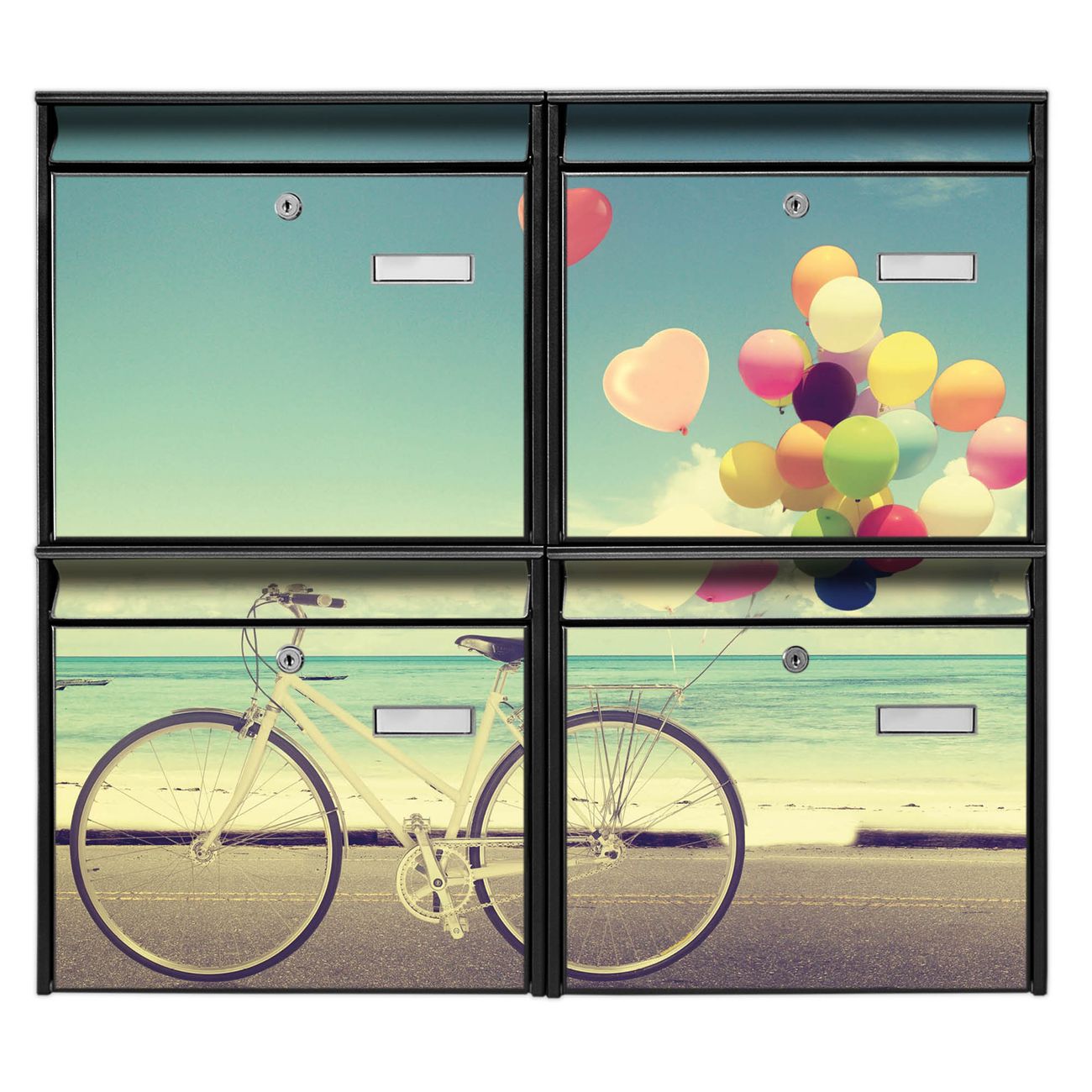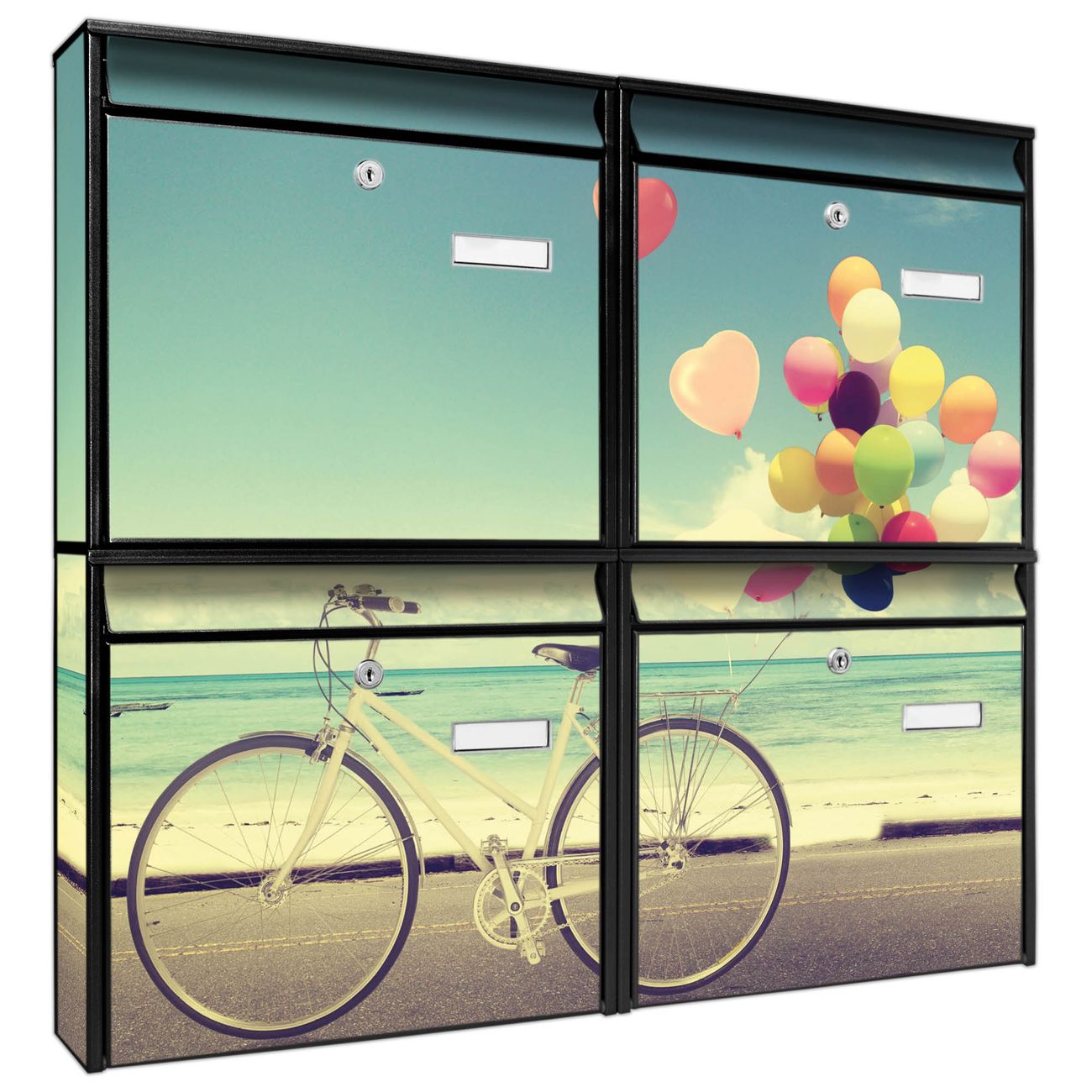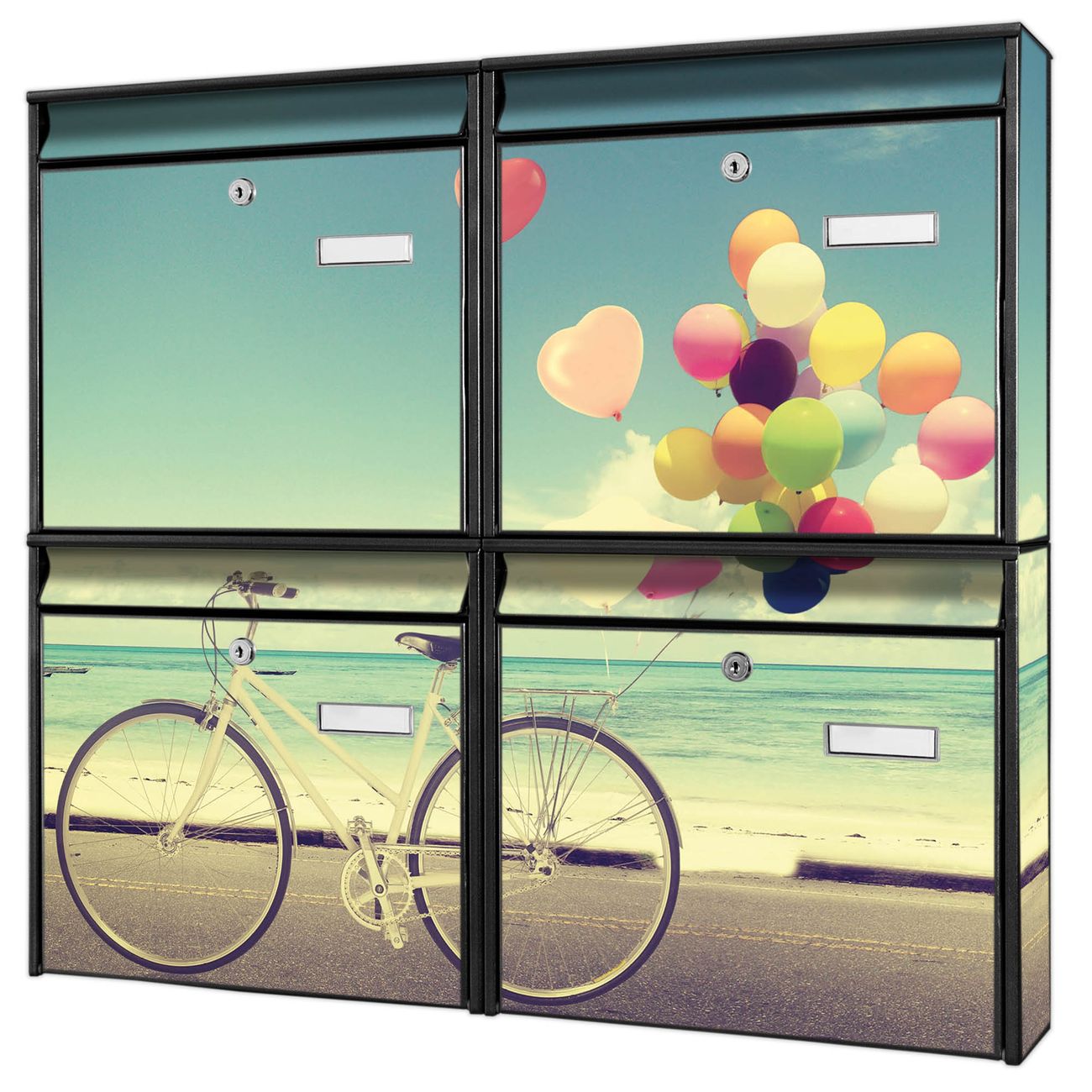 FUNKTION: Die Burg-Wächter Briefkastenanlage mit Motiv Auf Und Davon bietet Ihnen ausreichend Fassungsvermögen um auch A4 und C4 Sendungen zu empfangen. Das integrierte Namensschild lässt sich individuell beschriften. Wählen Sie aus den Grundfarben weiß, silber und schwarz. DESIGN: Die 4 Briefkästen haben ein ansprechendes und zeitloses Design, ohne dabei auf Funktionalität zu verzichten. Das Material ist sehr stabil, wetterfest und rostfrei. Durch das Motiv Auf Und Davon werden die Postkästen zu einem Blickfang. DETAILS: Die Postkästen bestehen aus verzinktem Stahl der zusätzlich mit Klarlack versiegelt wurde. Die Kästen sind gesamt 64,5cm hoch, 72,5cm breit und 10cm tief. Das Motiv besteht aus einer wetter- und UV-festen Folie, die Ihren Briefkasten zusätzlich vor Kratzern schützt. Die Postkästen werden mit Montagematerial, je einem Namensschild und je zwei Schlüsseln geliefert. NUTZEN: Das Briefkastenset eignet sich für die Wandmontage, die Größe bietet genügend Platz für Sendungen aller Art. Das zeitlose Design sowie die stabile Bauart bieten Ihnen einen treuen Begleiter für Ihre Post. BANJADO: