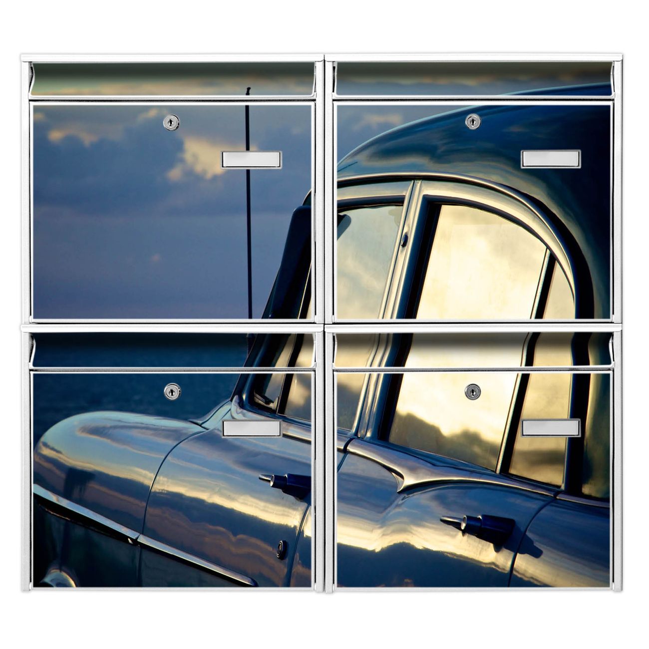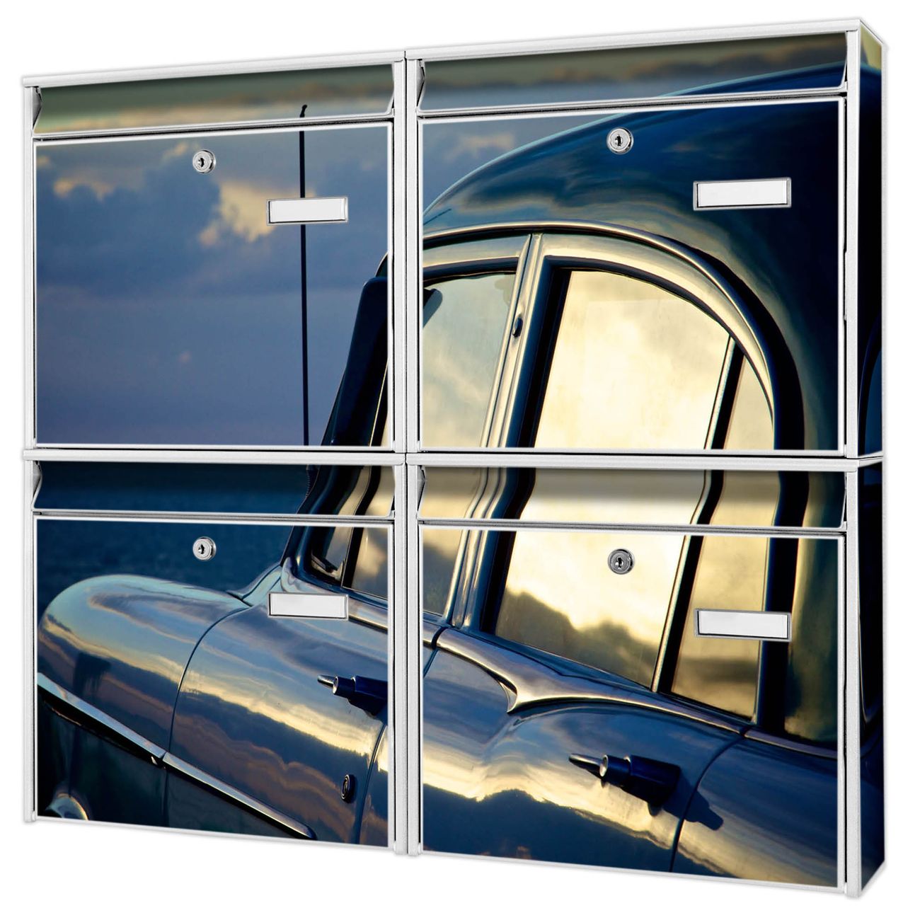 FUNKTION: Die Burg-Wächter Briefkastenanlage mit Motiv Auto am Strand bietet Ihnen ausreichend Fassungsvermögen um auch A4 und C4 Sendungen zu empfangen. Das integrierte Namensschild lässt sich individuell beschriften. Wählen Sie aus den Grundfarben weiß, silber und schwarz. DESIGN: Die 4 Briefkästen haben ein ansprechendes und zeitloses Design, ohne dabei auf Funktionalität zu verzichten. Das Material ist sehr stabil, wetterfest und rostfrei. Durch das Motiv Auto am Strand werden die Postkästen zu einem Blickfang. DETAILS: Die Postkästen bestehen aus verzinktem Stahl der zusätzlich mit Klarlack versiegelt wurde. Die Kästen sind gesamt 64,5cm hoch, 72,5cm breit und 10cm tief. Das Motiv besteht aus einer wetter- und UV-festen Folie, die Ihren Briefkasten zusätzlich vor Kratzern schützt. Die Postkästen werden mit Montagematerial, je einem Namensschild und je zwei Schlüsseln geliefert. NUTZEN: Das Briefkastenset eignet sich für die Wandmontage, die Größe bietet genügend Platz für Sendungen aller Art. Das zeitlose Design sowie die stabile Bauart bieten Ihnen einen treuen Begleiter für Ihre Post. BANJADO: