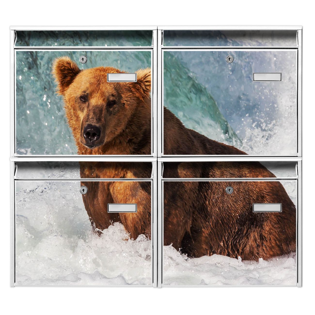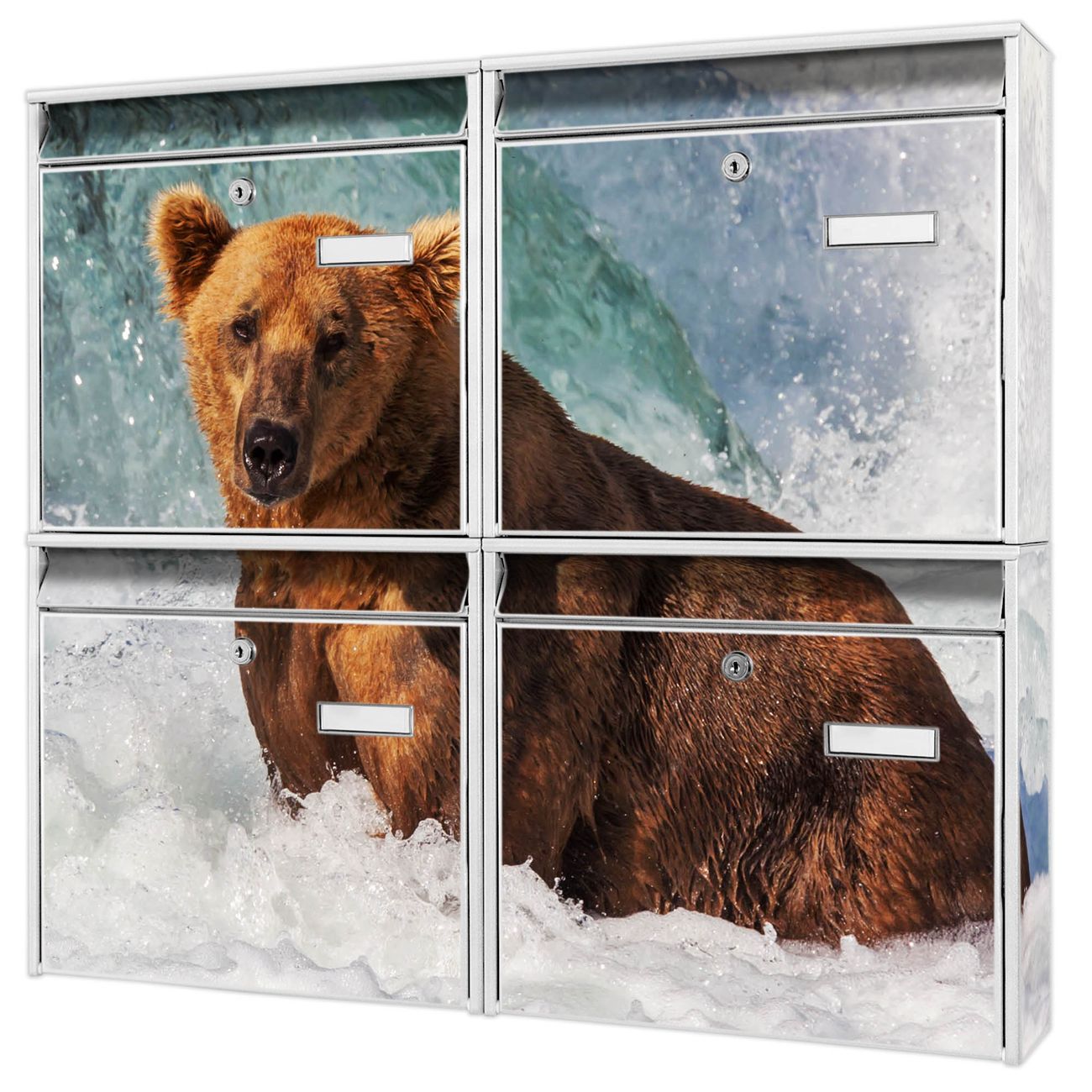 FUNKTION: Die Burg-Wächter Briefkastenanlage mit Motiv Bär Im Wasser bietet Ihnen ausreichend Fassungsvermögen um auch A4 und C4 Sendungen zu empfangen. Das integrierte Namensschild lässt sich individuell beschriften. Wählen Sie aus den Grundfarben weiß, silber und schwarz. DESIGN: Die 4 Briefkästen haben ein ansprechendes und zeitloses Design, ohne dabei auf Funktionalität zu verzichten. Das Material ist sehr stabil, wetterfest und rostfrei. Durch das Motiv Bär Im Wasser werden die Postkästen zu einem Blickfang. DETAILS: Die Postkästen bestehen aus verzinktem Stahl der zusätzlich mit Klarlack versiegelt wurde. Die Kästen sind gesamt 64,5cm hoch, 72,5cm breit und 10cm tief. Das Motiv besteht aus einer wetter- und UV-festen Folie, die Ihren Briefkasten zusätzlich vor Kratzern schützt. Die Postkästen werden mit Montagematerial, je einem Namensschild und je zwei Schlüsseln geliefert. NUTZEN: Das Briefkastenset eignet sich für die Wandmontage, die Größe bietet genügend Platz für Sendungen aller Art. Das zeitlose Design sowie die stabile Bauart bieten Ihnen einen treuen Begleiter für Ihre Post. BANJADO: