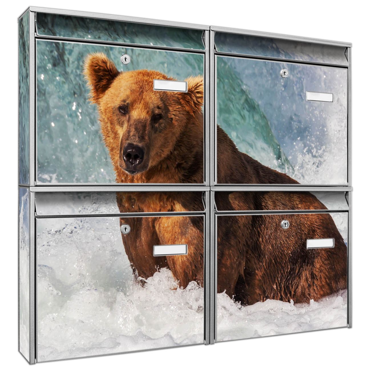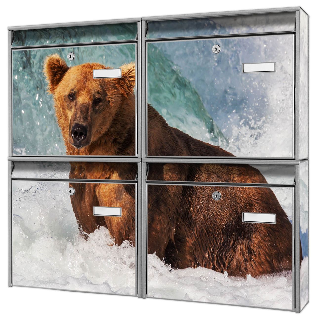 FUNKTION: Die Burg-Wächter Briefkastenanlage mit Motiv Bär Im Wasser bietet Ihnen ausreichend Fassungsvermögen um auch A4 und C4 Sendungen zu empfangen. Das integrierte Namensschild lässt sich individuell beschriften. Wählen Sie aus den Grundfarben weiß, silber und schwarz. DESIGN: Die 4 Briefkästen haben ein ansprechendes und zeitloses Design, ohne dabei auf Funktionalität zu verzichten. Das Material ist sehr stabil, wetterfest und rostfrei. Durch das Motiv Bär Im Wasser werden die Postkästen zu einem Blickfang. DETAILS: Die Postkästen bestehen aus verzinktem Stahl der zusätzlich mit Klarlack versiegelt wurde. Die Kästen sind gesamt 64,5cm hoch, 72,5cm breit und 10cm tief. Das Motiv besteht aus einer wetter- und UV-festen Folie, die Ihren Briefkasten zusätzlich vor Kratzern schützt. Die Postkästen werden mit Montagematerial, je einem Namensschild und je zwei Schlüsseln geliefert. NUTZEN: Das Briefkastenset eignet sich für die Wandmontage, die Größe bietet genügend Platz für Sendungen aller Art. Das zeitlose Design sowie die stabile Bauart bieten Ihnen einen treuen Begleiter für Ihre Post. BANJADO: