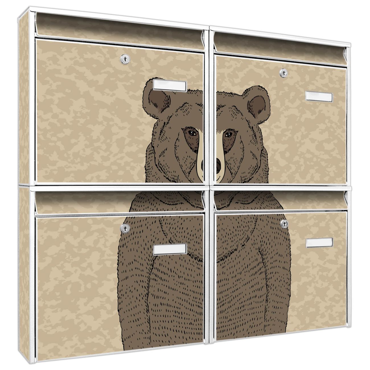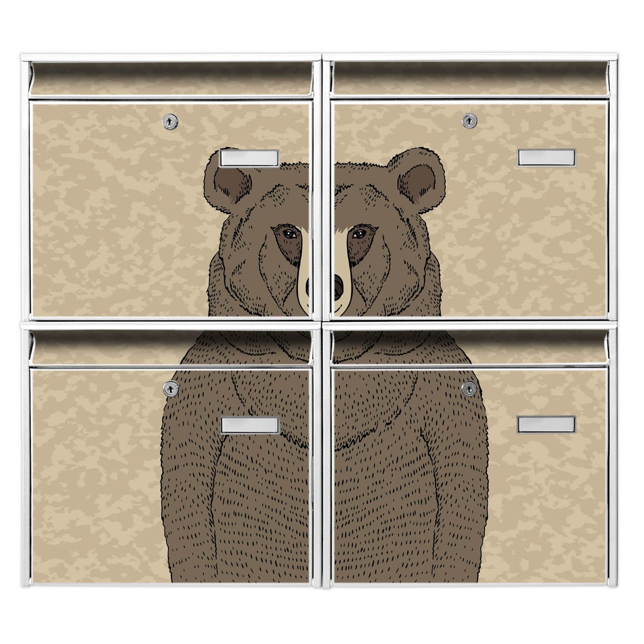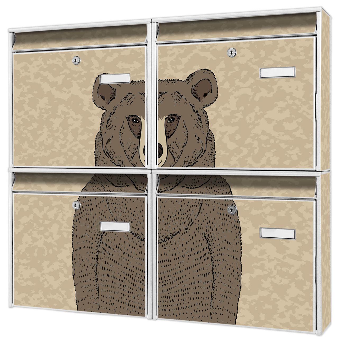 FUNKTION: Die Burg-Wächter Briefkastenanlage mit Motiv Bär Ohne Brille bietet Ihnen ausreichend Fassungsvermögen um auch A4 und C4 Sendungen zu empfangen. Das integrierte Namensschild lässt sich individuell beschriften. Wählen Sie aus den Grundfarben weiß, silber und schwarz. DESIGN: Die 4 Briefkästen haben ein ansprechendes und zeitloses Design, ohne dabei auf Funktionalität zu verzichten. Das Material ist sehr stabil, wetterfest und rostfrei. Durch das Motiv Bär Ohne Brille werden die Postkästen zu einem Blickfang. DETAILS: Die Postkästen bestehen aus verzinktem Stahl der zusätzlich mit Klarlack versiegelt wurde. Die Kästen sind gesamt 64,5cm hoch, 72,5cm breit und 10cm tief. Das Motiv besteht aus einer wetter- und UV-festen Folie, die Ihren Briefkasten zusätzlich vor Kratzern schützt. Die Postkästen werden mit Montagematerial, je einem Namensschild und je zwei Schlüsseln geliefert. NUTZEN: Das Briefkastenset eignet sich für die Wandmontage, die Größe bietet genügend Platz für Sendungen aller Art. Das zeitlose Design sowie die stabile Bauart bieten Ihnen einen treuen Begleiter für Ihre Post. BANJADO: