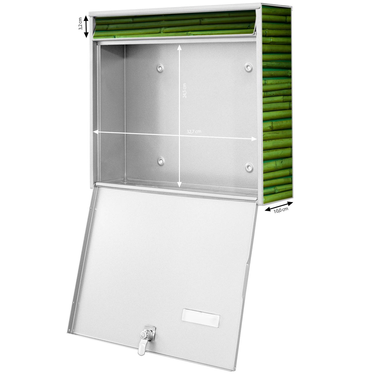 FUNKTION: Die Burg-Wächter Briefkastenanlage mit Motiv Bambus Grün bietet Ihnen ausreichend Fassungsvermögen um auch A4 und C4 Sendungen zu empfangen. Das integrierte Namensschild lässt sich individuell beschriften. Wählen Sie aus den Grundfarben weiß, silber und schwarz. DESIGN: Die 4 Briefkästen haben ein ansprechendes und zeitloses Design, ohne dabei auf Funktionalität zu verzichten. Das Material ist sehr stabil, wetterfest und rostfrei. Durch das Motiv Bambus Grün werden die Postkästen zu einem Blickfang. DETAILS: Die Postkästen bestehen aus verzinktem Stahl der zusätzlich mit Klarlack versiegelt wurde. Die Kästen sind gesamt 64,5cm hoch, 72,5cm breit und 10cm tief. Das Motiv besteht aus einer wetter- und UV-festen Folie, die Ihren Briefkasten zusätzlich vor Kratzern schützt. Die Postkästen werden mit Montagematerial, je einem Namensschild und je zwei Schlüsseln geliefert. NUTZEN: Das Briefkastenset eignet sich für die Wandmontage, die Größe bietet genügend Platz für Sendungen aller Art. Das zeitlose Design sowie die stabile Bauart bieten Ihnen einen treuen Begleiter für Ihre Post. BANJADO: