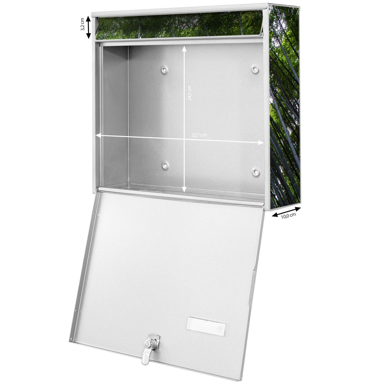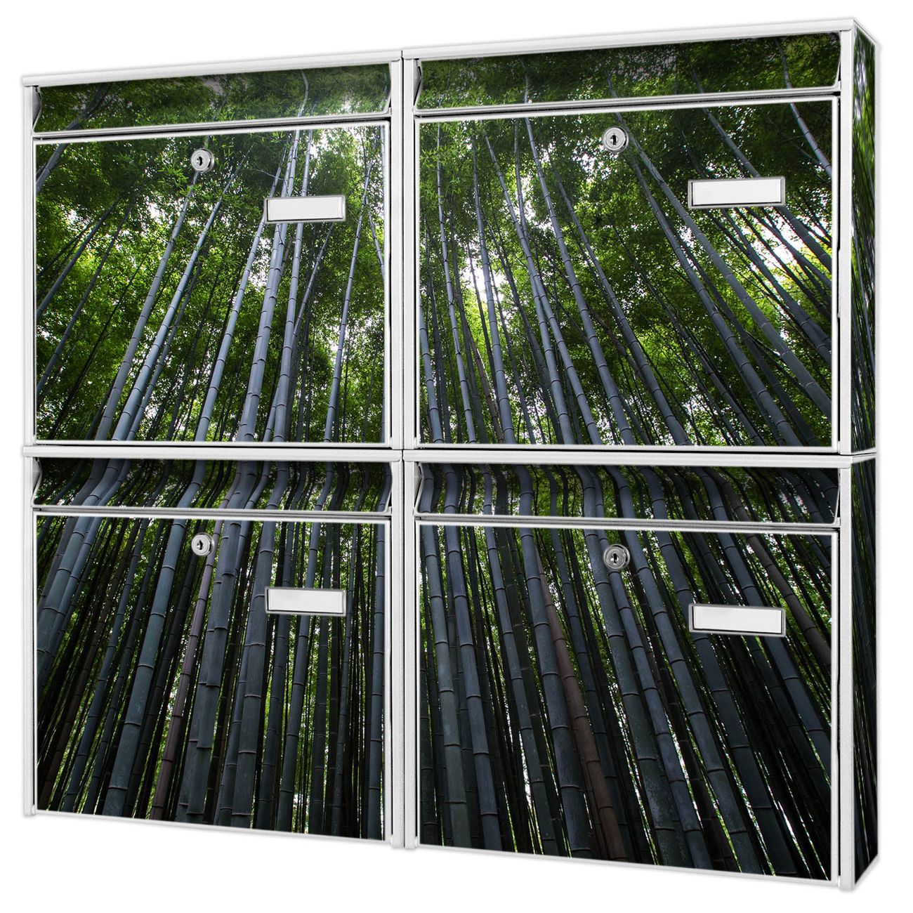 FUNKTION: Die Burg-Wächter Briefkastenanlage mit Motiv Bambuswald bietet Ihnen ausreichend Fassungsvermögen um auch A4 und C4 Sendungen zu empfangen. Das integrierte Namensschild lässt sich individuell beschriften. Wählen Sie aus den Grundfarben weiß, silber und schwarz. DESIGN: Die 4 Briefkästen haben ein ansprechendes und zeitloses Design, ohne dabei auf Funktionalität zu verzichten. Das Material ist sehr stabil, wetterfest und rostfrei. Durch das Motiv Bambuswald werden die Postkästen zu einem Blickfang. DETAILS: Die Postkästen bestehen aus verzinktem Stahl der zusätzlich mit Klarlack versiegelt wurde. Die Kästen sind gesamt 64,5cm hoch, 72,5cm breit und 10cm tief. Das Motiv besteht aus einer wetter- und UV-festen Folie, die Ihren Briefkasten zusätzlich vor Kratzern schützt. Die Postkästen werden mit Montagematerial, je einem Namensschild und je zwei Schlüsseln geliefert. NUTZEN: Das Briefkastenset eignet sich für die Wandmontage, die Größe bietet genügend Platz für Sendungen aller Art. Das zeitlose Design sowie die stabile Bauart bieten Ihnen einen treuen Begleiter für Ihre Post. BANJADO: