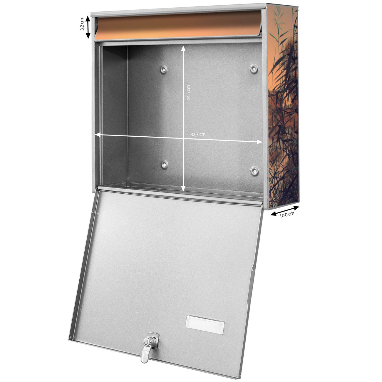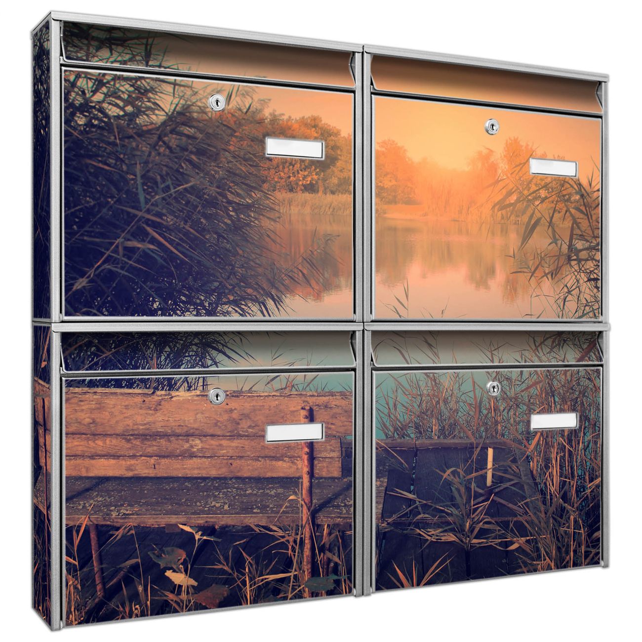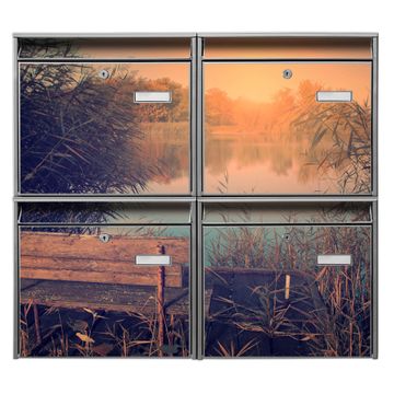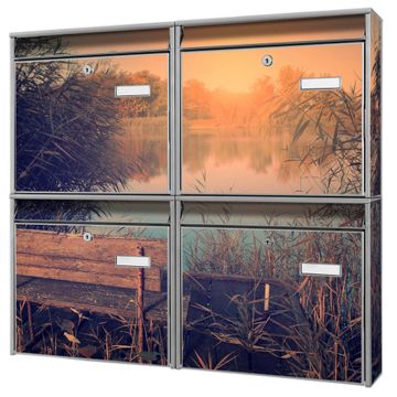 FUNKTION: Die Burg-Wächter Briefkastenanlage mit Motiv Bank Am See bietet Ihnen ausreichend Fassungsvermögen um auch A4 und C4 Sendungen zu empfangen. Das integrierte Namensschild lässt sich individuell beschriften. Wählen Sie aus den Grundfarben weiß, silber und schwarz. DESIGN: Die 4 Briefkästen haben ein ansprechendes und zeitloses Design, ohne dabei auf Funktionalität zu verzichten. Das Material ist sehr stabil, wetterfest und rostfrei. Durch das Motiv Bank Am See werden die Postkästen zu einem Blickfang. DETAILS: Die Postkästen bestehen aus verzinktem Stahl der zusätzlich mit Klarlack versiegelt wurde. Die Kästen sind gesamt 64,5cm hoch, 72,5cm breit und 10cm tief. Das Motiv besteht aus einer wetter- und UV-festen Folie, die Ihren Briefkasten zusätzlich vor Kratzern schützt. Die Postkästen werden mit Montagematerial, je einem Namensschild und je zwei Schlüsseln geliefert. NUTZEN: Das Briefkastenset eignet sich für die Wandmontage, die Größe bietet genügend Platz für Sendungen aller Art. Das zeitlose Design sowie die stabile Bauart bieten Ihnen einen treuen Begleiter für Ihre Post. BANJADO: