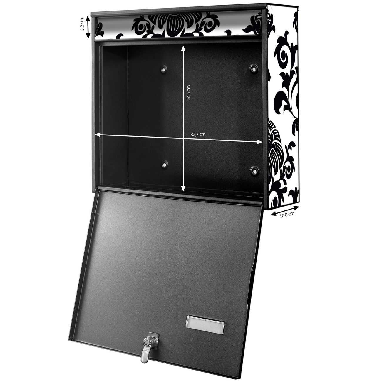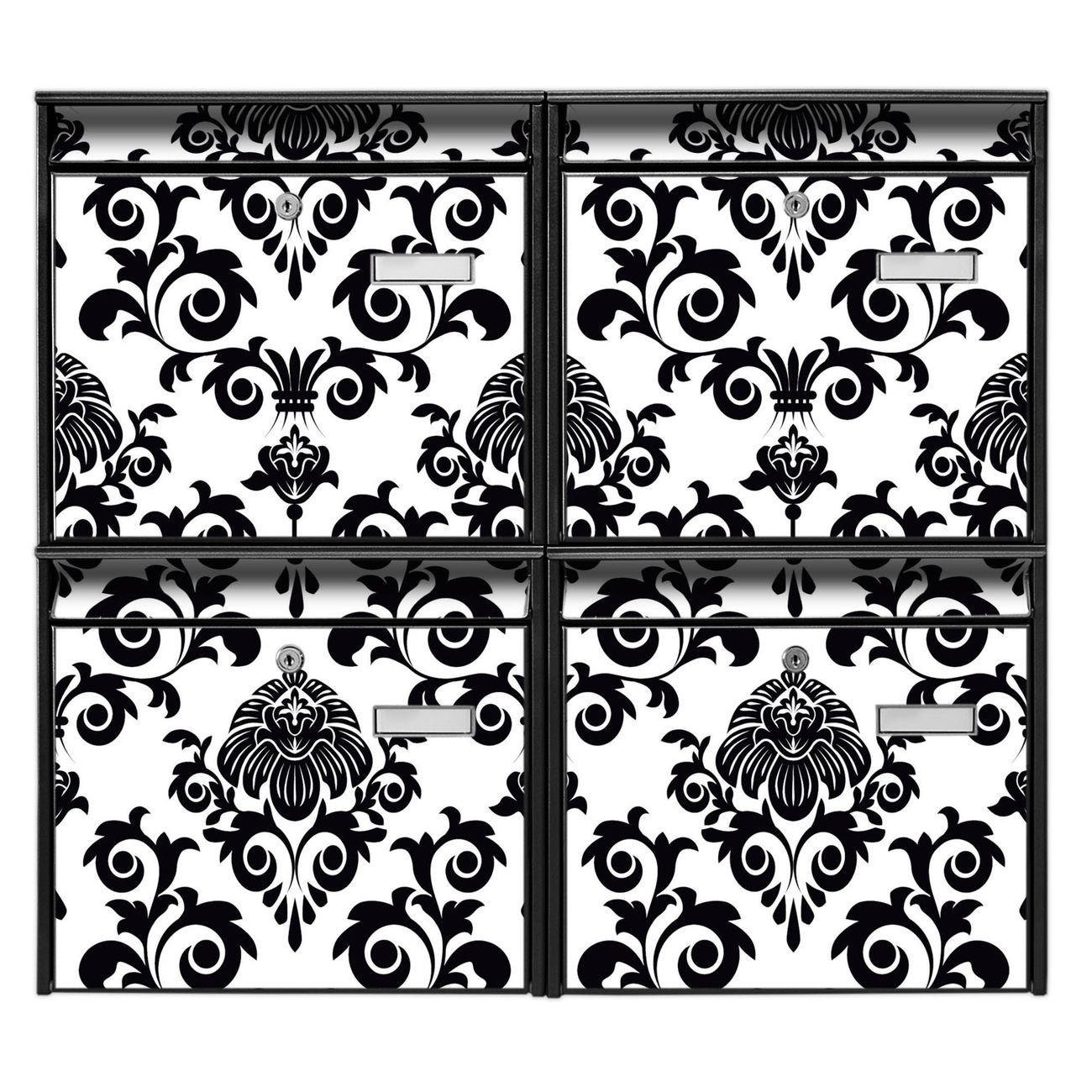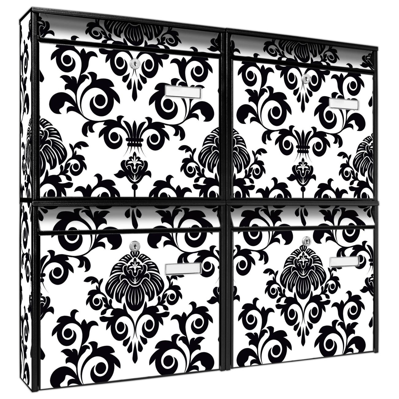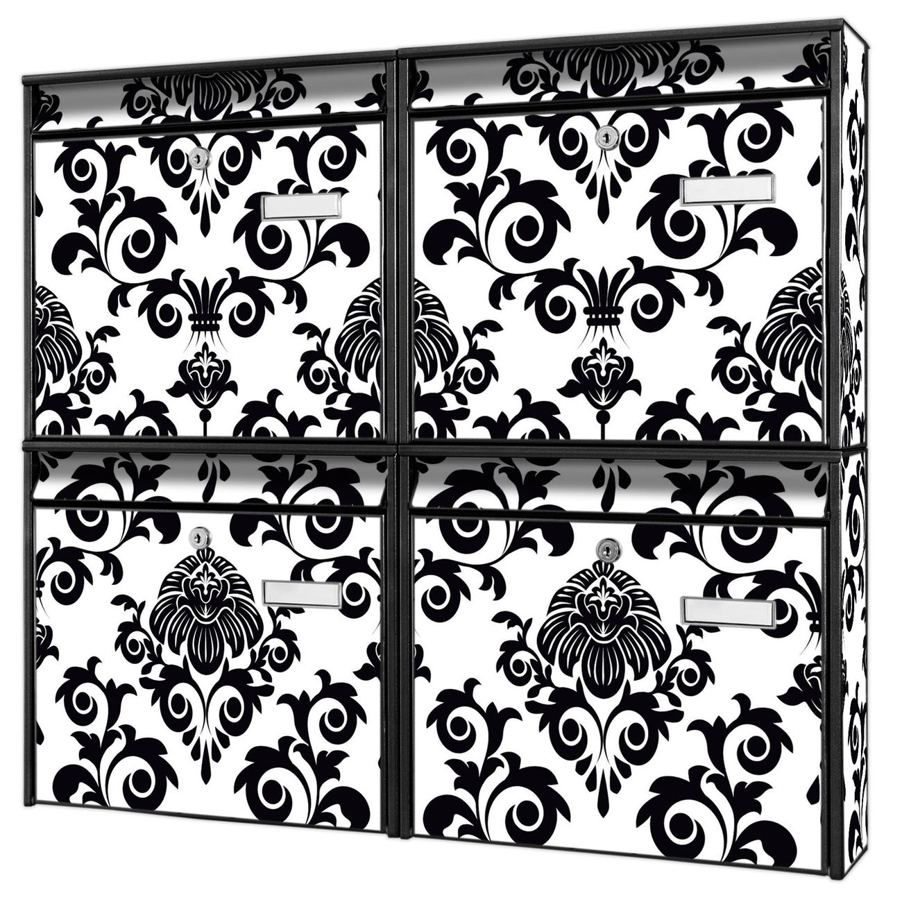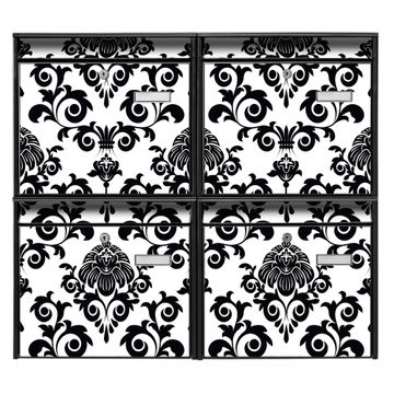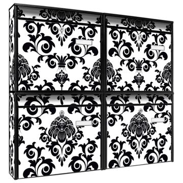FUNKTION: Die Burg-Wächter Briefkastenanlage mit Motiv Barock bietet Ihnen ausreichend Fassungsvermögen um auch A4 und C4 Sendungen zu empfangen. Das integrierte Namensschild lässt sich individuell beschriften. Wählen Sie aus den Grundfarben weiß, silber und schwarz. DESIGN: Die 4 Briefkästen haben ein ansprechendes und zeitloses Design, ohne dabei auf Funktionalität zu verzichten. Das Material ist sehr stabil, wetterfest und rostfrei. Durch das Motiv Barock werden die Postkästen zu einem Blickfang. DETAILS: Die Postkästen bestehen aus verzinktem Stahl der zusätzlich mit Klarlack versiegelt wurde. Die Kästen sind gesamt 64,5cm hoch, 72,5cm breit und 10cm tief. Das Motiv besteht aus einer wetter- und UV-festen Folie, die Ihren Briefkasten zusätzlich vor Kratzern schützt. Die Postkästen werden mit Montagematerial, je einem Namensschild und je zwei Schlüsseln geliefert. NUTZEN: Das Briefkastenset eignet sich für die Wandmontage, die Größe bietet genügend Platz für Sendungen aller Art. Das zeitlose Design sowie die stabile Bauart bieten Ihnen einen treuen Begleiter für Ihre Post. BANJADO: