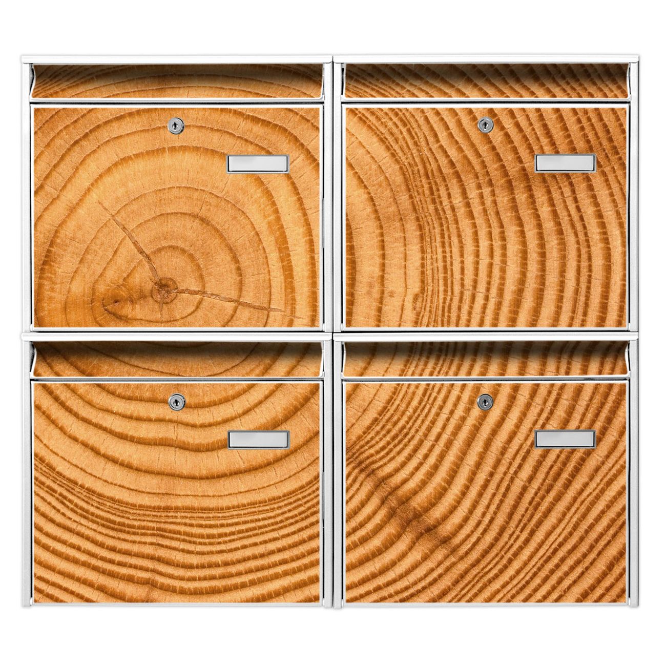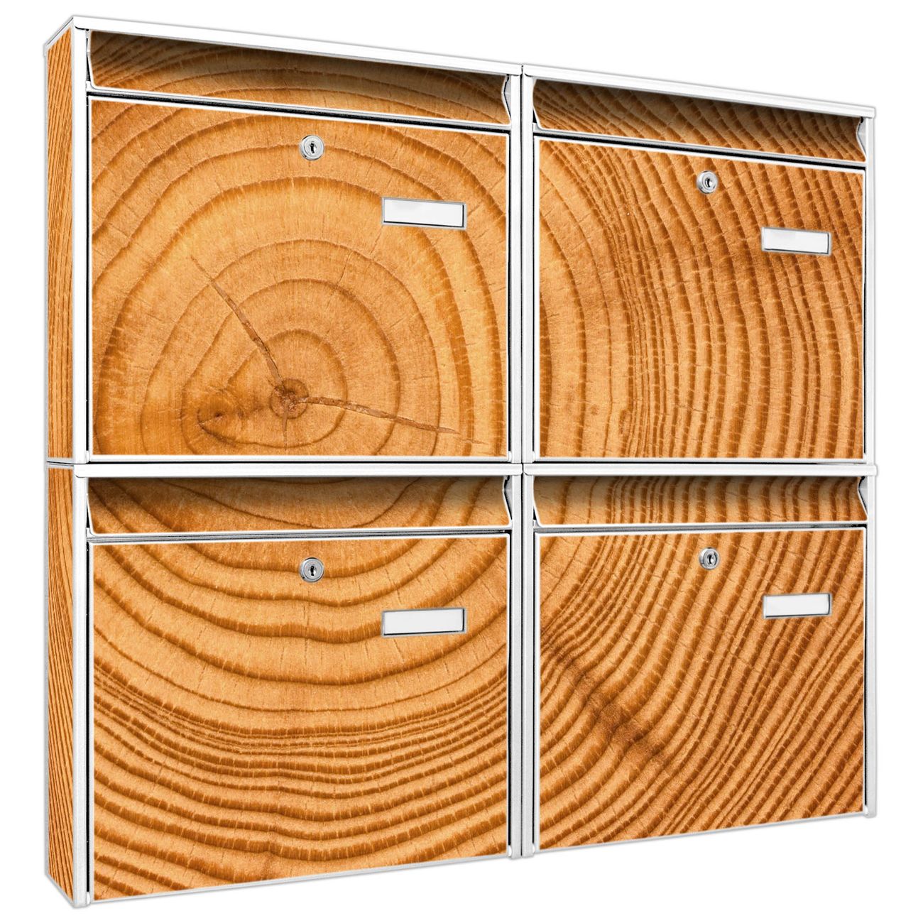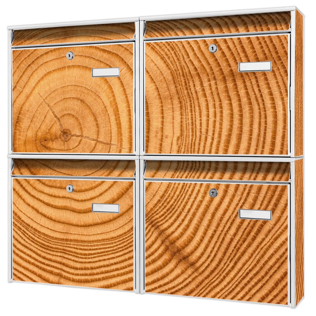 FUNKTION: Die Burg-Wächter Briefkastenanlage mit Motiv Baumstamm bietet Ihnen ausreichend Fassungsvermögen um auch A4 und C4 Sendungen zu empfangen. Das integrierte Namensschild lässt sich individuell beschriften. Wählen Sie aus den Grundfarben weiß, silber und schwarz. DESIGN: Die 4 Briefkästen haben ein ansprechendes und zeitloses Design, ohne dabei auf Funktionalität zu verzichten. Das Material ist sehr stabil, wetterfest und rostfrei. Durch das Motiv Baumstamm werden die Postkästen zu einem Blickfang. DETAILS: Die Postkästen bestehen aus verzinktem Stahl der zusätzlich mit Klarlack versiegelt wurde. Die Kästen sind gesamt 64,5cm hoch, 72,5cm breit und 10cm tief. Das Motiv besteht aus einer wetter- und UV-festen Folie, die Ihren Briefkasten zusätzlich vor Kratzern schützt. Die Postkästen werden mit Montagematerial, je einem Namensschild und je zwei Schlüsseln geliefert. NUTZEN: Das Briefkastenset eignet sich für die Wandmontage, die Größe bietet genügend Platz für Sendungen aller Art. Das zeitlose Design sowie die stabile Bauart bieten Ihnen einen treuen Begleiter für Ihre Post. BANJADO: