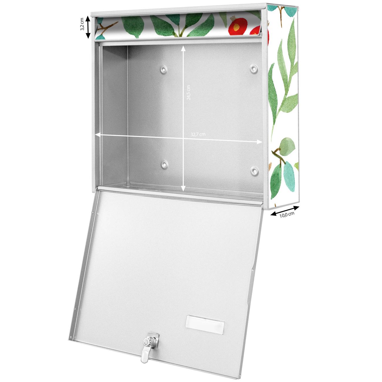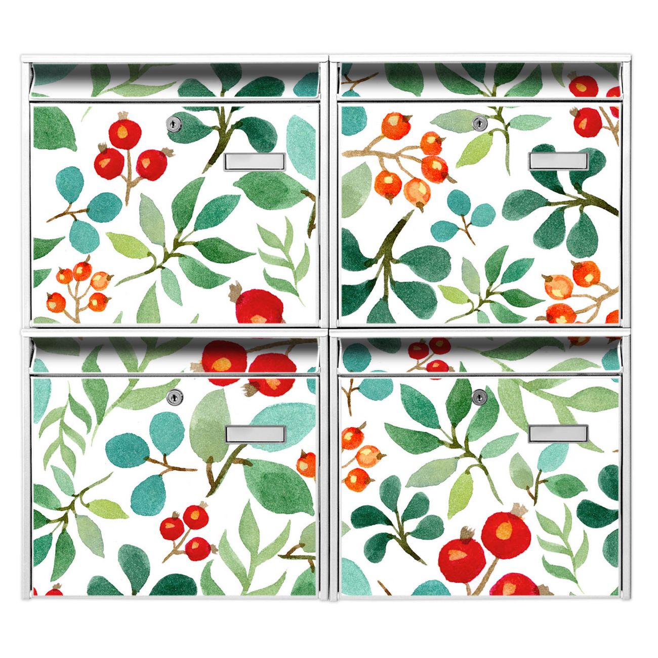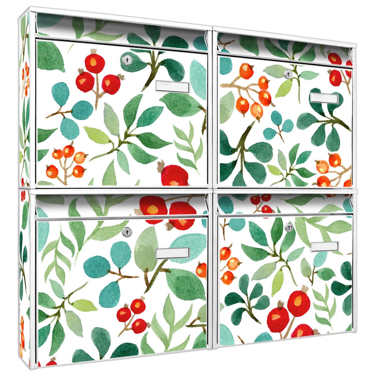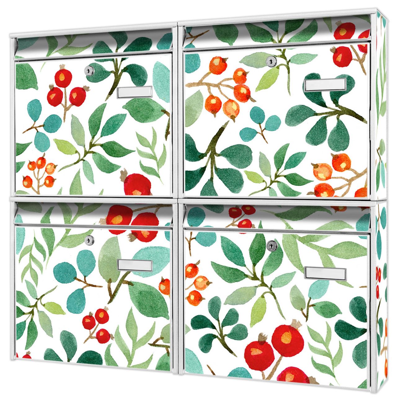 FUNKTION: Die Burg-Wächter Briefkastenanlage mit Motiv Beeren und Blätter bietet Ihnen ausreichend Fassungsvermögen um auch A4 und C4 Sendungen zu empfangen. Das integrierte Namensschild lässt sich individuell beschriften. Wählen Sie aus den Grundfarben weiß, silber und schwarz. DESIGN: Die 4 Briefkästen haben ein ansprechendes und zeitloses Design, ohne dabei auf Funktionalität zu verzichten. Das Material ist sehr stabil, wetterfest und rostfrei. Durch das Motiv Beeren und Blätter werden die Postkästen zu einem Blickfang. DETAILS: Die Postkästen bestehen aus verzinktem Stahl der zusätzlich mit Klarlack versiegelt wurde. Die Kästen sind gesamt 64,5cm hoch, 72,5cm breit und 10cm tief. Das Motiv besteht aus einer wetter- und UV-festen Folie, die Ihren Briefkasten zusätzlich vor Kratzern schützt. Die Postkästen werden mit Montagematerial, je einem Namensschild und je zwei Schlüsseln geliefert. NUTZEN: Das Briefkastenset eignet sich für die Wandmontage, die Größe bietet genügend Platz für Sendungen aller Art. Das zeitlose Design sowie die stabile Bauart bieten Ihnen einen treuen Begleiter für Ihre Post. BANJADO: