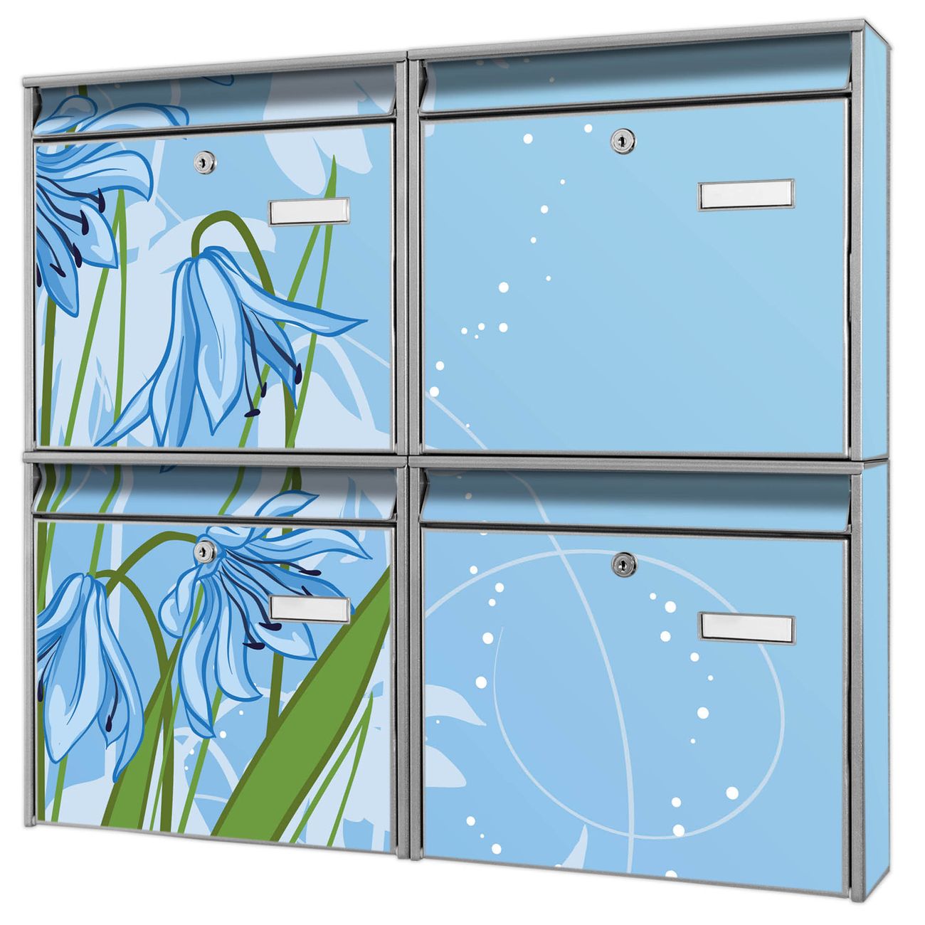 FUNKTION: Die Burg-Wächter Briefkastenanlage mit Motiv Bergblaulilie bietet Ihnen ausreichend Fassungsvermögen um auch A4 und C4 Sendungen zu empfangen. Das integrierte Namensschild lässt sich individuell beschriften. Wählen Sie aus den Grundfarben weiß, silber und schwarz. DESIGN: Die 4 Briefkästen haben ein ansprechendes und zeitloses Design, ohne dabei auf Funktionalität zu verzichten. Das Material ist sehr stabil, wetterfest und rostfrei. Durch das Motiv Bergblaulilie werden die Postkästen zu einem Blickfang. DETAILS: Die Postkästen bestehen aus verzinktem Stahl der zusätzlich mit Klarlack versiegelt wurde. Die Kästen sind gesamt 64,5cm hoch, 72,5cm breit und 10cm tief. Das Motiv besteht aus einer wetter- und UV-festen Folie, die Ihren Briefkasten zusätzlich vor Kratzern schützt. Die Postkästen werden mit Montagematerial, je einem Namensschild und je zwei Schlüsseln geliefert. NUTZEN: Das Briefkastenset eignet sich für die Wandmontage, die Größe bietet genügend Platz für Sendungen aller Art. Das zeitlose Design sowie die stabile Bauart bieten Ihnen einen treuen Begleiter für Ihre Post. BANJADO:
