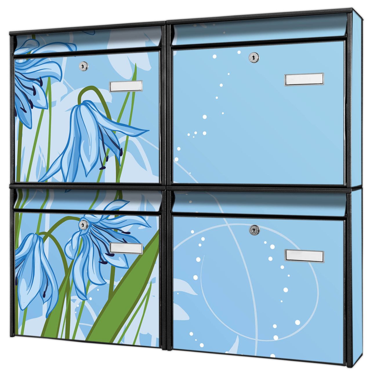FUNKTION: Die Burg-Wächter Briefkastenanlage mit Motiv Bergblaulilie bietet Ihnen ausreichend Fassungsvermögen um auch A4 und C4 Sendungen zu empfangen. Das integrierte Namensschild lässt sich individuell beschriften. Wählen Sie aus den Grundfarben weiß, silber und schwarz. DESIGN: Die 4 Briefkästen haben ein ansprechendes und zeitloses Design, ohne dabei auf Funktionalität zu verzichten. Das Material ist sehr stabil, wetterfest und rostfrei. Durch das Motiv Bergblaulilie werden die Postkästen zu einem Blickfang. DETAILS: Die Postkästen bestehen aus verzinktem Stahl der zusätzlich mit Klarlack versiegelt wurde. Die Kästen sind gesamt 64,5cm hoch, 72,5cm breit und 10cm tief. Das Motiv besteht aus einer wetter- und UV-festen Folie, die Ihren Briefkasten zusätzlich vor Kratzern schützt. Die Postkästen werden mit Montagematerial, je einem Namensschild und je zwei Schlüsseln geliefert. NUTZEN: Das Briefkastenset eignet sich für die Wandmontage, die Größe bietet genügend Platz für Sendungen aller Art. Das zeitlose Design sowie die stabile Bauart bieten Ihnen einen treuen Begleiter für Ihre Post. BANJADO: