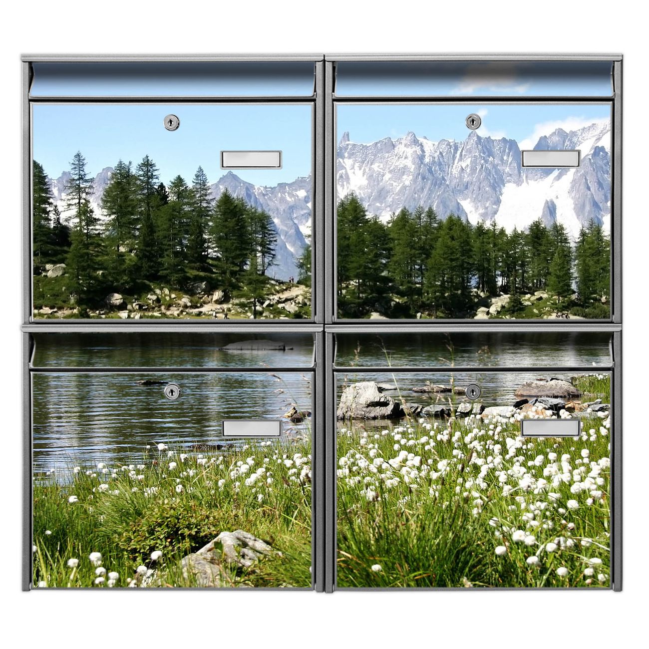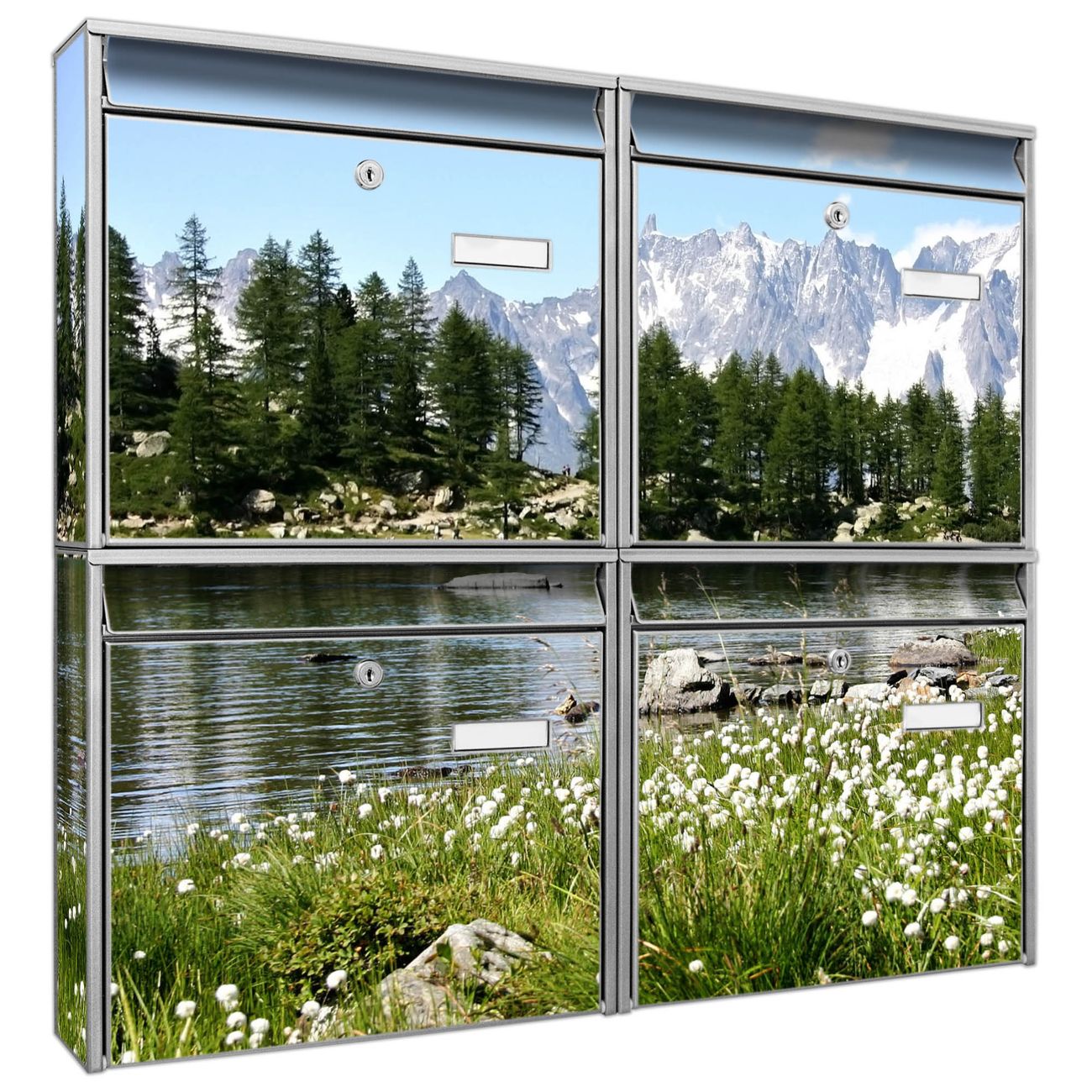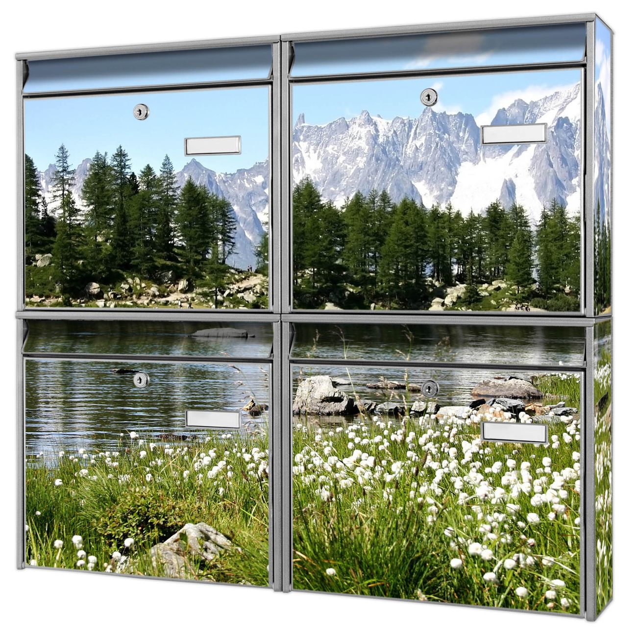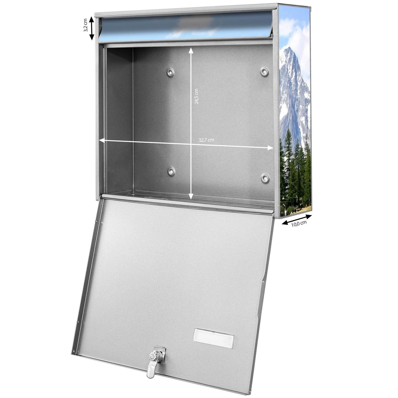 FUNKTION: Die Burg-Wächter Briefkastenanlage mit Motiv Bergidylle bietet Ihnen ausreichend Fassungsvermögen um auch A4 und C4 Sendungen zu empfangen. Das integrierte Namensschild lässt sich individuell beschriften. Wählen Sie aus den Grundfarben weiß, silber und schwarz. DESIGN: Die 4 Briefkästen haben ein ansprechendes und zeitloses Design, ohne dabei auf Funktionalität zu verzichten. Das Material ist sehr stabil, wetterfest und rostfrei. Durch das Motiv Bergidylle werden die Postkästen zu einem Blickfang. DETAILS: Die Postkästen bestehen aus verzinktem Stahl der zusätzlich mit Klarlack versiegelt wurde. Die Kästen sind gesamt 64,5cm hoch, 72,5cm breit und 10cm tief. Das Motiv besteht aus einer wetter- und UV-festen Folie, die Ihren Briefkasten zusätzlich vor Kratzern schützt. Die Postkästen werden mit Montagematerial, je einem Namensschild und je zwei Schlüsseln geliefert. NUTZEN: Das Briefkastenset eignet sich für die Wandmontage, die Größe bietet genügend Platz für Sendungen aller Art. Das zeitlose Design sowie die stabile Bauart bieten Ihnen einen treuen Begleiter für Ihre Post. BANJADO: