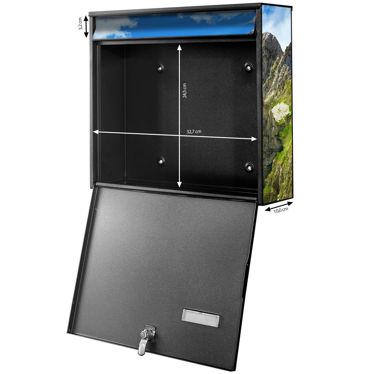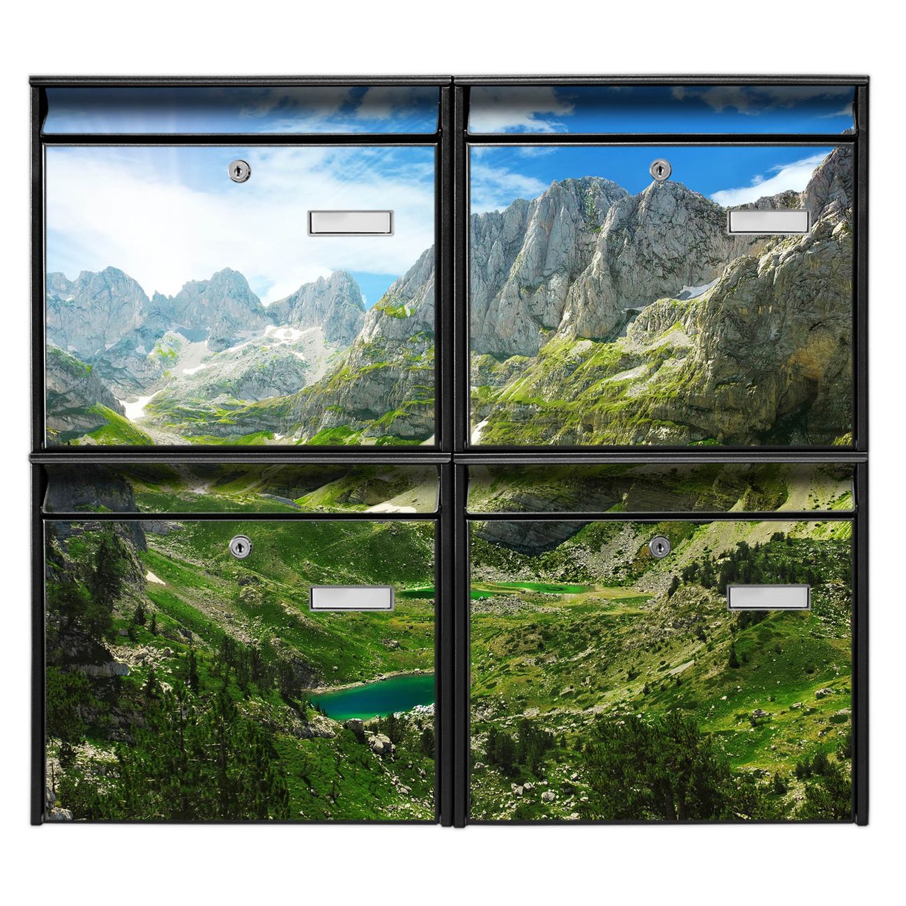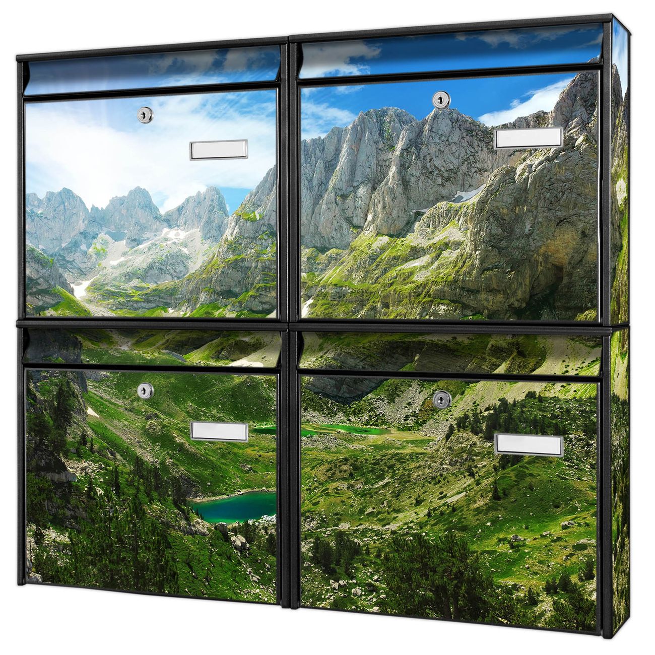 FUNKTION: Die Burg-Wächter Briefkastenanlage mit Motiv Bergsee Alpen bietet Ihnen ausreichend Fassungsvermögen um auch A4 und C4 Sendungen zu empfangen. Das integrierte Namensschild lässt sich individuell beschriften. Wählen Sie aus den Grundfarben weiß, silber und schwarz. DESIGN: Die 4 Briefkästen haben ein ansprechendes und zeitloses Design, ohne dabei auf Funktionalität zu verzichten. Das Material ist sehr stabil, wetterfest und rostfrei. Durch das Motiv Bergsee Alpen werden die Postkästen zu einem Blickfang. DETAILS: Die Postkästen bestehen aus verzinktem Stahl der zusätzlich mit Klarlack versiegelt wurde. Die Kästen sind gesamt 64,5cm hoch, 72,5cm breit und 10cm tief. Das Motiv besteht aus einer wetter- und UV-festen Folie, die Ihren Briefkasten zusätzlich vor Kratzern schützt. Die Postkästen werden mit Montagematerial, je einem Namensschild und je zwei Schlüsseln geliefert. NUTZEN: Das Briefkastenset eignet sich für die Wandmontage, die Größe bietet genügend Platz für Sendungen aller Art. Das zeitlose Design sowie die stabile Bauart bieten Ihnen einen treuen Begleiter für Ihre Post. BANJADO: