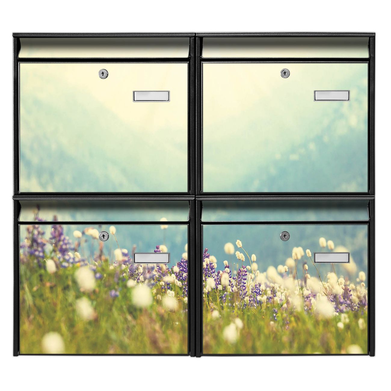 FUNKTION: Die Burg-Wächter Briefkastenanlage mit Motiv Bergwiese bietet Ihnen ausreichend Fassungsvermögen um auch A4 und C4 Sendungen zu empfangen. Das integrierte Namensschild lässt sich individuell beschriften. Wählen Sie aus den Grundfarben weiß, silber und schwarz. DESIGN: Die 4 Briefkästen haben ein ansprechendes und zeitloses Design, ohne dabei auf Funktionalität zu verzichten. Das Material ist sehr stabil, wetterfest und rostfrei. Durch das Motiv Bergwiese werden die Postkästen zu einem Blickfang. DETAILS: Die Postkästen bestehen aus verzinktem Stahl der zusätzlich mit Klarlack versiegelt wurde. Die Kästen sind gesamt 64,5cm hoch, 72,5cm breit und 10cm tief. Das Motiv besteht aus einer wetter- und UV-festen Folie, die Ihren Briefkasten zusätzlich vor Kratzern schützt. Die Postkästen werden mit Montagematerial, je einem Namensschild und je zwei Schlüsseln geliefert. NUTZEN: Das Briefkastenset eignet sich für die Wandmontage, die Größe bietet genügend Platz für Sendungen aller Art. Das zeitlose Design sowie die stabile Bauart bieten Ihnen einen treuen Begleiter für Ihre Post. BANJADO: