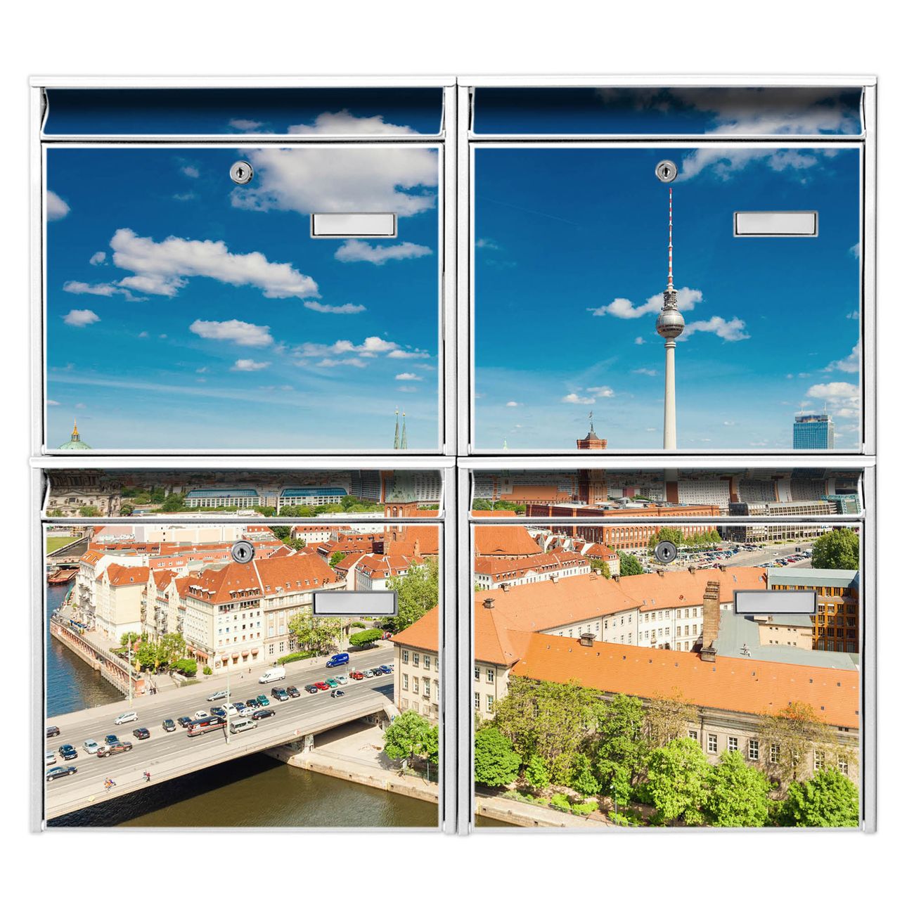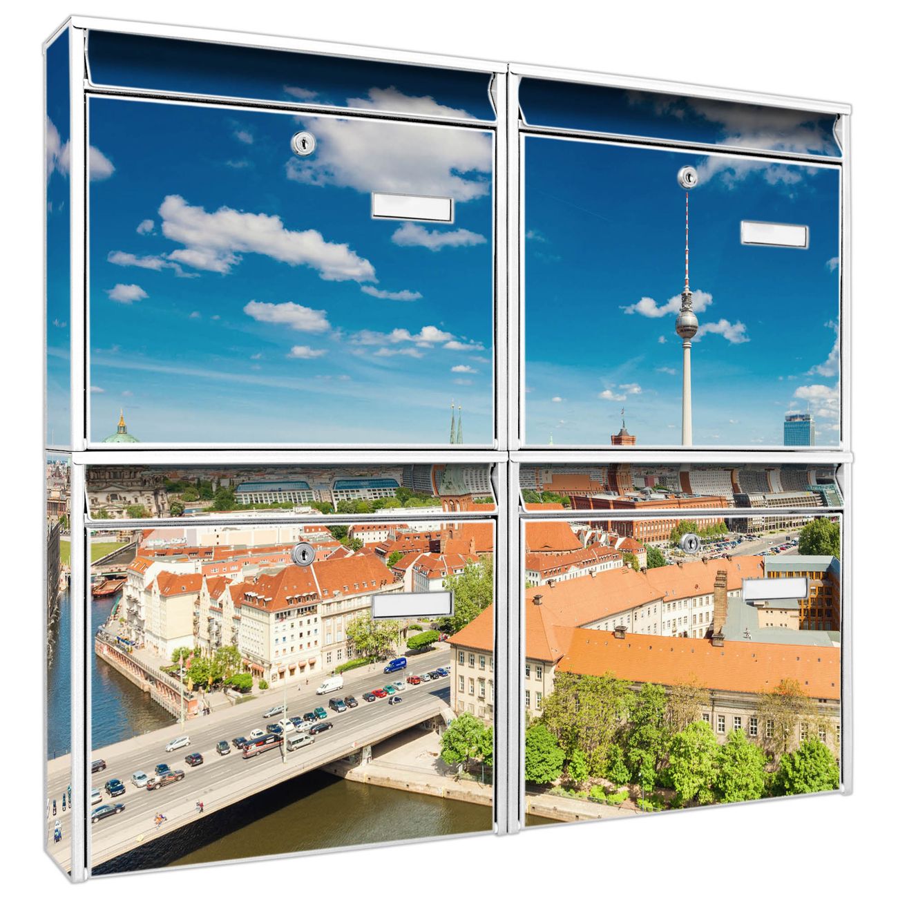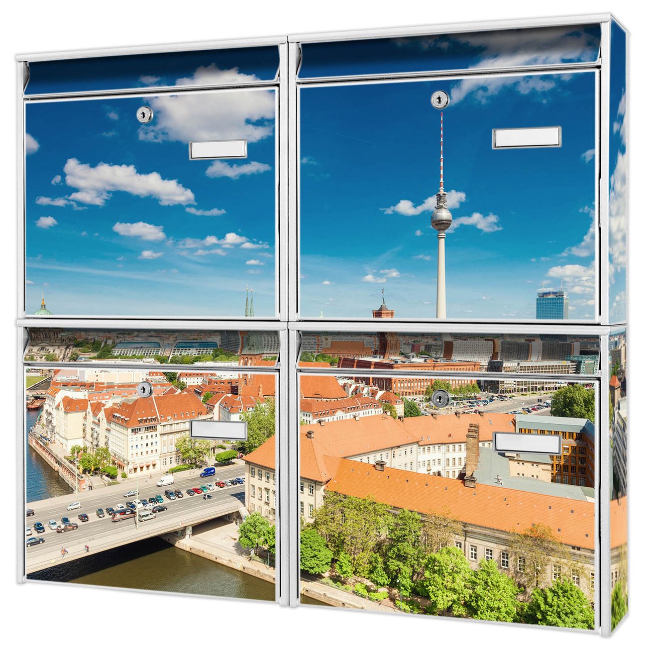 FUNKTION: Die Burg-Wächter Briefkastenanlage mit Motiv Berlin Mitte bietet Ihnen ausreichend Fassungsvermögen um auch A4 und C4 Sendungen zu empfangen. Das integrierte Namensschild lässt sich individuell beschriften. Wählen Sie aus den Grundfarben weiß, silber und schwarz. DESIGN: Die 4 Briefkästen haben ein ansprechendes und zeitloses Design, ohne dabei auf Funktionalität zu verzichten. Das Material ist sehr stabil, wetterfest und rostfrei. Durch das Motiv Berlin Mitte werden die Postkästen zu einem Blickfang. DETAILS: Die Postkästen bestehen aus verzinktem Stahl der zusätzlich mit Klarlack versiegelt wurde. Die Kästen sind gesamt 64,5cm hoch, 72,5cm breit und 10cm tief. Das Motiv besteht aus einer wetter- und UV-festen Folie, die Ihren Briefkasten zusätzlich vor Kratzern schützt. Die Postkästen werden mit Montagematerial, je einem Namensschild und je zwei Schlüsseln geliefert. NUTZEN: Das Briefkastenset eignet sich für die Wandmontage, die Größe bietet genügend Platz für Sendungen aller Art. Das zeitlose Design sowie die stabile Bauart bieten Ihnen einen treuen Begleiter für Ihre Post. BANJADO: