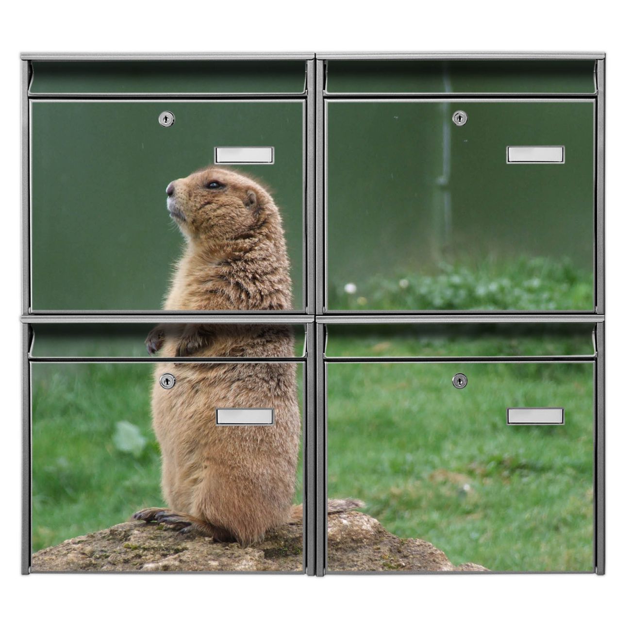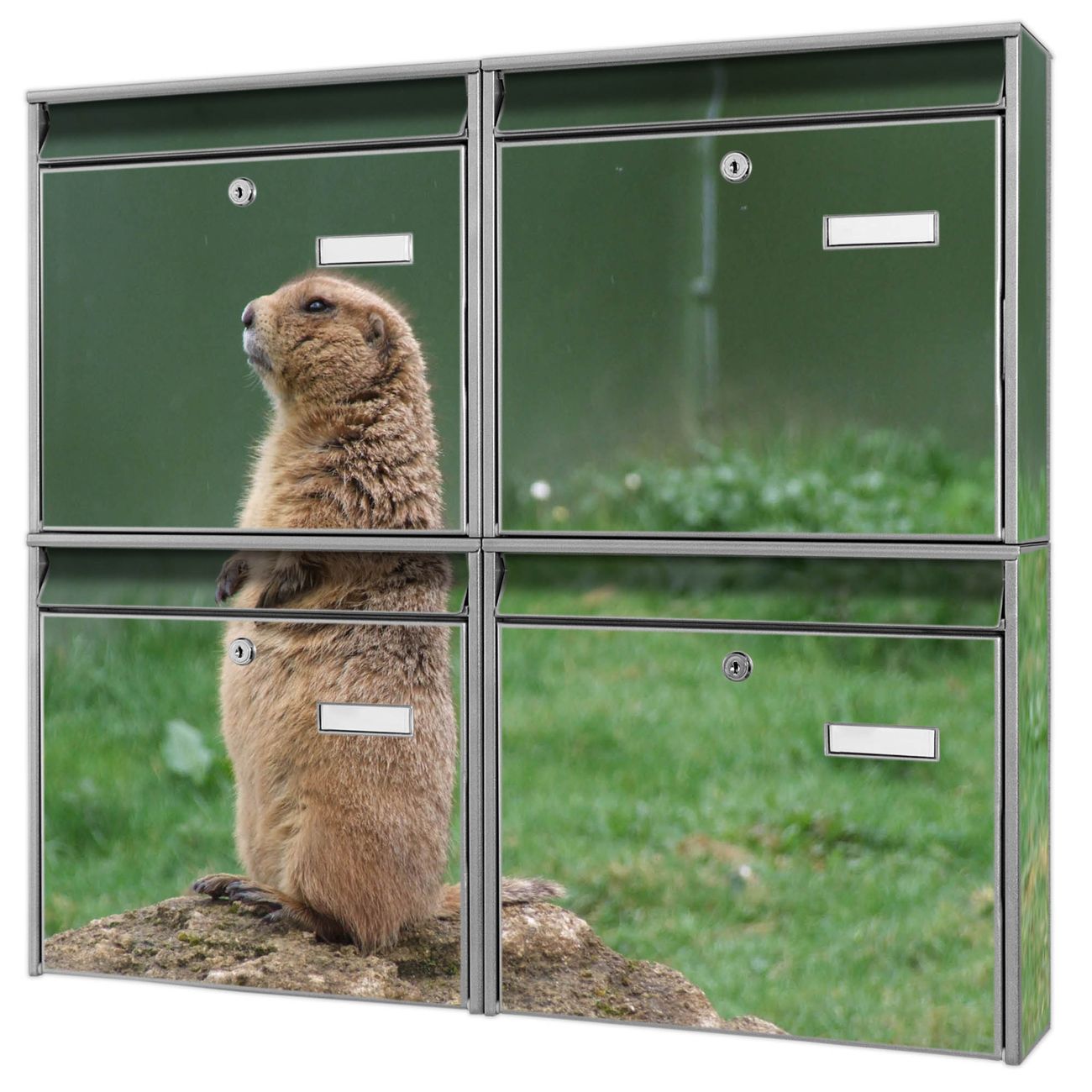 FUNKTION: Die Burg-Wächter Briefkastenanlage mit Motiv Biber bietet Ihnen ausreichend Fassungsvermögen um auch A4 und C4 Sendungen zu empfangen. Das integrierte Namensschild lässt sich individuell beschriften. Wählen Sie aus den Grundfarben weiß, silber und schwarz. DESIGN: Die 4 Briefkästen haben ein ansprechendes und zeitloses Design, ohne dabei auf Funktionalität zu verzichten. Das Material ist sehr stabil, wetterfest und rostfrei. Durch das Motiv Biber werden die Postkästen zu einem Blickfang. DETAILS: Die Postkästen bestehen aus verzinktem Stahl der zusätzlich mit Klarlack versiegelt wurde. Die Kästen sind gesamt 64,5cm hoch, 72,5cm breit und 10cm tief. Das Motiv besteht aus einer wetter- und UV-festen Folie, die Ihren Briefkasten zusätzlich vor Kratzern schützt. Die Postkästen werden mit Montagematerial, je einem Namensschild und je zwei Schlüsseln geliefert. NUTZEN: Das Briefkastenset eignet sich für die Wandmontage, die Größe bietet genügend Platz für Sendungen aller Art. Das zeitlose Design sowie die stabile Bauart bieten Ihnen einen treuen Begleiter für Ihre Post. BANJADO: