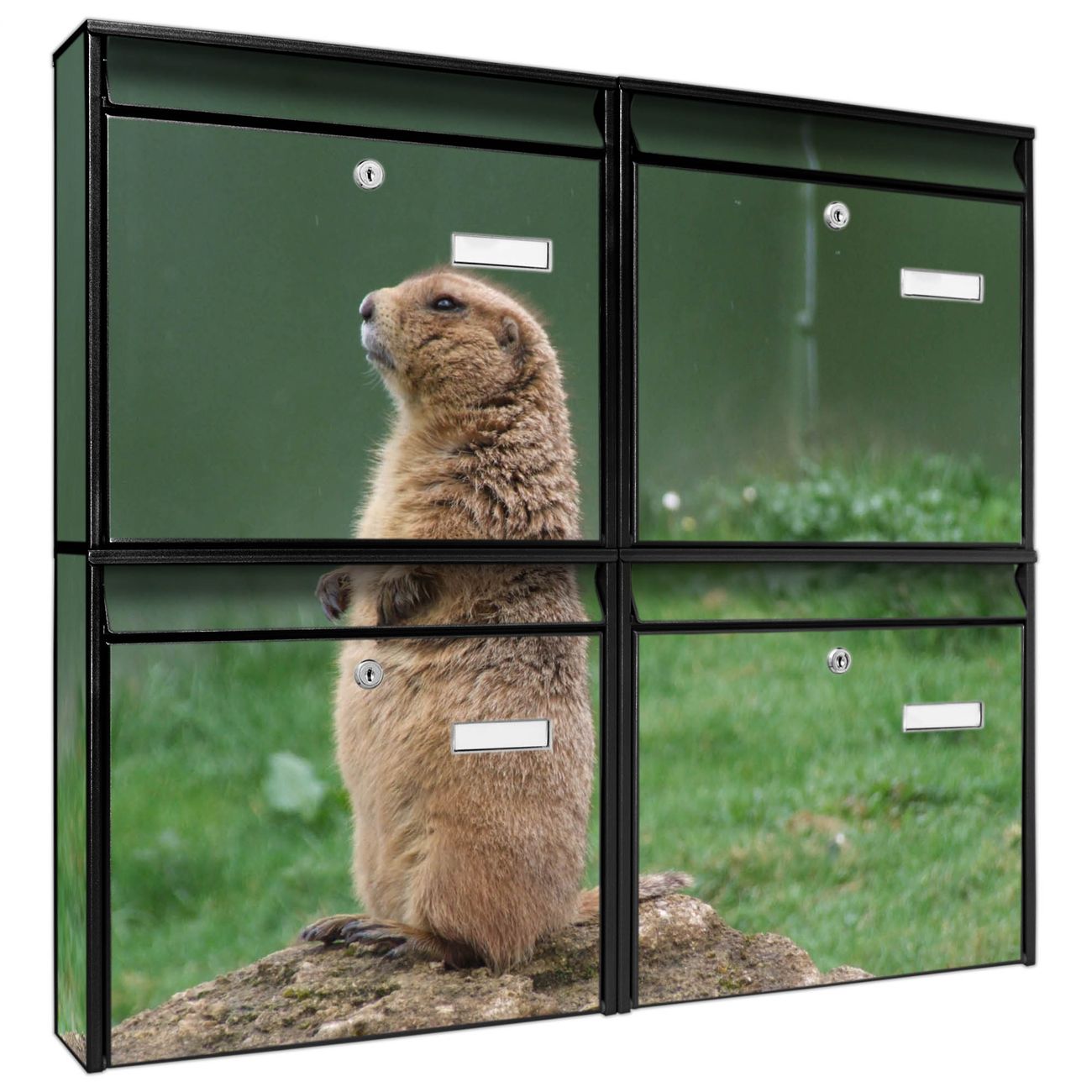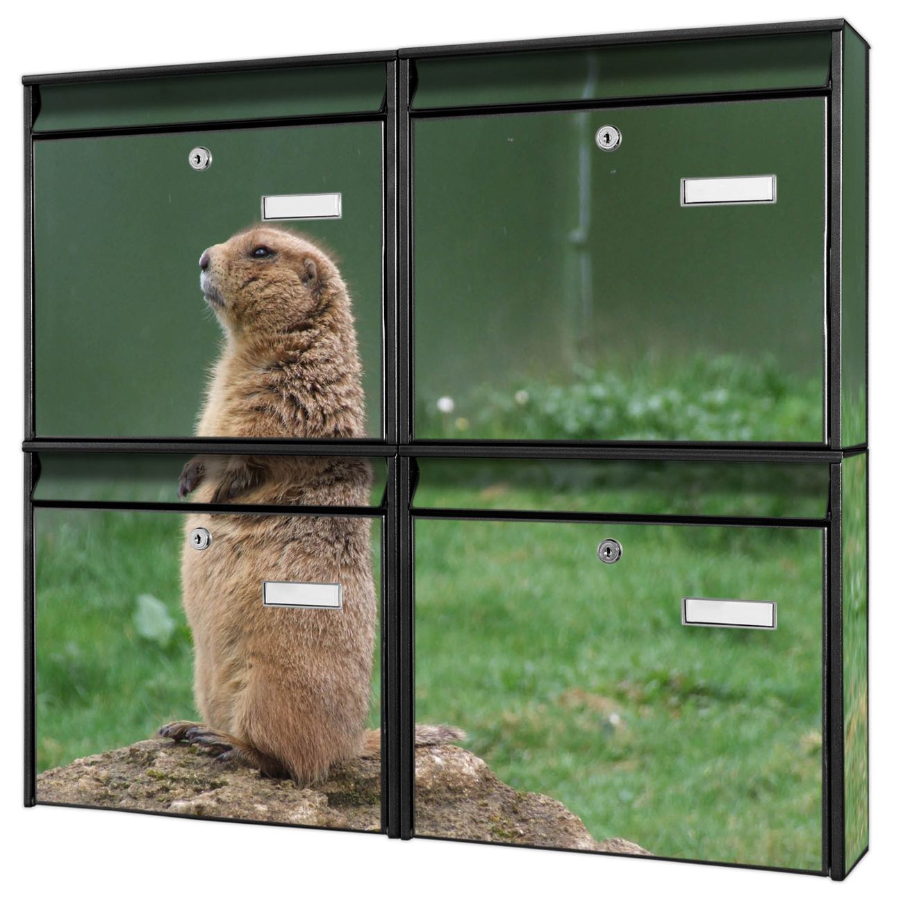 FUNKTION: Die Burg-Wächter Briefkastenanlage mit Motiv Biber bietet Ihnen ausreichend Fassungsvermögen um auch A4 und C4 Sendungen zu empfangen. Das integrierte Namensschild lässt sich individuell beschriften. Wählen Sie aus den Grundfarben weiß, silber und schwarz. DESIGN: Die 4 Briefkästen haben ein ansprechendes und zeitloses Design, ohne dabei auf Funktionalität zu verzichten. Das Material ist sehr stabil, wetterfest und rostfrei. Durch das Motiv Biber werden die Postkästen zu einem Blickfang. DETAILS: Die Postkästen bestehen aus verzinktem Stahl der zusätzlich mit Klarlack versiegelt wurde. Die Kästen sind gesamt 64,5cm hoch, 72,5cm breit und 10cm tief. Das Motiv besteht aus einer wetter- und UV-festen Folie, die Ihren Briefkasten zusätzlich vor Kratzern schützt. Die Postkästen werden mit Montagematerial, je einem Namensschild und je zwei Schlüsseln geliefert. NUTZEN: Das Briefkastenset eignet sich für die Wandmontage, die Größe bietet genügend Platz für Sendungen aller Art. Das zeitlose Design sowie die stabile Bauart bieten Ihnen einen treuen Begleiter für Ihre Post. BANJADO: