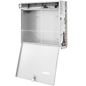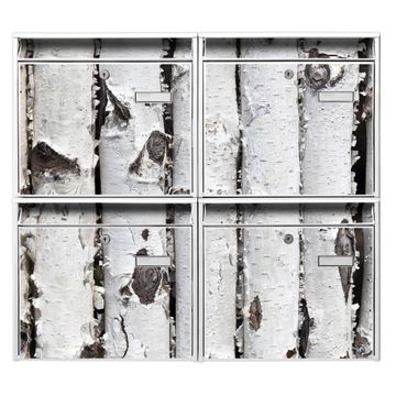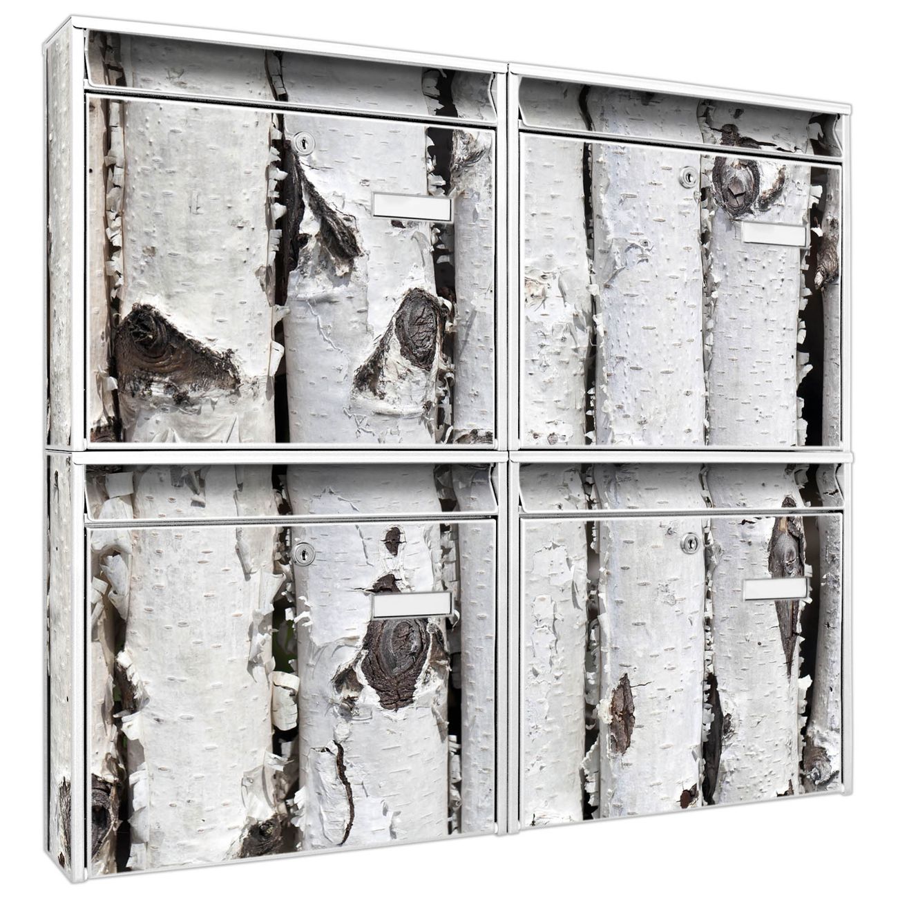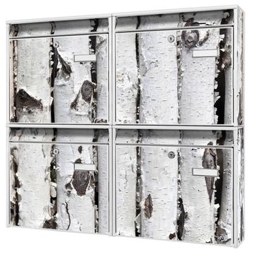 FUNKTION: Die Burg-Wächter Briefkastenanlage mit Motiv Birkenrinde bietet Ihnen ausreichend Fassungsvermögen um auch A4 und C4 Sendungen zu empfangen. Das integrierte Namensschild lässt sich individuell beschriften. Wählen Sie aus den Grundfarben weiß, silber und schwarz. DESIGN: Die 4 Briefkästen haben ein ansprechendes und zeitloses Design, ohne dabei auf Funktionalität zu verzichten. Das Material ist sehr stabil, wetterfest und rostfrei. Durch das Motiv Birkenrinde werden die Postkästen zu einem Blickfang. DETAILS: Die Postkästen bestehen aus verzinktem Stahl der zusätzlich mit Klarlack versiegelt wurde. Die Kästen sind gesamt 64,5cm hoch, 72,5cm breit und 10cm tief. Das Motiv besteht aus einer wetter- und UV-festen Folie, die Ihren Briefkasten zusätzlich vor Kratzern schützt. Die Postkästen werden mit Montagematerial, je einem Namensschild und je zwei Schlüsseln geliefert. NUTZEN: Das Briefkastenset eignet sich für die Wandmontage, die Größe bietet genügend Platz für Sendungen aller Art. Das zeitlose Design sowie die stabile Bauart bieten Ihnen einen treuen Begleiter für Ihre Post. BANJADO: