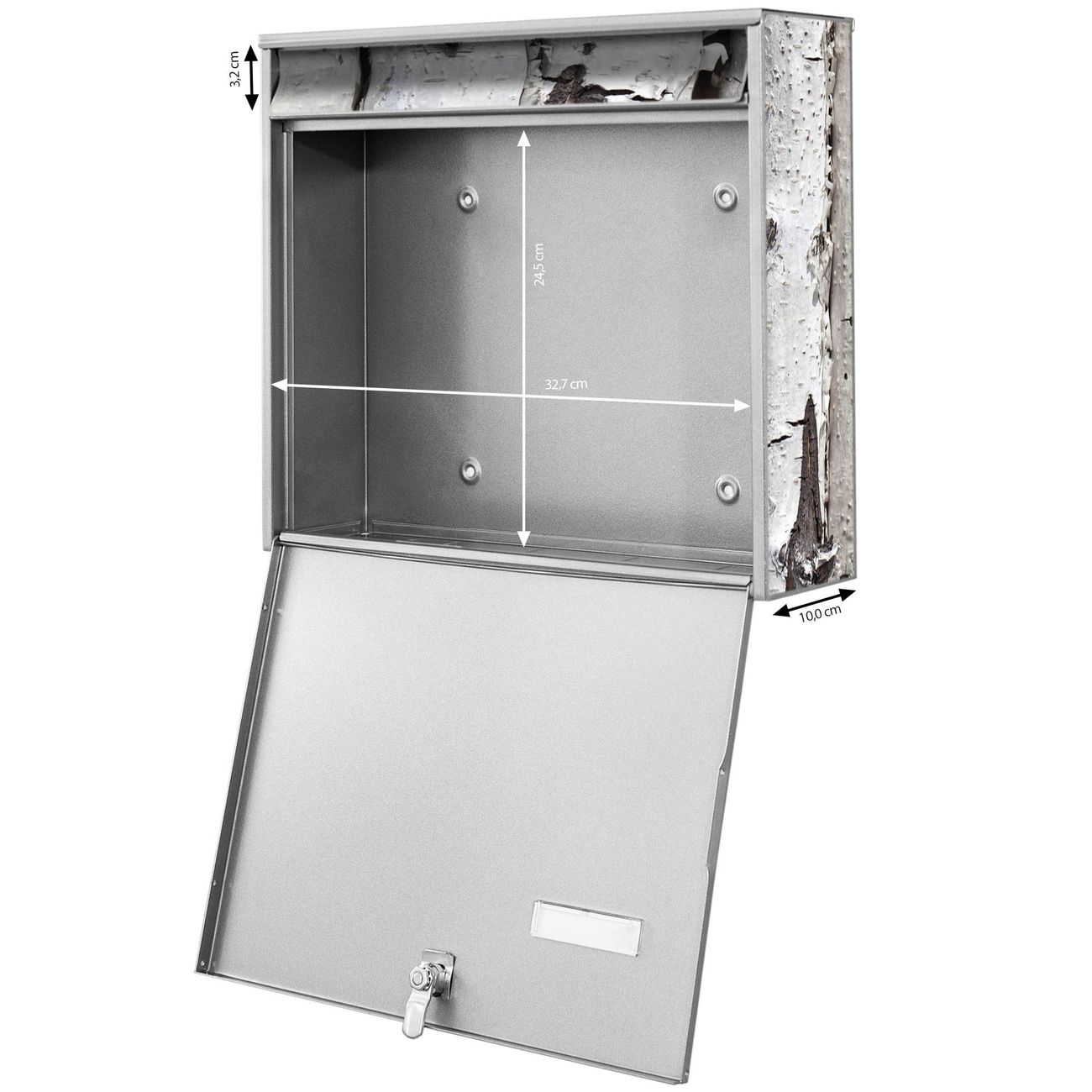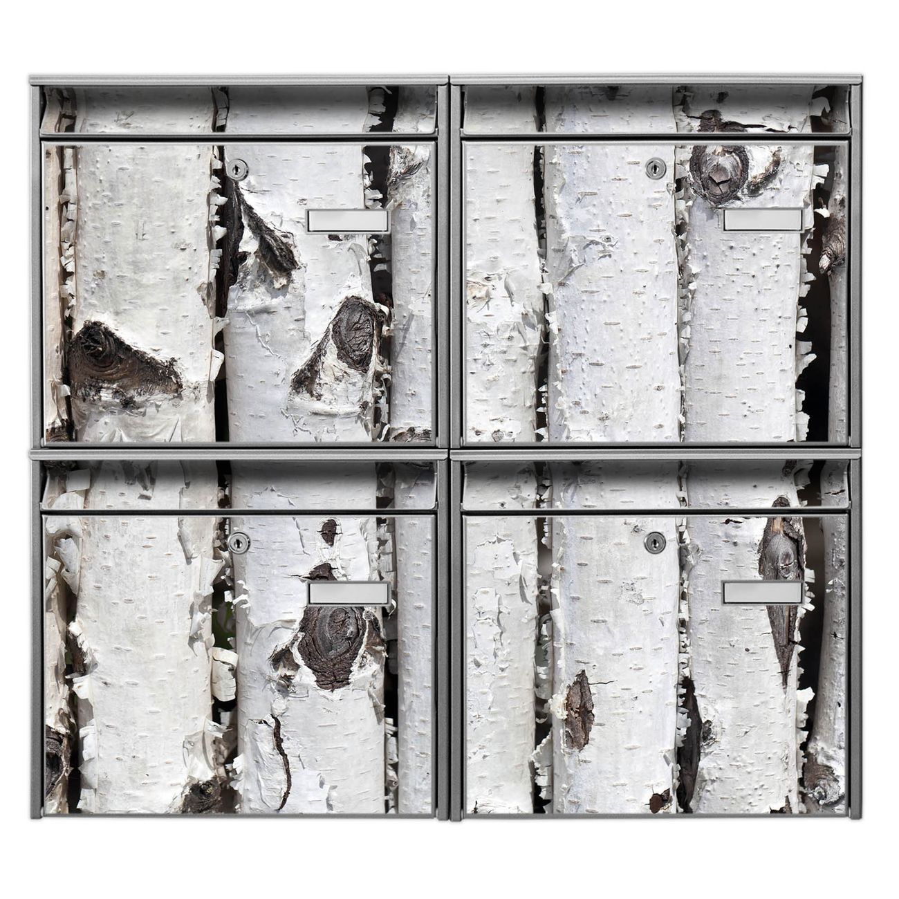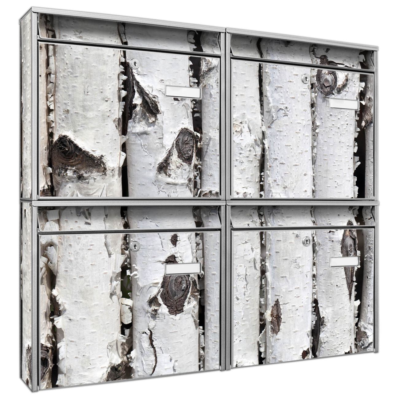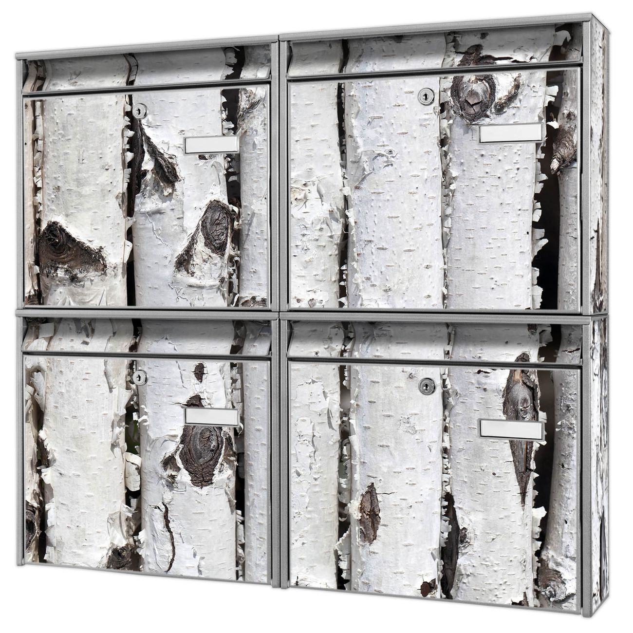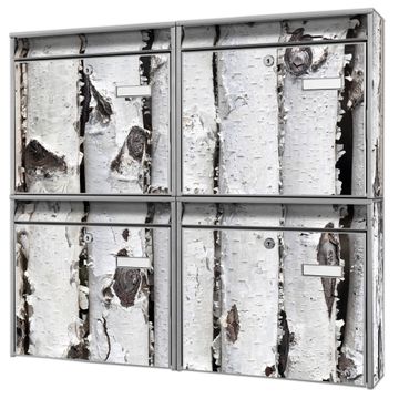 FUNKTION: Die Burg-Wächter Briefkastenanlage mit Motiv Birkenrinde bietet Ihnen ausreichend Fassungsvermögen um auch A4 und C4 Sendungen zu empfangen. Das integrierte Namensschild lässt sich individuell beschriften. Wählen Sie aus den Grundfarben weiß, silber und schwarz. DESIGN: Die 4 Briefkästen haben ein ansprechendes und zeitloses Design, ohne dabei auf Funktionalität zu verzichten. Das Material ist sehr stabil, wetterfest und rostfrei. Durch das Motiv Birkenrinde werden die Postkästen zu einem Blickfang. DETAILS: Die Postkästen bestehen aus verzinktem Stahl der zusätzlich mit Klarlack versiegelt wurde. Die Kästen sind gesamt 64,5cm hoch, 72,5cm breit und 10cm tief. Das Motiv besteht aus einer wetter- und UV-festen Folie, die Ihren Briefkasten zusätzlich vor Kratzern schützt. Die Postkästen werden mit Montagematerial, je einem Namensschild und je zwei Schlüsseln geliefert. NUTZEN: Das Briefkastenset eignet sich für die Wandmontage, die Größe bietet genügend Platz für Sendungen aller Art. Das zeitlose Design sowie die stabile Bauart bieten Ihnen einen treuen Begleiter für Ihre Post. BANJADO:
