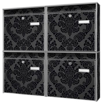 FUNKTION: Die Burg-Wächter Briefkastenanlage mit Motiv Black Deluxe bietet Ihnen ausreichend Fassungsvermögen um auch A4 und C4 Sendungen zu empfangen. Das integrierte Namensschild lässt sich individuell beschriften. Wählen Sie aus den Grundfarben weiß, silber und schwarz. DESIGN: Die 4 Briefkästen haben ein ansprechendes und zeitloses Design, ohne dabei auf Funktionalität zu verzichten. Das Material ist sehr stabil, wetterfest und rostfrei. Durch das Motiv Black Deluxe werden die Postkästen zu einem Blickfang. DETAILS: Die Postkästen bestehen aus verzinktem Stahl der zusätzlich mit Klarlack versiegelt wurde. Die Kästen sind gesamt 64,5cm hoch, 72,5cm breit und 10cm tief. Das Motiv besteht aus einer wetter- und UV-festen Folie, die Ihren Briefkasten zusätzlich vor Kratzern schützt. Die Postkästen werden mit Montagematerial, je einem Namensschild und je zwei Schlüsseln geliefert. NUTZEN: Das Briefkastenset eignet sich für die Wandmontage, die Größe bietet genügend Platz für Sendungen aller Art. Das zeitlose Design sowie die stabile Bauart bieten Ihnen einen treuen Begleiter für Ihre Post. BANJADO: