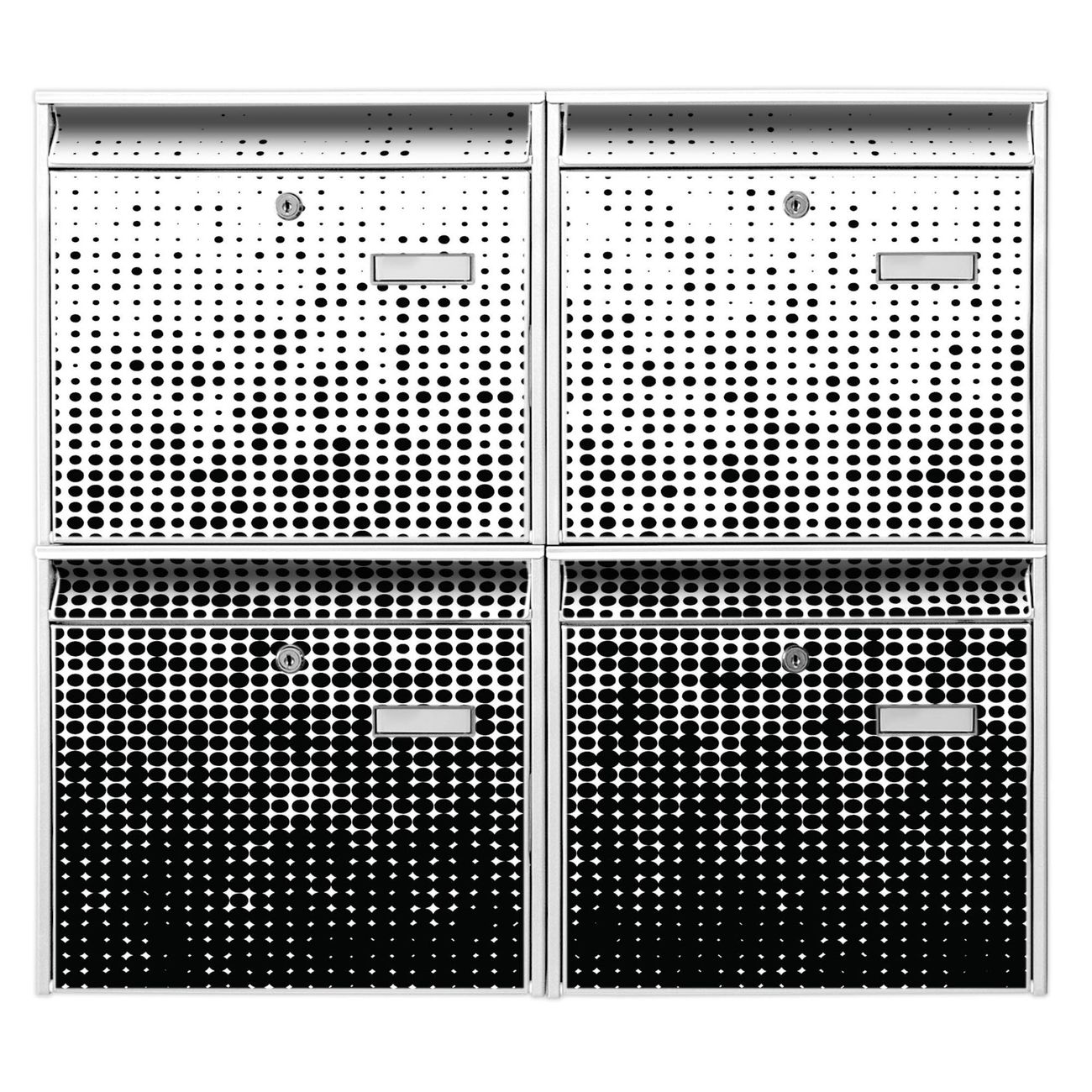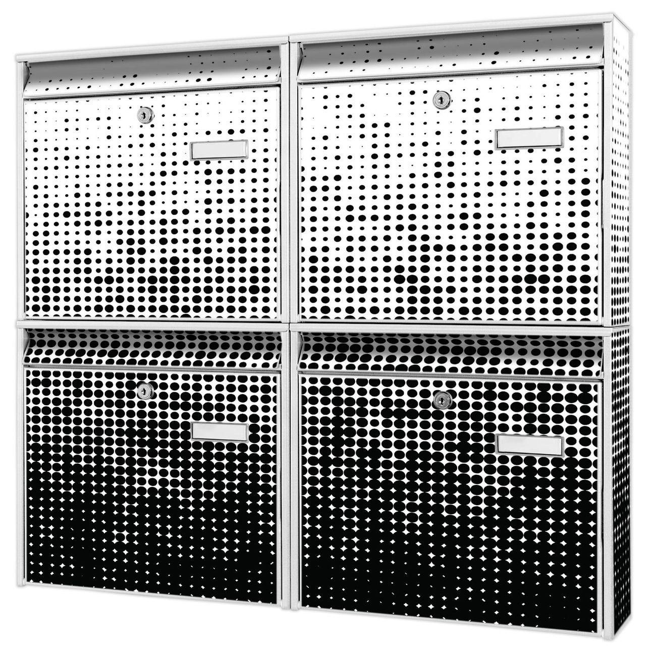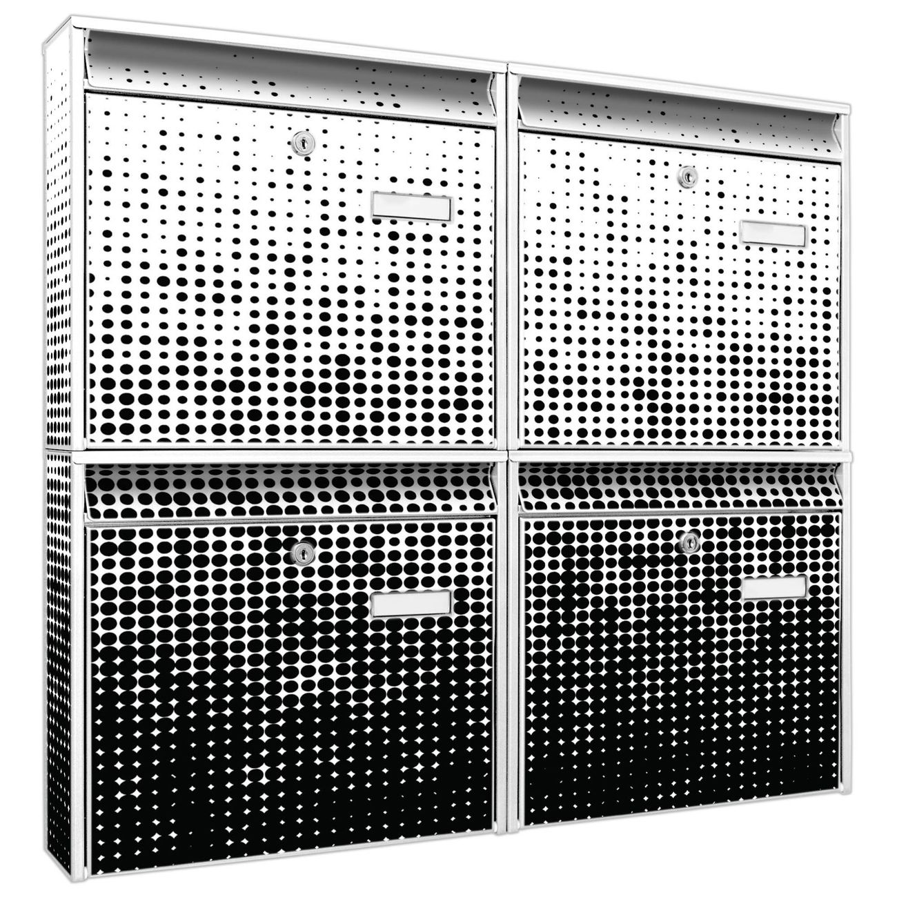 FUNKTION: Die Burg-Wächter Briefkastenanlage mit Motiv Black or White bietet Ihnen ausreichend Fassungsvermögen um auch A4 und C4 Sendungen zu empfangen. Das integrierte Namensschild lässt sich individuell beschriften. Wählen Sie aus den Grundfarben weiß, silber und schwarz. DESIGN: Die 4 Briefkästen haben ein ansprechendes und zeitloses Design, ohne dabei auf Funktionalität zu verzichten. Das Material ist sehr stabil, wetterfest und rostfrei. Durch das Motiv Black or White werden die Postkästen zu einem Blickfang. DETAILS: Die Postkästen bestehen aus verzinktem Stahl der zusätzlich mit Klarlack versiegelt wurde. Die Kästen sind gesamt 64,5cm hoch, 72,5cm breit und 10cm tief. Das Motiv besteht aus einer wetter- und UV-festen Folie, die Ihren Briefkasten zusätzlich vor Kratzern schützt. Die Postkästen werden mit Montagematerial, je einem Namensschild und je zwei Schlüsseln geliefert. NUTZEN: Das Briefkastenset eignet sich für die Wandmontage, die Größe bietet genügend Platz für Sendungen aller Art. Das zeitlose Design sowie die stabile Bauart bieten Ihnen einen treuen Begleiter für Ihre Post. BANJADO:
