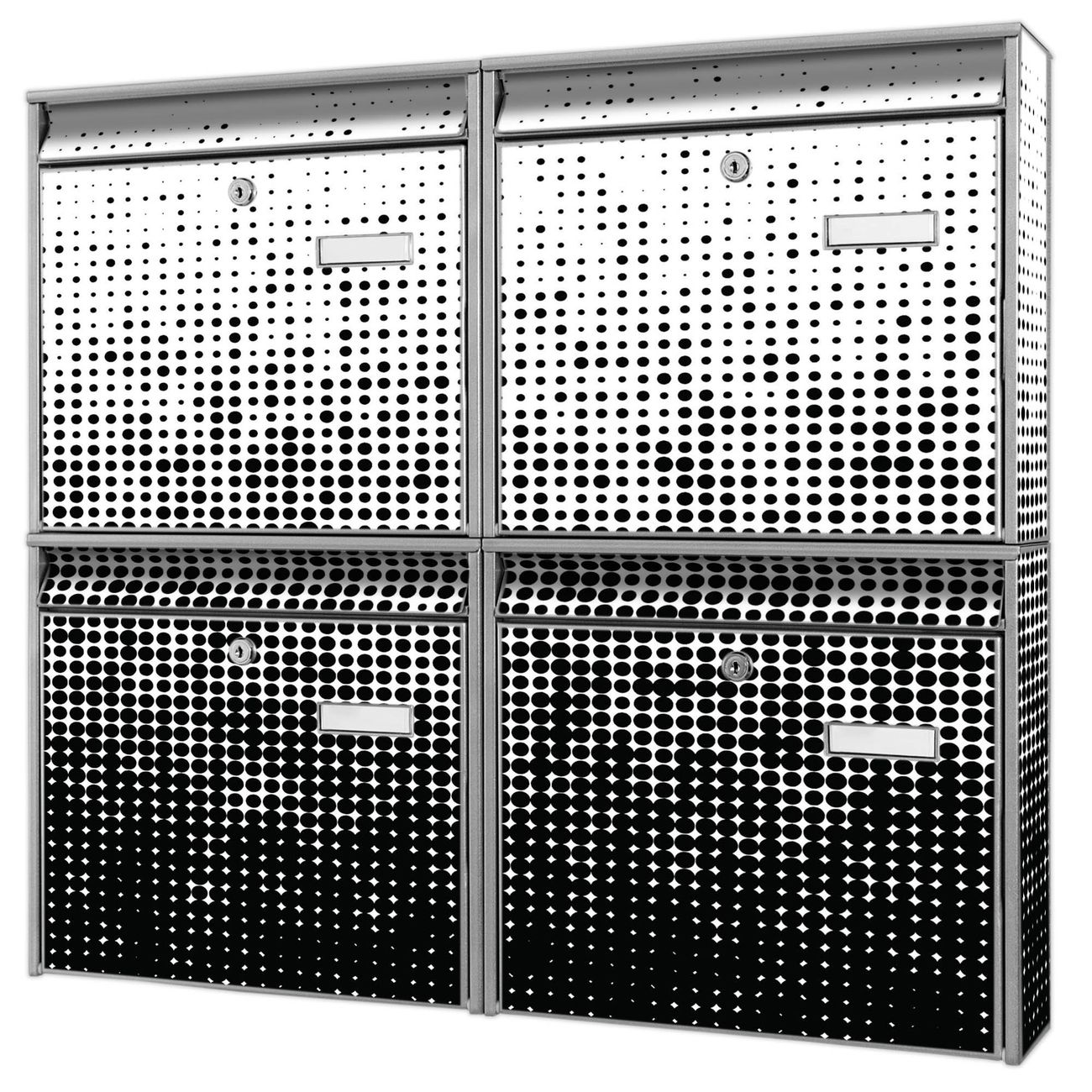FUNKTION: Die Burg-Wächter Briefkastenanlage mit Motiv Black or White bietet Ihnen ausreichend Fassungsvermögen um auch A4 und C4 Sendungen zu empfangen. Das integrierte Namensschild lässt sich individuell beschriften. Wählen Sie aus den Grundfarben weiß, silber und schwarz. DESIGN: Die 4 Briefkästen haben ein ansprechendes und zeitloses Design, ohne dabei auf Funktionalität zu verzichten. Das Material ist sehr stabil, wetterfest und rostfrei. Durch das Motiv Black or White werden die Postkästen zu einem Blickfang. DETAILS: Die Postkästen bestehen aus verzinktem Stahl der zusätzlich mit Klarlack versiegelt wurde. Die Kästen sind gesamt 64,5cm hoch, 72,5cm breit und 10cm tief. Das Motiv besteht aus einer wetter- und UV-festen Folie, die Ihren Briefkasten zusätzlich vor Kratzern schützt. Die Postkästen werden mit Montagematerial, je einem Namensschild und je zwei Schlüsseln geliefert. NUTZEN: Das Briefkastenset eignet sich für die Wandmontage, die Größe bietet genügend Platz für Sendungen aller Art. Das zeitlose Design sowie die stabile Bauart bieten Ihnen einen treuen Begleiter für Ihre Post. BANJADO: