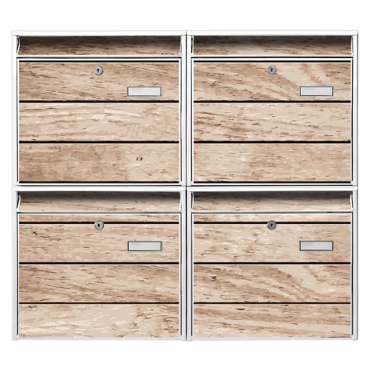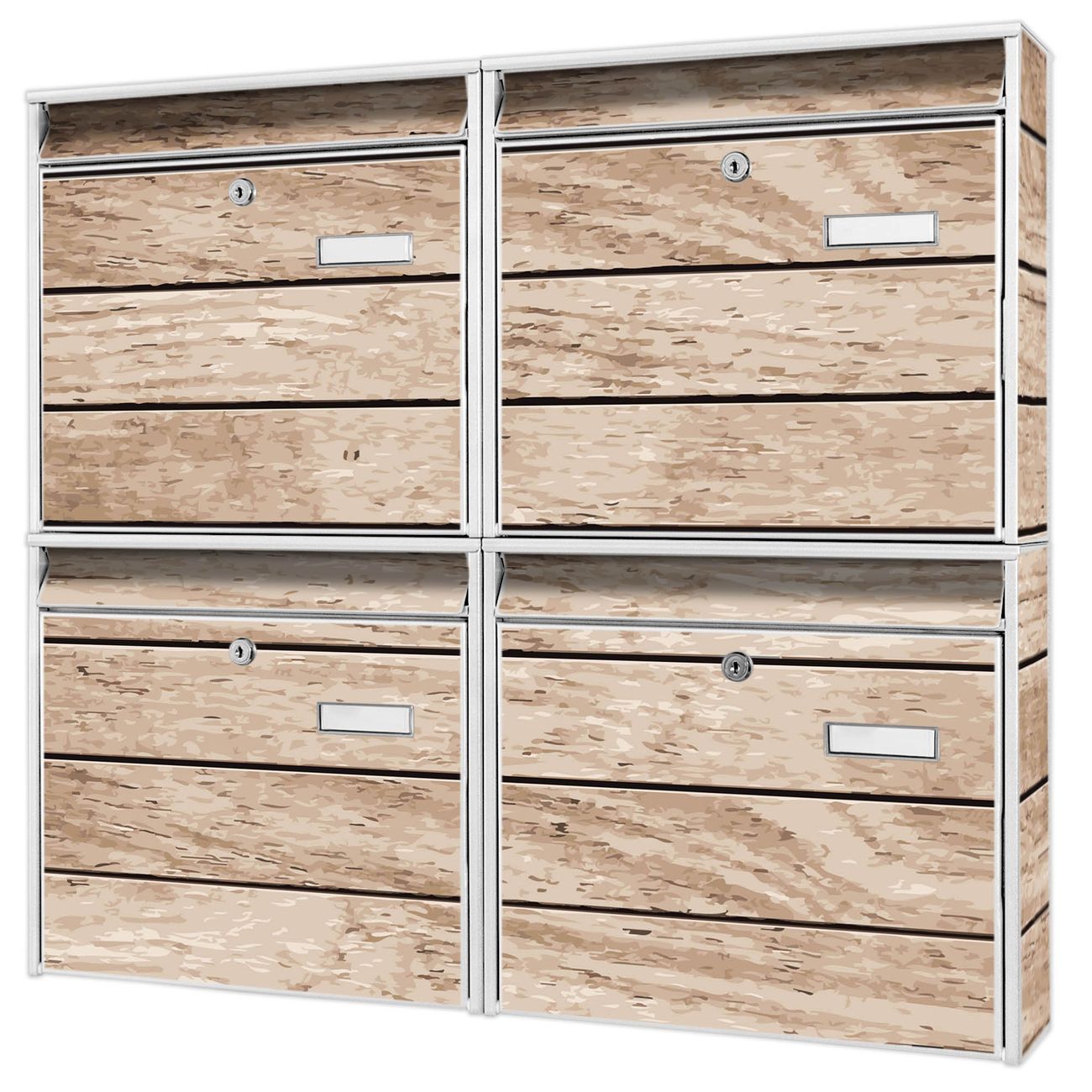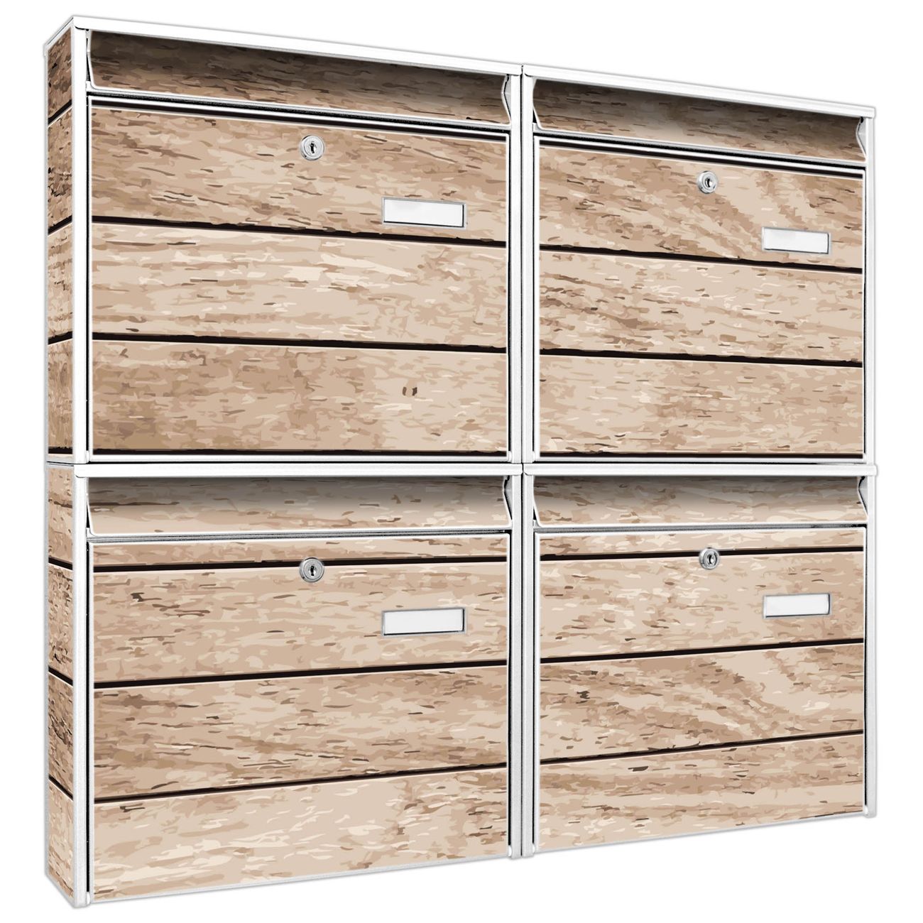 FUNKTION: Die Burg-Wächter Briefkastenanlage mit Motiv Blasse Holzlatten bietet Ihnen ausreichend Fassungsvermögen um auch A4 und C4 Sendungen zu empfangen. Das integrierte Namensschild lässt sich individuell beschriften. Wählen Sie aus den Grundfarben weiß, silber und schwarz. DESIGN: Die 4 Briefkästen haben ein ansprechendes und zeitloses Design, ohne dabei auf Funktionalität zu verzichten. Das Material ist sehr stabil, wetterfest und rostfrei. Durch das Motiv Blasse Holzlatten werden die Postkästen zu einem Blickfang. DETAILS: Die Postkästen bestehen aus verzinktem Stahl der zusätzlich mit Klarlack versiegelt wurde. Die Kästen sind gesamt 64,5cm hoch, 72,5cm breit und 10cm tief. Das Motiv besteht aus einer wetter- und UV-festen Folie, die Ihren Briefkasten zusätzlich vor Kratzern schützt. Die Postkästen werden mit Montagematerial, je einem Namensschild und je zwei Schlüsseln geliefert. NUTZEN: Das Briefkastenset eignet sich für die Wandmontage, die Größe bietet genügend Platz für Sendungen aller Art. Das zeitlose Design sowie die stabile Bauart bieten Ihnen einen treuen Begleiter für Ihre Post. BANJADO: