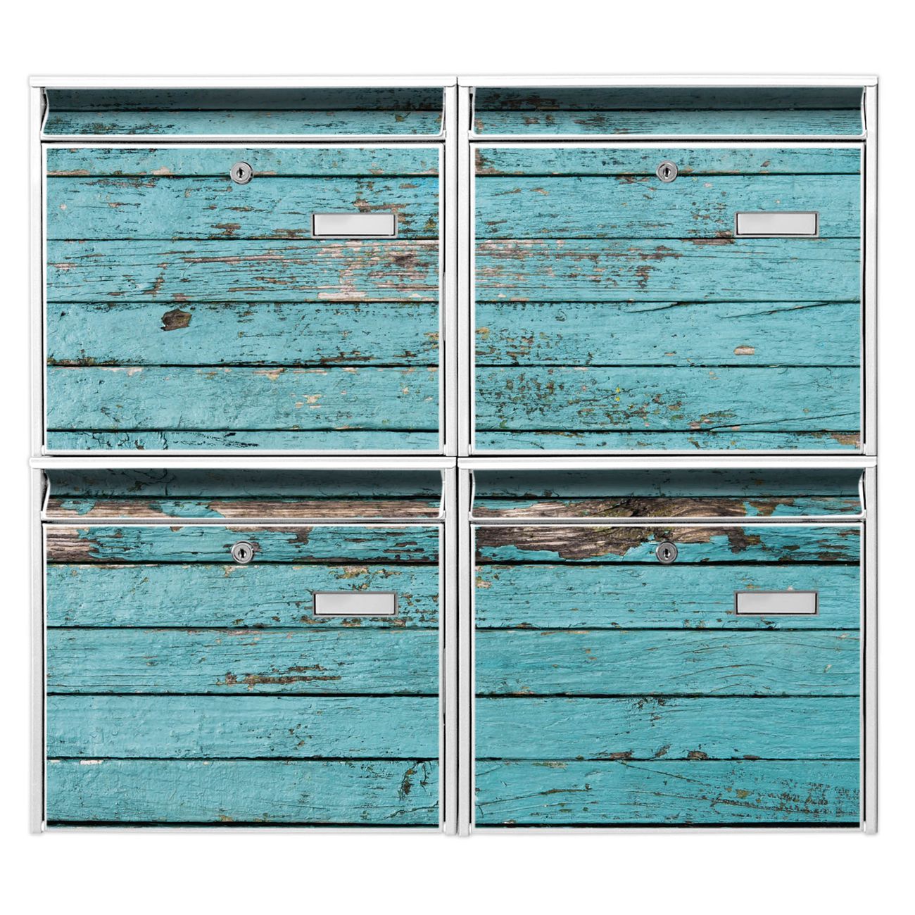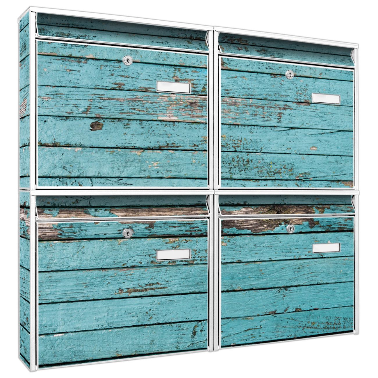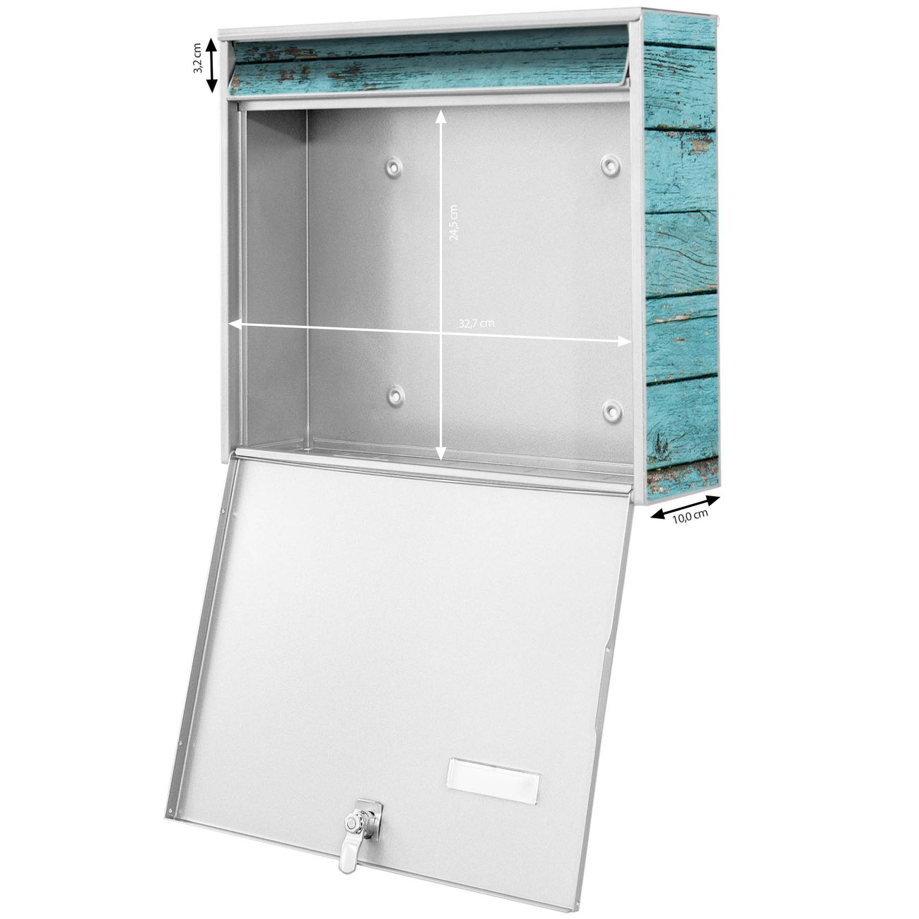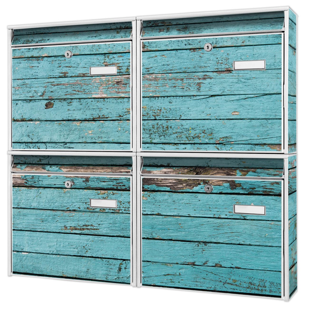FUNKTION: Die Burg-Wächter Briefkastenanlage mit Motiv Blaue Holzlatten bietet Ihnen ausreichend Fassungsvermögen um auch A4 und C4 Sendungen zu empfangen. Das integrierte Namensschild lässt sich individuell beschriften. Wählen Sie aus den Grundfarben weiß, silber und schwarz. DESIGN: Die 4 Briefkästen haben ein ansprechendes und zeitloses Design, ohne dabei auf Funktionalität zu verzichten. Das Material ist sehr stabil, wetterfest und rostfrei. Durch das Motiv Blaue Holzlatten werden die Postkästen zu einem Blickfang. DETAILS: Die Postkästen bestehen aus verzinktem Stahl der zusätzlich mit Klarlack versiegelt wurde. Die Kästen sind gesamt 64,5cm hoch, 72,5cm breit und 10cm tief. Das Motiv besteht aus einer wetter- und UV-festen Folie, die Ihren Briefkasten zusätzlich vor Kratzern schützt. Die Postkästen werden mit Montagematerial, je einem Namensschild und je zwei Schlüsseln geliefert. NUTZEN: Das Briefkastenset eignet sich für die Wandmontage, die Größe bietet genügend Platz für Sendungen aller Art. Das zeitlose Design sowie die stabile Bauart bieten Ihnen einen treuen Begleiter für Ihre Post. BANJADO: