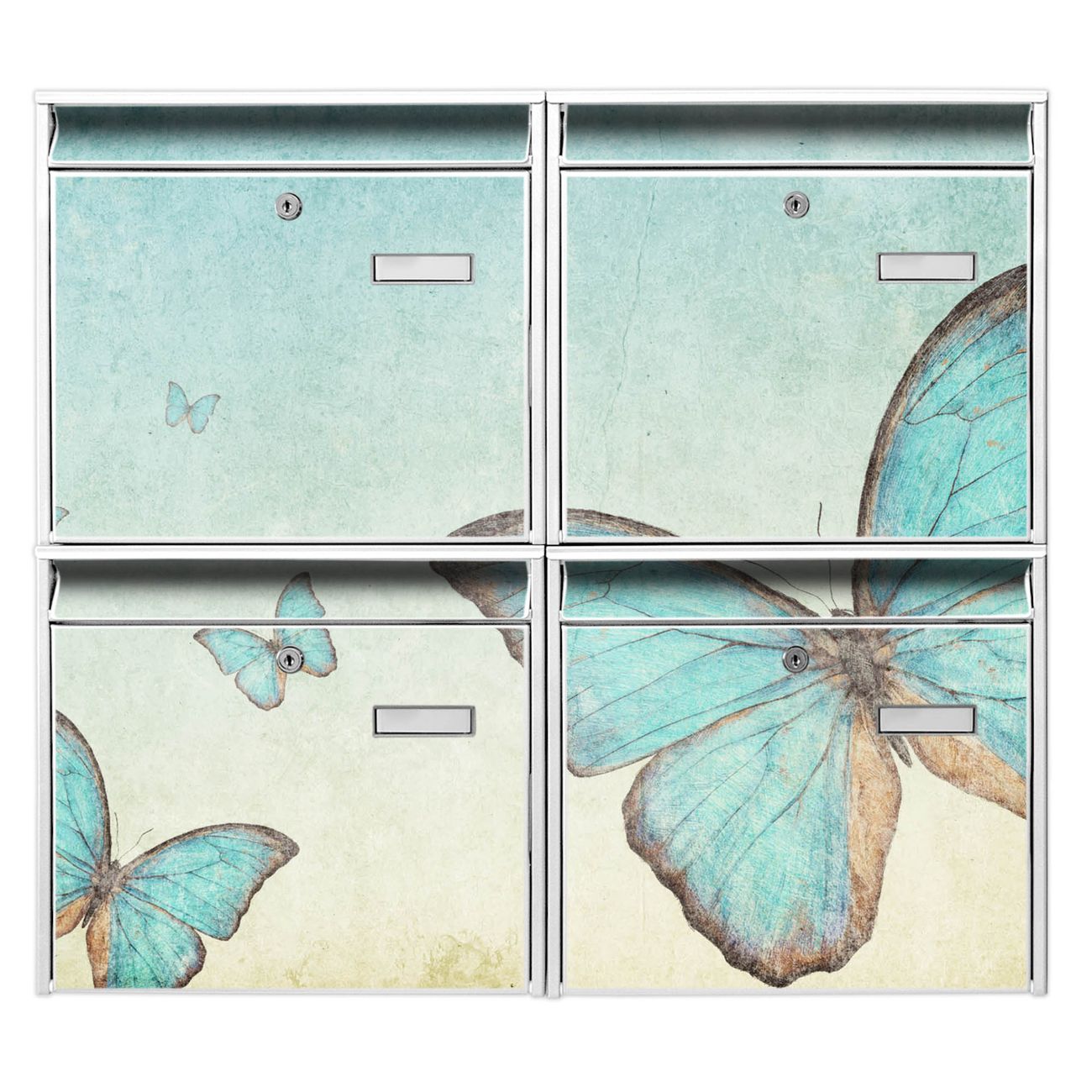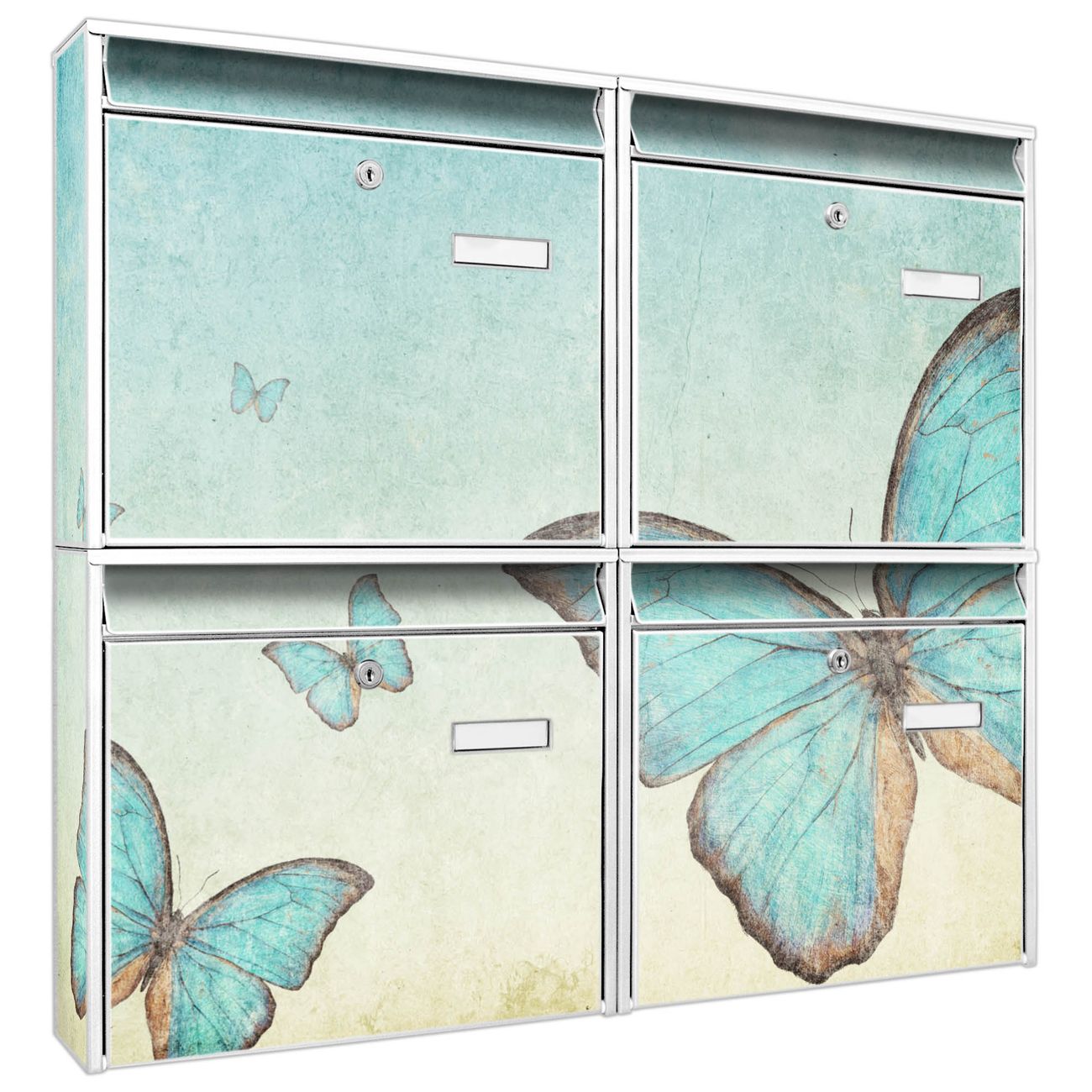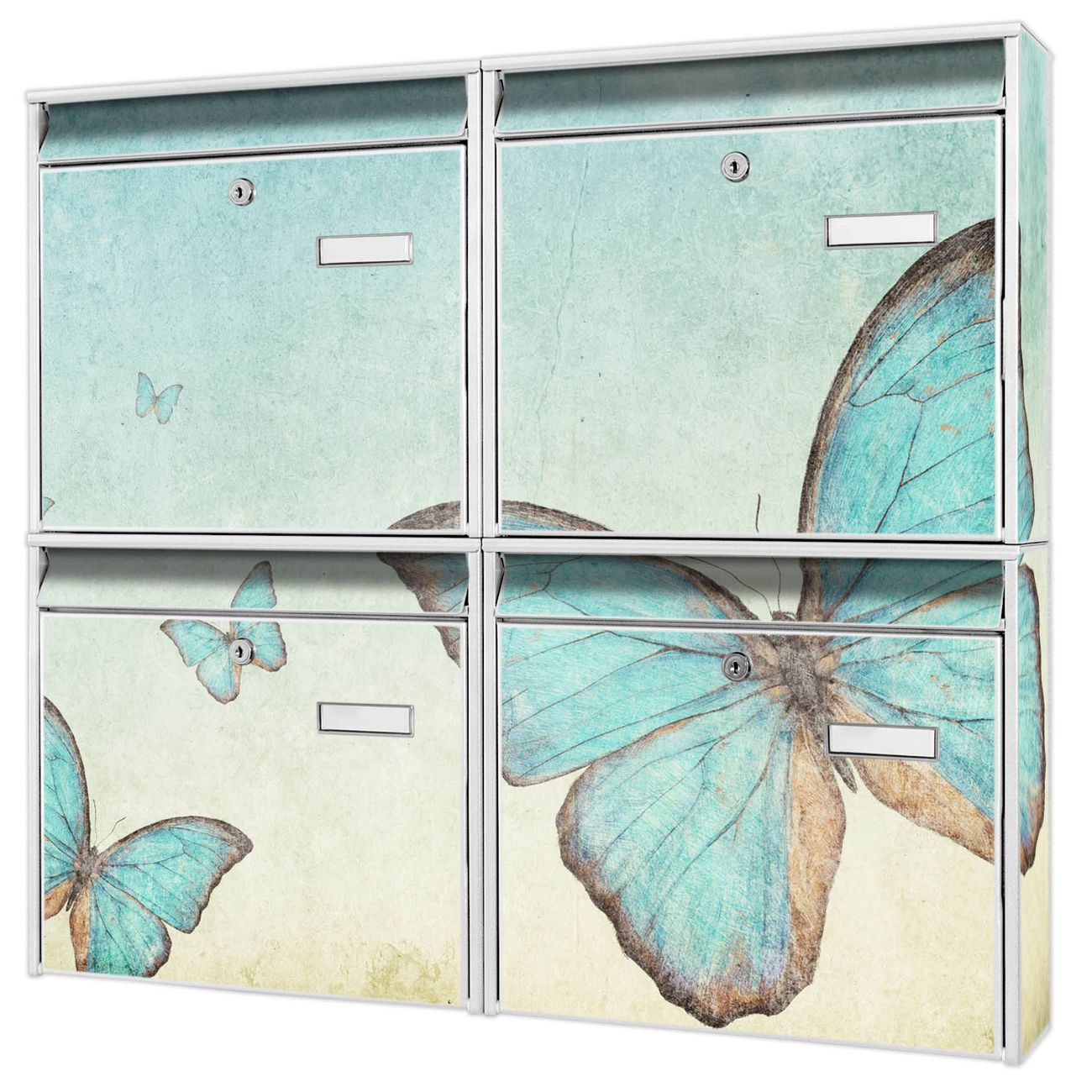 FUNKTION: Die Burg-Wächter Briefkastenanlage mit Motiv Blaue Schmetterlinge bietet Ihnen ausreichend Fassungsvermögen um auch A4 und C4 Sendungen zu empfangen. Das integrierte Namensschild lässt sich individuell beschriften. Wählen Sie aus den Grundfarben weiß, silber und schwarz. DESIGN: Die 4 Briefkästen haben ein ansprechendes und zeitloses Design, ohne dabei auf Funktionalität zu verzichten. Das Material ist sehr stabil, wetterfest und rostfrei. Durch das Motiv Blaue Schmetterlinge werden die Postkästen zu einem Blickfang. DETAILS: Die Postkästen bestehen aus verzinktem Stahl der zusätzlich mit Klarlack versiegelt wurde. Die Kästen sind gesamt 64,5cm hoch, 72,5cm breit und 10cm tief. Das Motiv besteht aus einer wetter- und UV-festen Folie, die Ihren Briefkasten zusätzlich vor Kratzern schützt. Die Postkästen werden mit Montagematerial, je einem Namensschild und je zwei Schlüsseln geliefert. NUTZEN: Das Briefkastenset eignet sich für die Wandmontage, die Größe bietet genügend Platz für Sendungen aller Art. Das zeitlose Design sowie die stabile Bauart bieten Ihnen einen treuen Begleiter für Ihre Post. BANJADO: