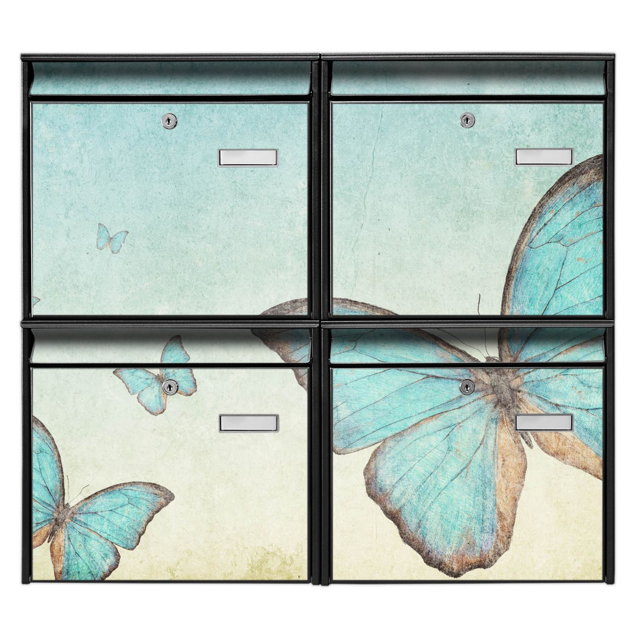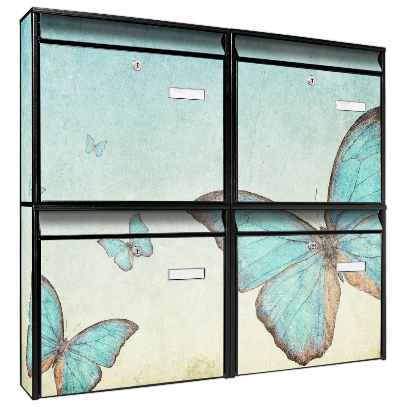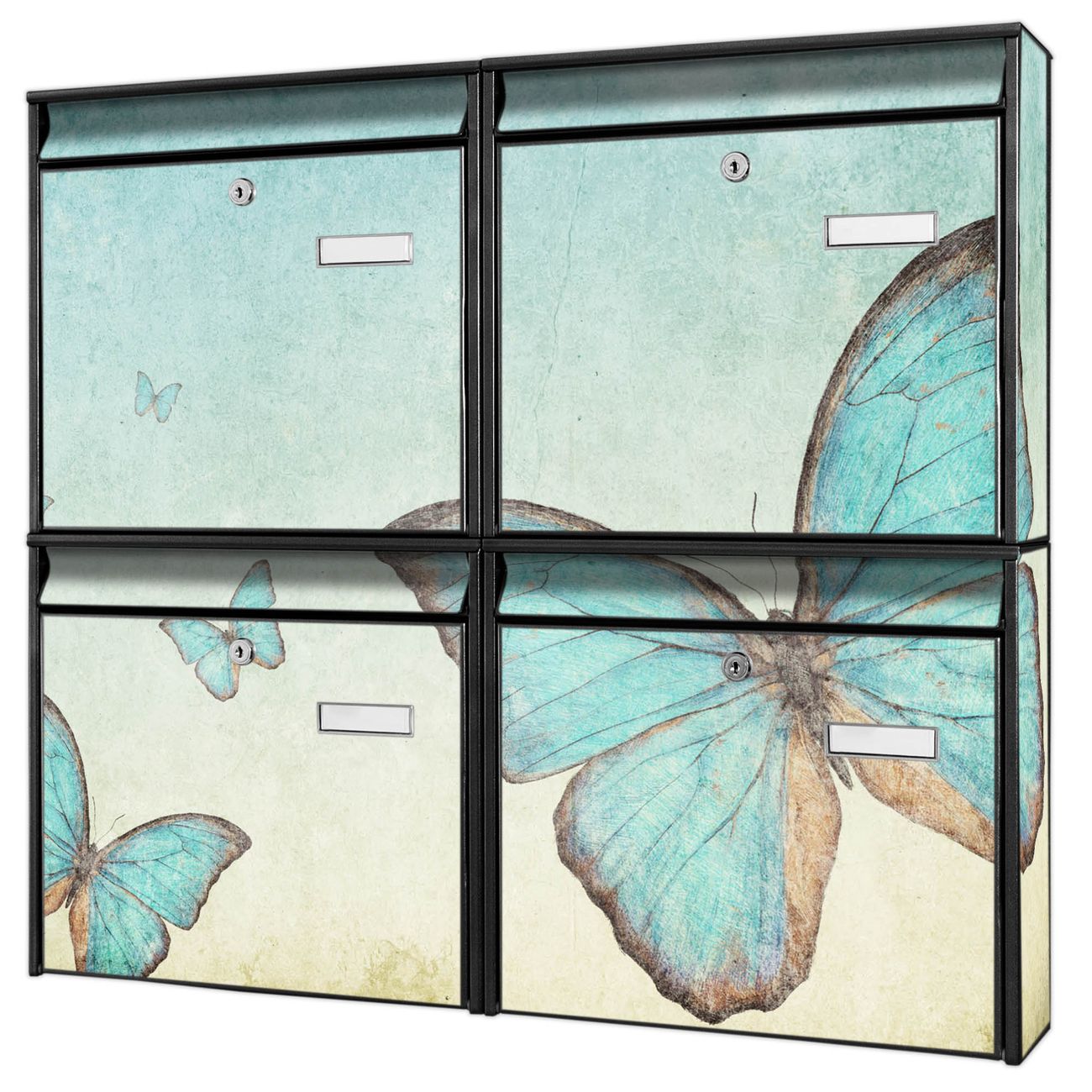 FUNKTION: Die Burg-Wächter Briefkastenanlage mit Motiv Blaue Schmetterlinge bietet Ihnen ausreichend Fassungsvermögen um auch A4 und C4 Sendungen zu empfangen. Das integrierte Namensschild lässt sich individuell beschriften. Wählen Sie aus den Grundfarben weiß, silber und schwarz. DESIGN: Die 4 Briefkästen haben ein ansprechendes und zeitloses Design, ohne dabei auf Funktionalität zu verzichten. Das Material ist sehr stabil, wetterfest und rostfrei. Durch das Motiv Blaue Schmetterlinge werden die Postkästen zu einem Blickfang. DETAILS: Die Postkästen bestehen aus verzinktem Stahl der zusätzlich mit Klarlack versiegelt wurde. Die Kästen sind gesamt 64,5cm hoch, 72,5cm breit und 10cm tief. Das Motiv besteht aus einer wetter- und UV-festen Folie, die Ihren Briefkasten zusätzlich vor Kratzern schützt. Die Postkästen werden mit Montagematerial, je einem Namensschild und je zwei Schlüsseln geliefert. NUTZEN: Das Briefkastenset eignet sich für die Wandmontage, die Größe bietet genügend Platz für Sendungen aller Art. Das zeitlose Design sowie die stabile Bauart bieten Ihnen einen treuen Begleiter für Ihre Post. BANJADO: