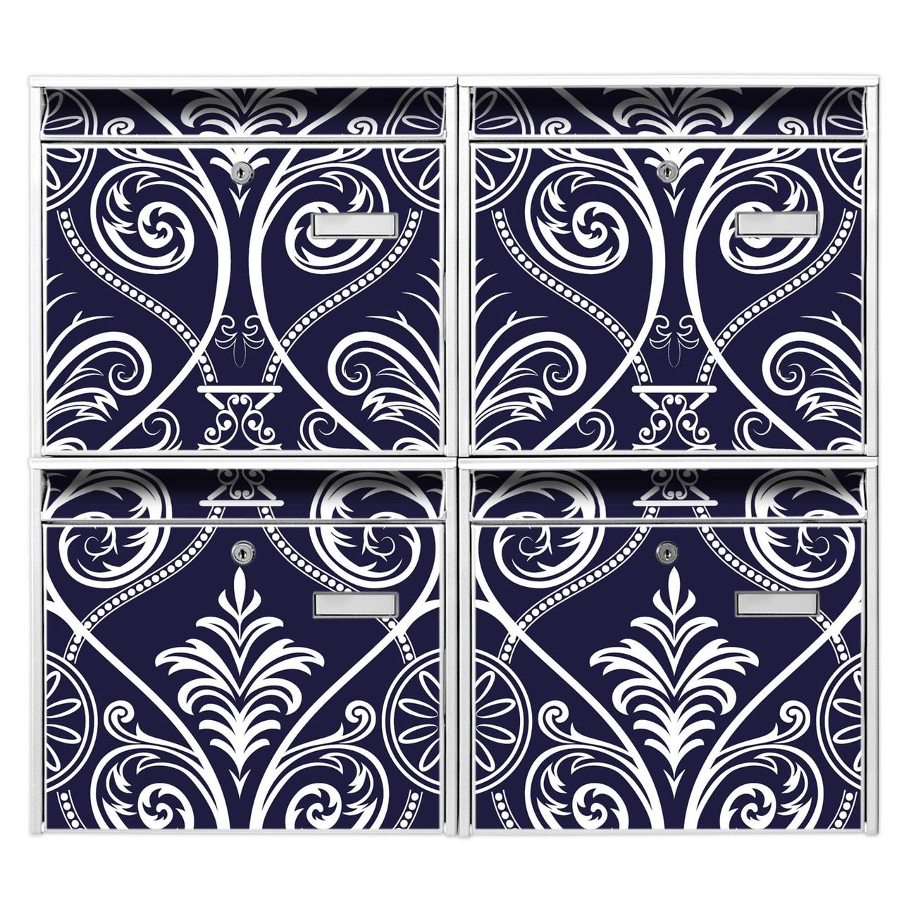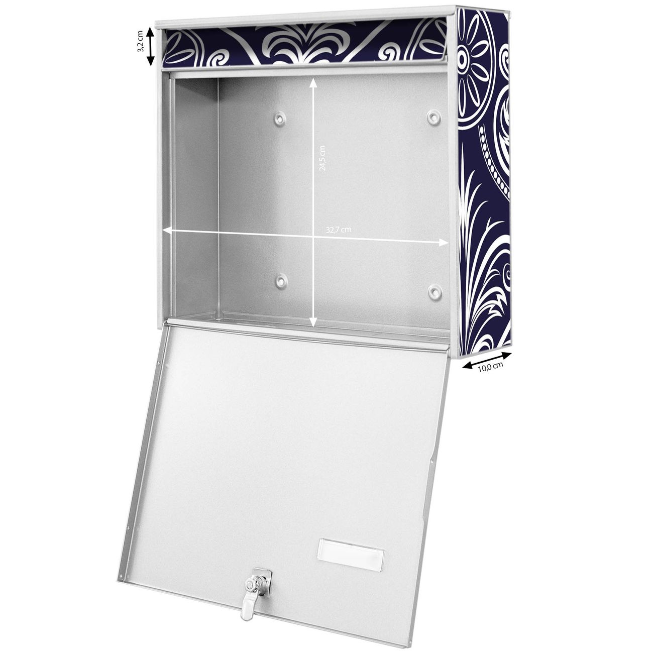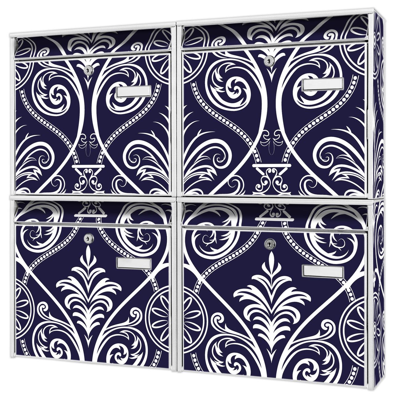 FUNKTION: Die Burg-Wächter Briefkastenanlage mit Motiv Blaue Tapete bietet Ihnen ausreichend Fassungsvermögen um auch A4 und C4 Sendungen zu empfangen. Das integrierte Namensschild lässt sich individuell beschriften. Wählen Sie aus den Grundfarben weiß, silber und schwarz. DESIGN: Die 4 Briefkästen haben ein ansprechendes und zeitloses Design, ohne dabei auf Funktionalität zu verzichten. Das Material ist sehr stabil, wetterfest und rostfrei. Durch das Motiv Blaue Tapete werden die Postkästen zu einem Blickfang. DETAILS: Die Postkästen bestehen aus verzinktem Stahl der zusätzlich mit Klarlack versiegelt wurde. Die Kästen sind gesamt 64,5cm hoch, 72,5cm breit und 10cm tief. Das Motiv besteht aus einer wetter- und UV-festen Folie, die Ihren Briefkasten zusätzlich vor Kratzern schützt. Die Postkästen werden mit Montagematerial, je einem Namensschild und je zwei Schlüsseln geliefert. NUTZEN: Das Briefkastenset eignet sich für die Wandmontage, die Größe bietet genügend Platz für Sendungen aller Art. Das zeitlose Design sowie die stabile Bauart bieten Ihnen einen treuen Begleiter für Ihre Post. BANJADO: