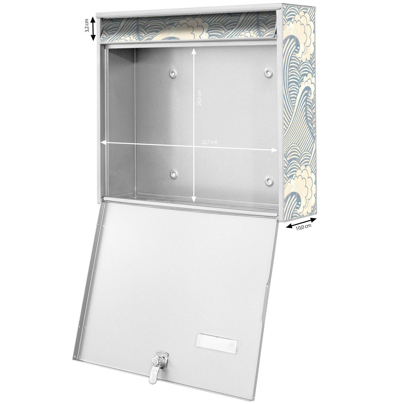 FUNKTION: Die Burg-Wächter Briefkastenanlage mit Motiv Blaue Wellen bietet Ihnen ausreichend Fassungsvermögen um auch A4 und C4 Sendungen zu empfangen. Das integrierte Namensschild lässt sich individuell beschriften. Wählen Sie aus den Grundfarben weiß, silber und schwarz. DESIGN: Die 4 Briefkästen haben ein ansprechendes und zeitloses Design, ohne dabei auf Funktionalität zu verzichten. Das Material ist sehr stabil, wetterfest und rostfrei. Durch das Motiv Blaue Wellen werden die Postkästen zu einem Blickfang. DETAILS: Die Postkästen bestehen aus verzinktem Stahl der zusätzlich mit Klarlack versiegelt wurde. Die Kästen sind gesamt 64,5cm hoch, 72,5cm breit und 10cm tief. Das Motiv besteht aus einer wetter- und UV-festen Folie, die Ihren Briefkasten zusätzlich vor Kratzern schützt. Die Postkästen werden mit Montagematerial, je einem Namensschild und je zwei Schlüsseln geliefert. NUTZEN: Das Briefkastenset eignet sich für die Wandmontage, die Größe bietet genügend Platz für Sendungen aller Art. Das zeitlose Design sowie die stabile Bauart bieten Ihnen einen treuen Begleiter für Ihre Post. BANJADO: