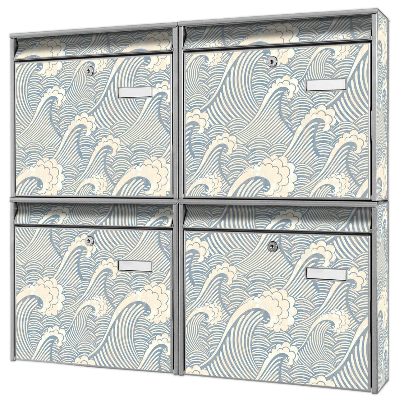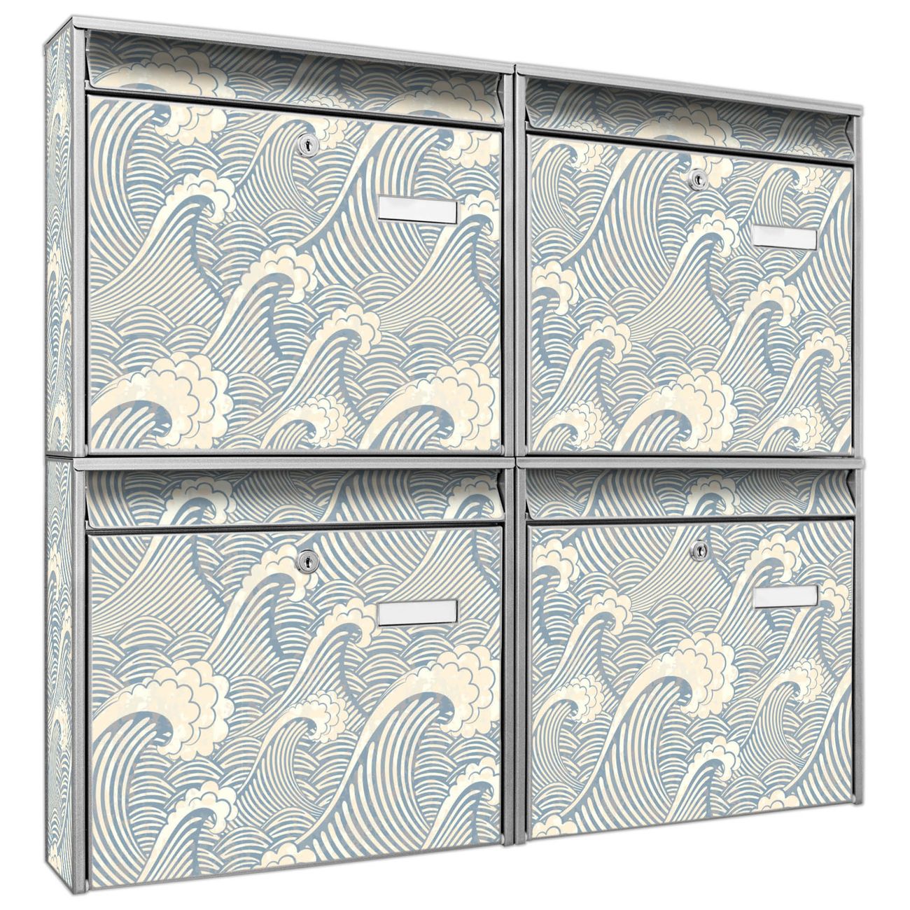 FUNKTION: Die Burg-Wächter Briefkastenanlage mit Motiv Blaue Wellen bietet Ihnen ausreichend Fassungsvermögen um auch A4 und C4 Sendungen zu empfangen. Das integrierte Namensschild lässt sich individuell beschriften. Wählen Sie aus den Grundfarben weiß, silber und schwarz. DESIGN: Die 4 Briefkästen haben ein ansprechendes und zeitloses Design, ohne dabei auf Funktionalität zu verzichten. Das Material ist sehr stabil, wetterfest und rostfrei. Durch das Motiv Blaue Wellen werden die Postkästen zu einem Blickfang. DETAILS: Die Postkästen bestehen aus verzinktem Stahl der zusätzlich mit Klarlack versiegelt wurde. Die Kästen sind gesamt 64,5cm hoch, 72,5cm breit und 10cm tief. Das Motiv besteht aus einer wetter- und UV-festen Folie, die Ihren Briefkasten zusätzlich vor Kratzern schützt. Die Postkästen werden mit Montagematerial, je einem Namensschild und je zwei Schlüsseln geliefert. NUTZEN: Das Briefkastenset eignet sich für die Wandmontage, die Größe bietet genügend Platz für Sendungen aller Art. Das zeitlose Design sowie die stabile Bauart bieten Ihnen einen treuen Begleiter für Ihre Post. BANJADO: