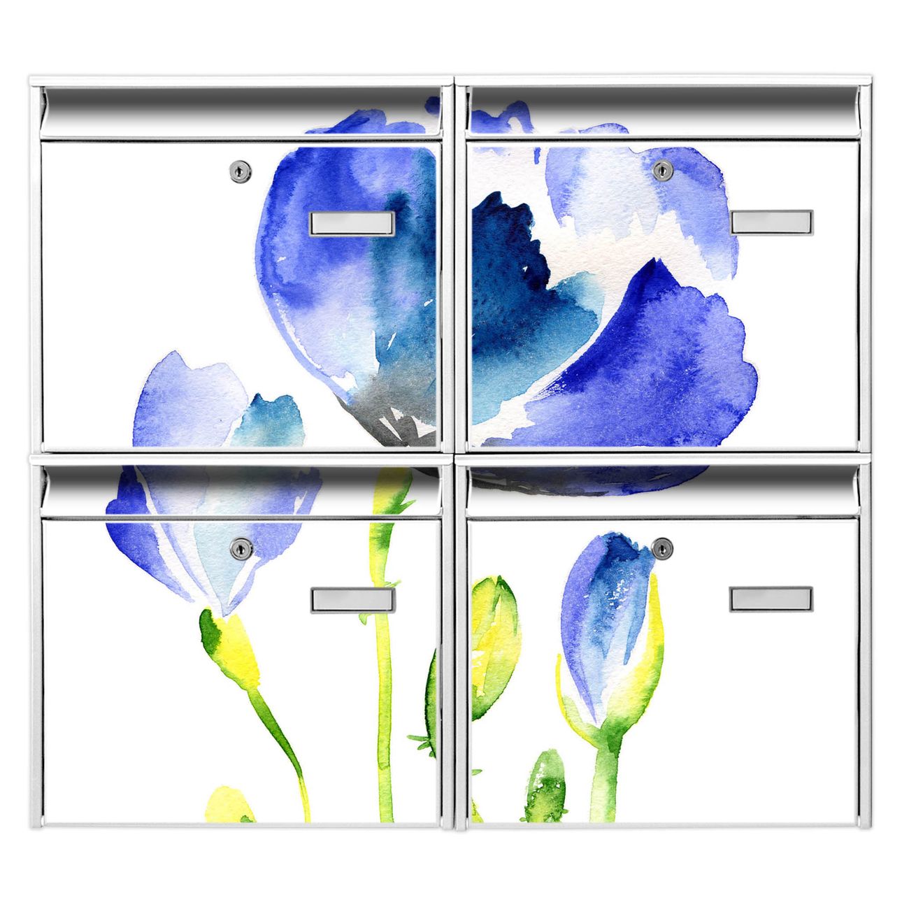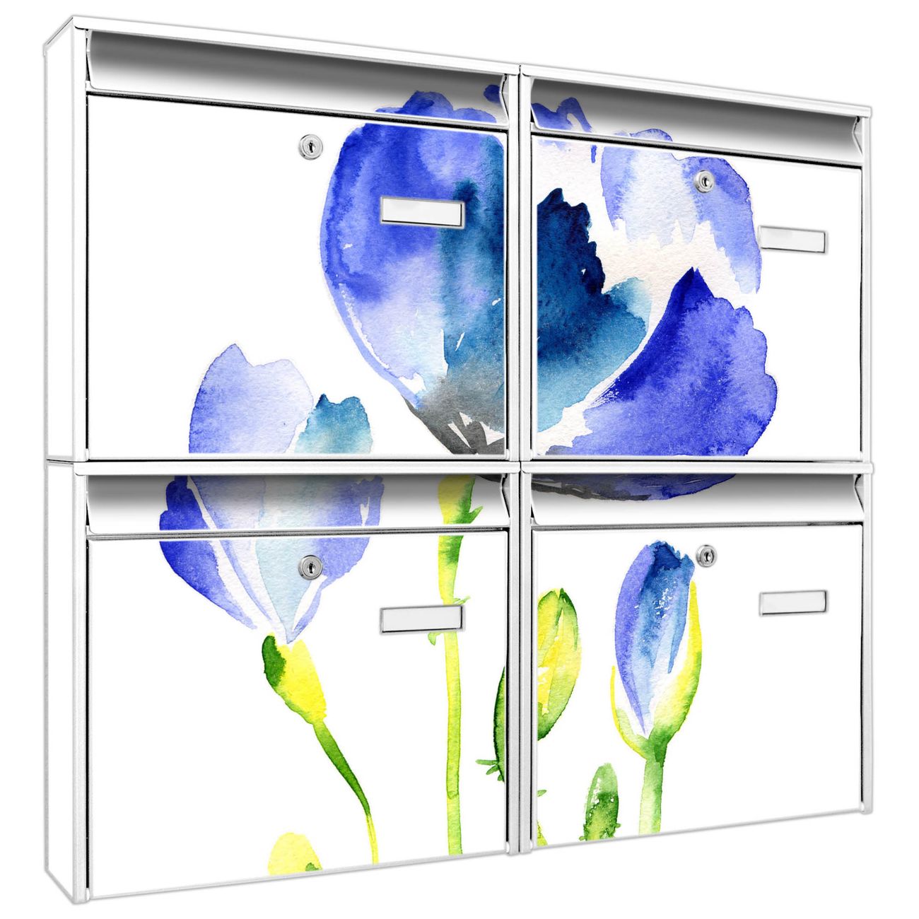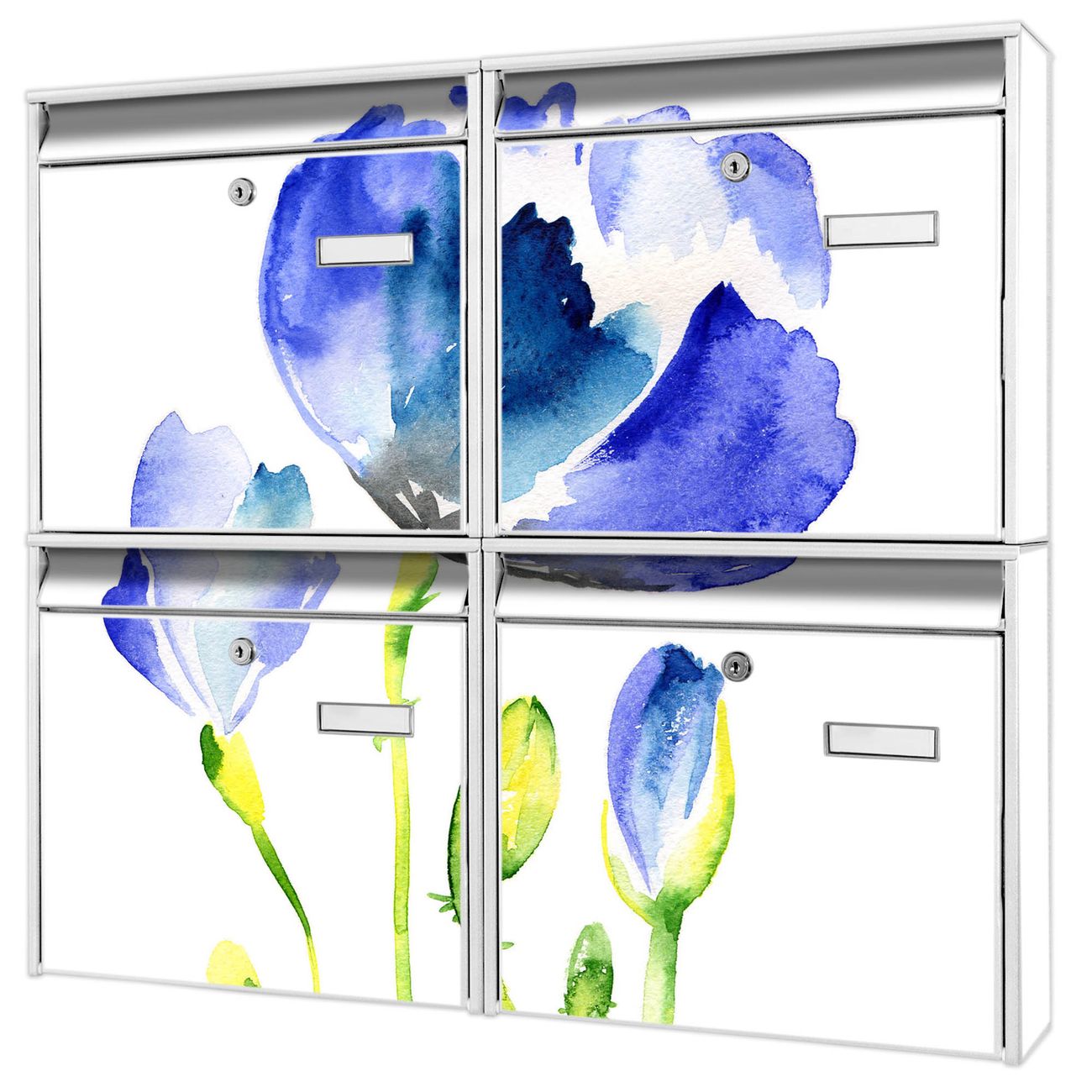 FUNKTION: Die Burg-Wächter Briefkastenanlage mit Motiv Blauer Mohn bietet Ihnen ausreichend Fassungsvermögen um auch A4 und C4 Sendungen zu empfangen. Das integrierte Namensschild lässt sich individuell beschriften. Wählen Sie aus den Grundfarben weiß, silber und schwarz. DESIGN: Die 4 Briefkästen haben ein ansprechendes und zeitloses Design, ohne dabei auf Funktionalität zu verzichten. Das Material ist sehr stabil, wetterfest und rostfrei. Durch das Motiv Blauer Mohn werden die Postkästen zu einem Blickfang. DETAILS: Die Postkästen bestehen aus verzinktem Stahl der zusätzlich mit Klarlack versiegelt wurde. Die Kästen sind gesamt 64,5cm hoch, 72,5cm breit und 10cm tief. Das Motiv besteht aus einer wetter- und UV-festen Folie, die Ihren Briefkasten zusätzlich vor Kratzern schützt. Die Postkästen werden mit Montagematerial, je einem Namensschild und je zwei Schlüsseln geliefert. NUTZEN: Das Briefkastenset eignet sich für die Wandmontage, die Größe bietet genügend Platz für Sendungen aller Art. Das zeitlose Design sowie die stabile Bauart bieten Ihnen einen treuen Begleiter für Ihre Post. BANJADO: