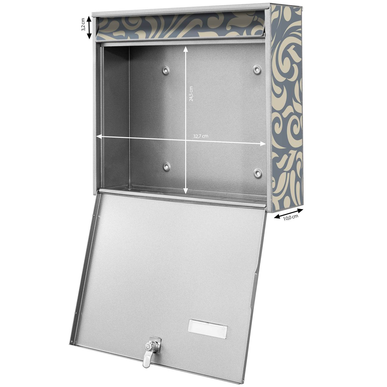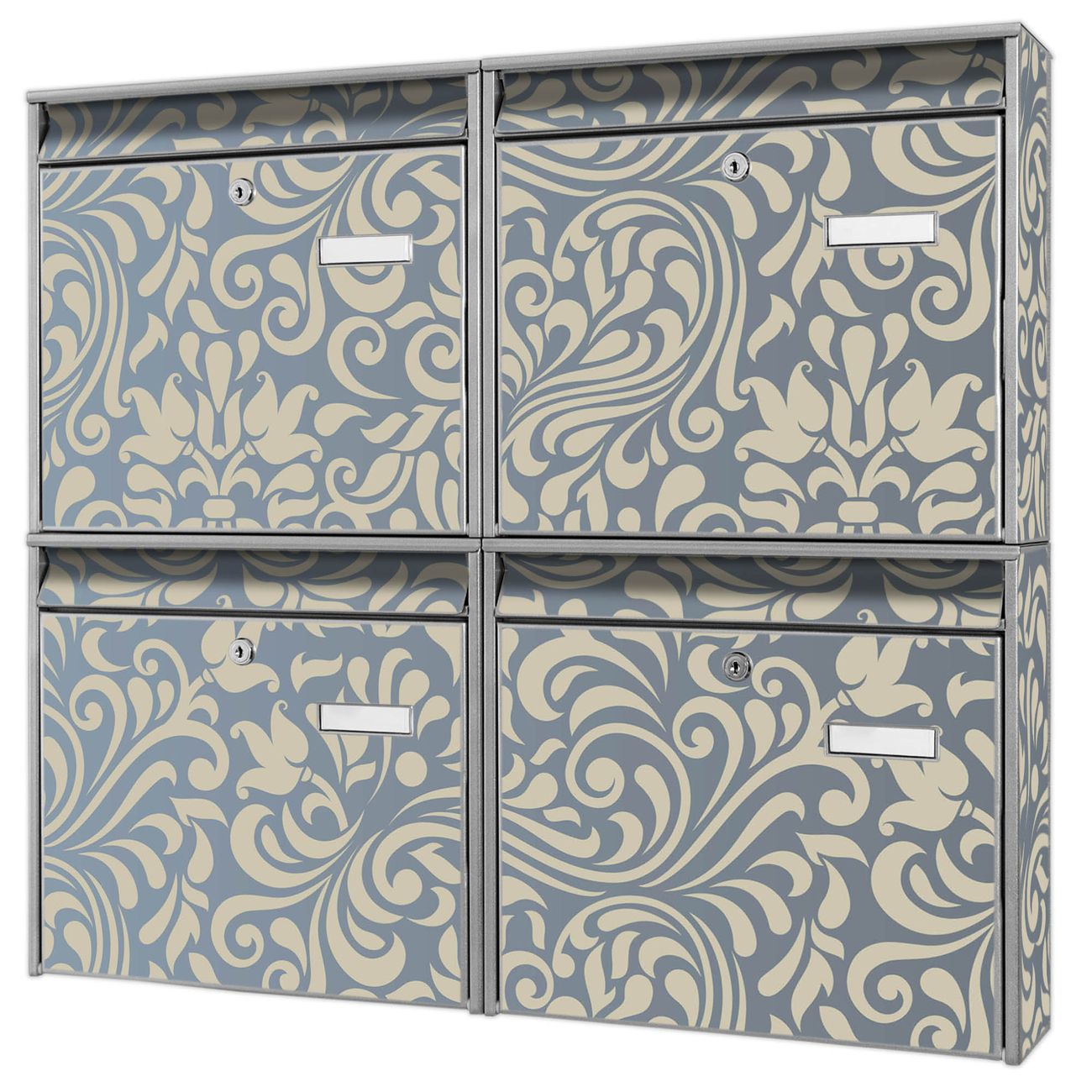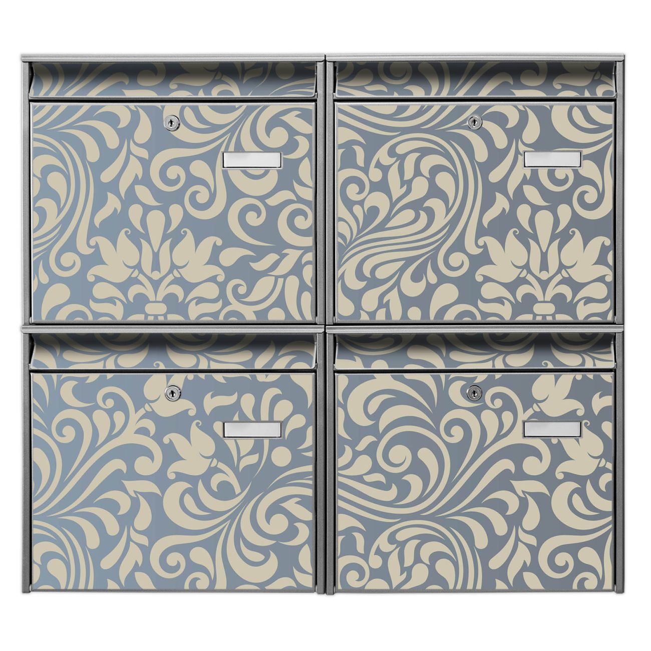 FUNKTION: Die Burg-Wächter Briefkastenanlage mit Motiv Blaues Ornament bietet Ihnen ausreichend Fassungsvermögen um auch A4 und C4 Sendungen zu empfangen. Das integrierte Namensschild lässt sich individuell beschriften. Wählen Sie aus den Grundfarben weiß, silber und schwarz. DESIGN: Die 4 Briefkästen haben ein ansprechendes und zeitloses Design, ohne dabei auf Funktionalität zu verzichten. Das Material ist sehr stabil, wetterfest und rostfrei. Durch das Motiv Blaues Ornament werden die Postkästen zu einem Blickfang. DETAILS: Die Postkästen bestehen aus verzinktem Stahl der zusätzlich mit Klarlack versiegelt wurde. Die Kästen sind gesamt 64,5cm hoch, 72,5cm breit und 10cm tief. Das Motiv besteht aus einer wetter- und UV-festen Folie, die Ihren Briefkasten zusätzlich vor Kratzern schützt. Die Postkästen werden mit Montagematerial, je einem Namensschild und je zwei Schlüsseln geliefert. NUTZEN: Das Briefkastenset eignet sich für die Wandmontage, die Größe bietet genügend Platz für Sendungen aller Art. Das zeitlose Design sowie die stabile Bauart bieten Ihnen einen treuen Begleiter für Ihre Post. BANJADO: