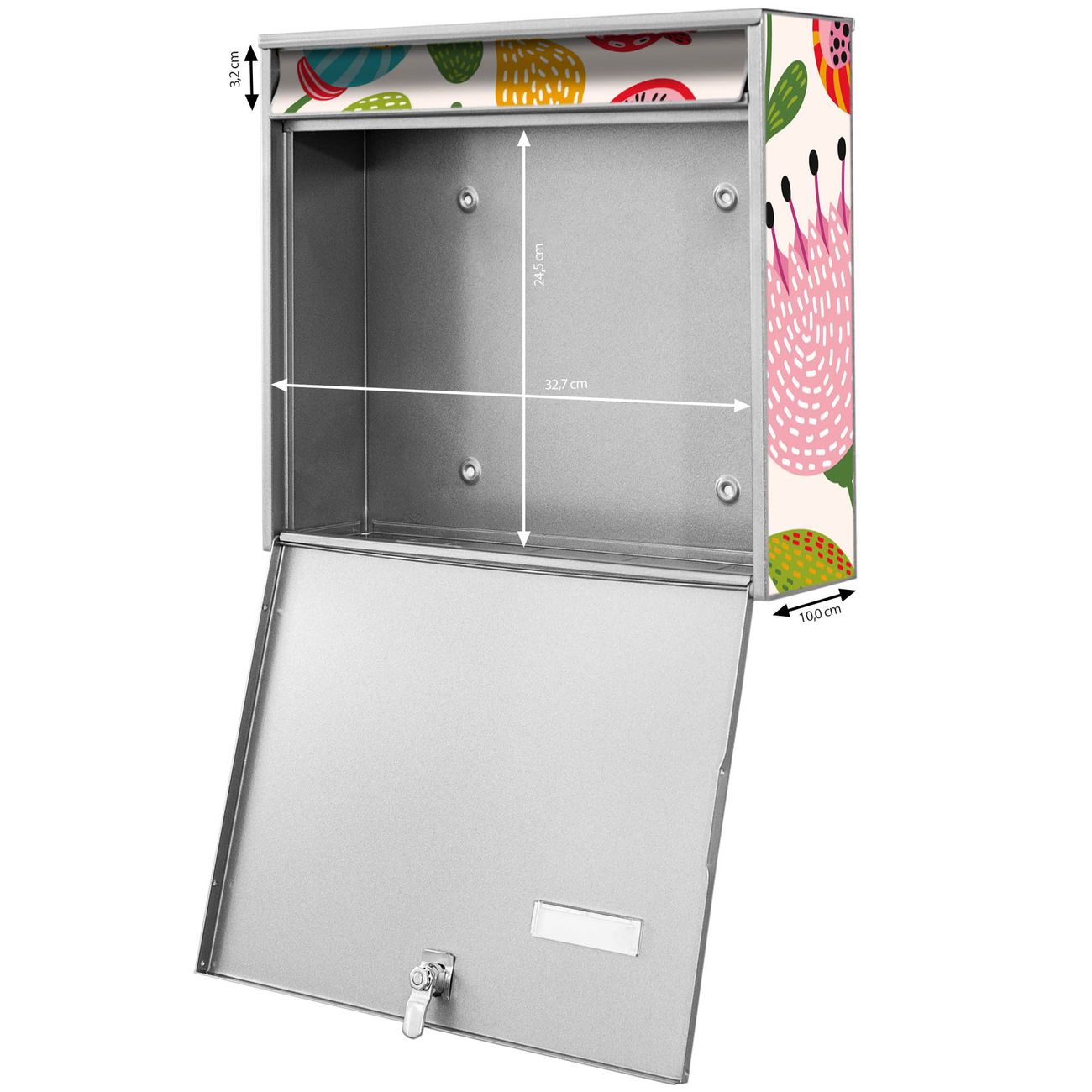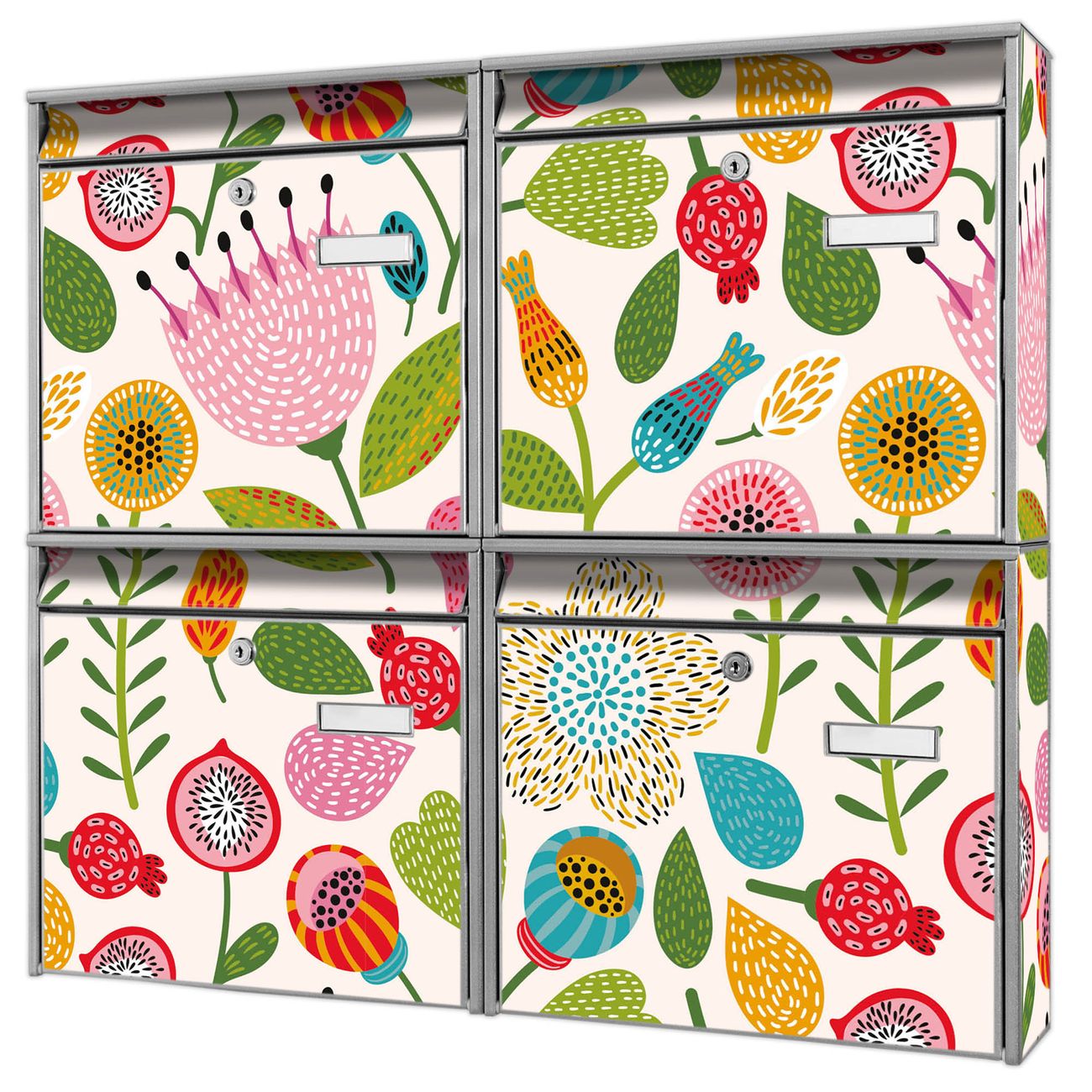 FUNKTION: Die Burg-Wächter Briefkastenanlage mit Motiv Blumen Naiv bietet Ihnen ausreichend Fassungsvermögen um auch A4 und C4 Sendungen zu empfangen. Das integrierte Namensschild lässt sich individuell beschriften. Wählen Sie aus den Grundfarben weiß, silber und schwarz. DESIGN: Die 4 Briefkästen haben ein ansprechendes und zeitloses Design, ohne dabei auf Funktionalität zu verzichten. Das Material ist sehr stabil, wetterfest und rostfrei. Durch das Motiv Blumen Naiv werden die Postkästen zu einem Blickfang. DETAILS: Die Postkästen bestehen aus verzinktem Stahl der zusätzlich mit Klarlack versiegelt wurde. Die Kästen sind gesamt 64,5cm hoch, 72,5cm breit und 10cm tief. Das Motiv besteht aus einer wetter- und UV-festen Folie, die Ihren Briefkasten zusätzlich vor Kratzern schützt. Die Postkästen werden mit Montagematerial, je einem Namensschild und je zwei Schlüsseln geliefert. NUTZEN: Das Briefkastenset eignet sich für die Wandmontage, die Größe bietet genügend Platz für Sendungen aller Art. Das zeitlose Design sowie die stabile Bauart bieten Ihnen einen treuen Begleiter für Ihre Post. BANJADO: