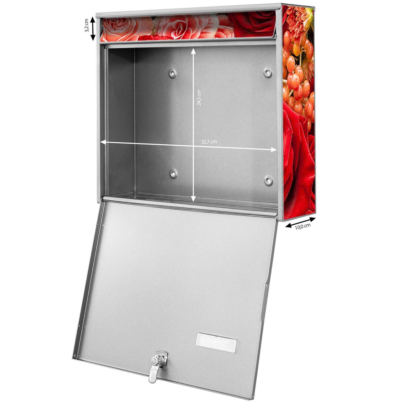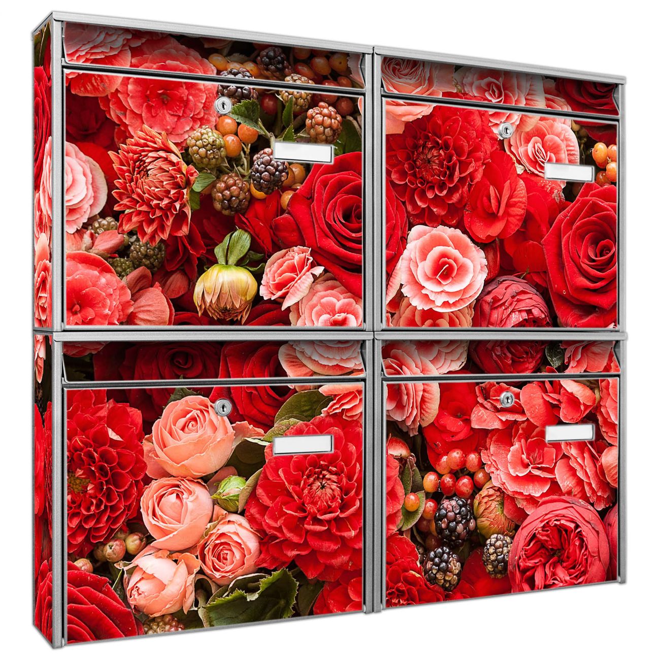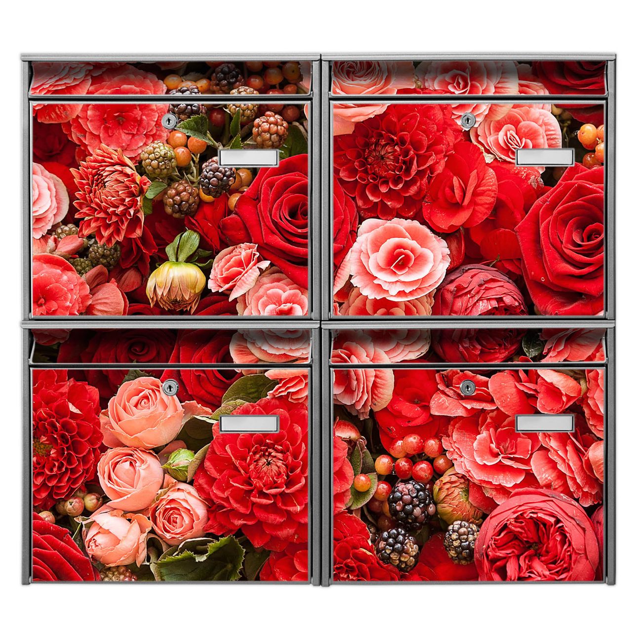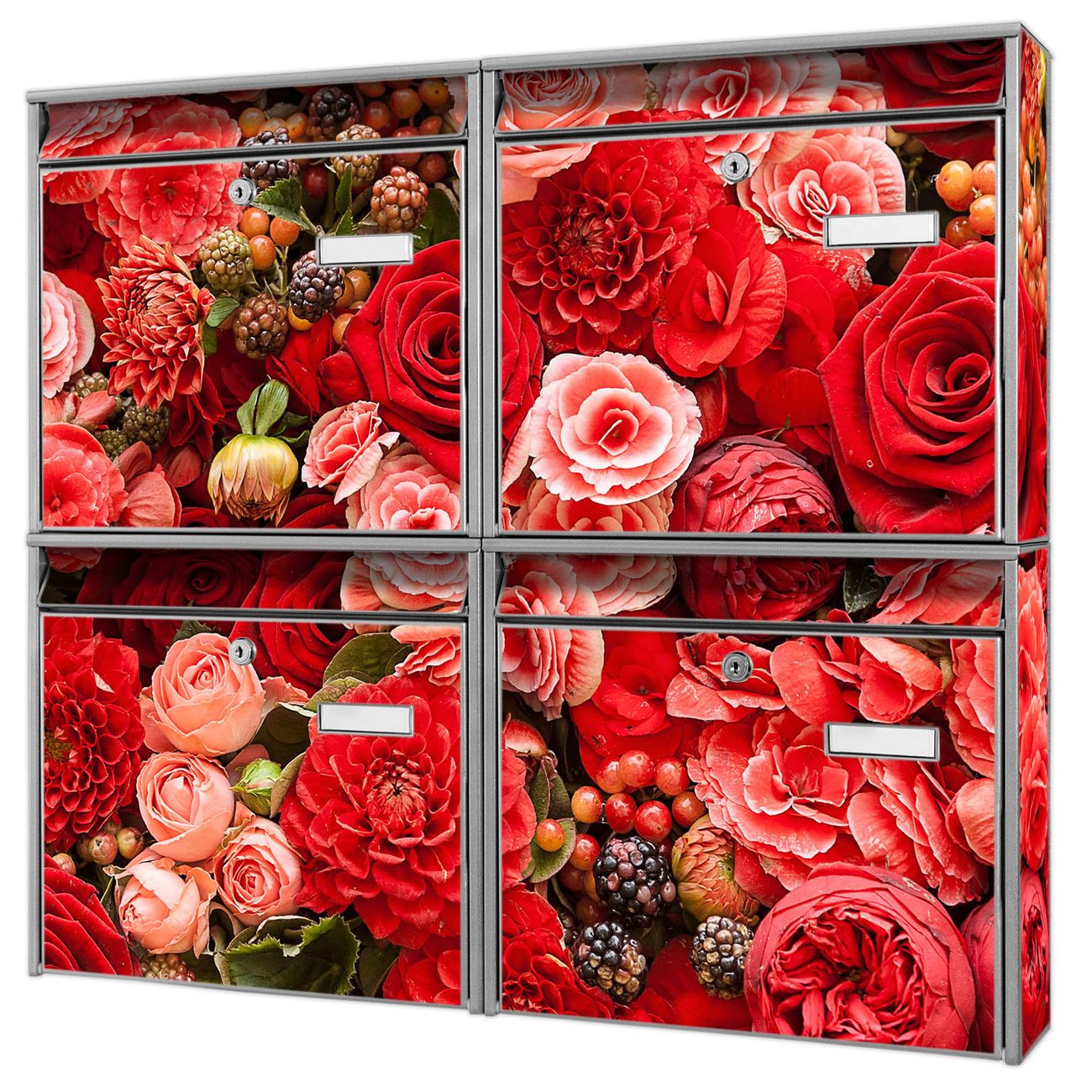 FUNKTION: Die Burg-Wächter Briefkastenanlage mit Motiv Bouquet in Rot bietet Ihnen ausreichend Fassungsvermögen um auch A4 und C4 Sendungen zu empfangen. Das integrierte Namensschild lässt sich individuell beschriften. Wählen Sie aus den Grundfarben weiß, silber und schwarz. DESIGN: Die 4 Briefkästen haben ein ansprechendes und zeitloses Design, ohne dabei auf Funktionalität zu verzichten. Das Material ist sehr stabil, wetterfest und rostfrei. Durch das Motiv Bouquet in Rot werden die Postkästen zu einem Blickfang. DETAILS: Die Postkästen bestehen aus verzinktem Stahl der zusätzlich mit Klarlack versiegelt wurde. Die Kästen sind gesamt 64,5cm hoch, 72,5cm breit und 10cm tief. Das Motiv besteht aus einer wetter- und UV-festen Folie, die Ihren Briefkasten zusätzlich vor Kratzern schützt. Die Postkästen werden mit Montagematerial, je einem Namensschild und je zwei Schlüsseln geliefert. NUTZEN: Das Briefkastenset eignet sich für die Wandmontage, die Größe bietet genügend Platz für Sendungen aller Art. Das zeitlose Design sowie die stabile Bauart bieten Ihnen einen treuen Begleiter für Ihre Post. BANJADO: