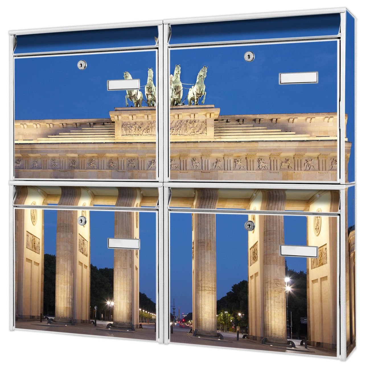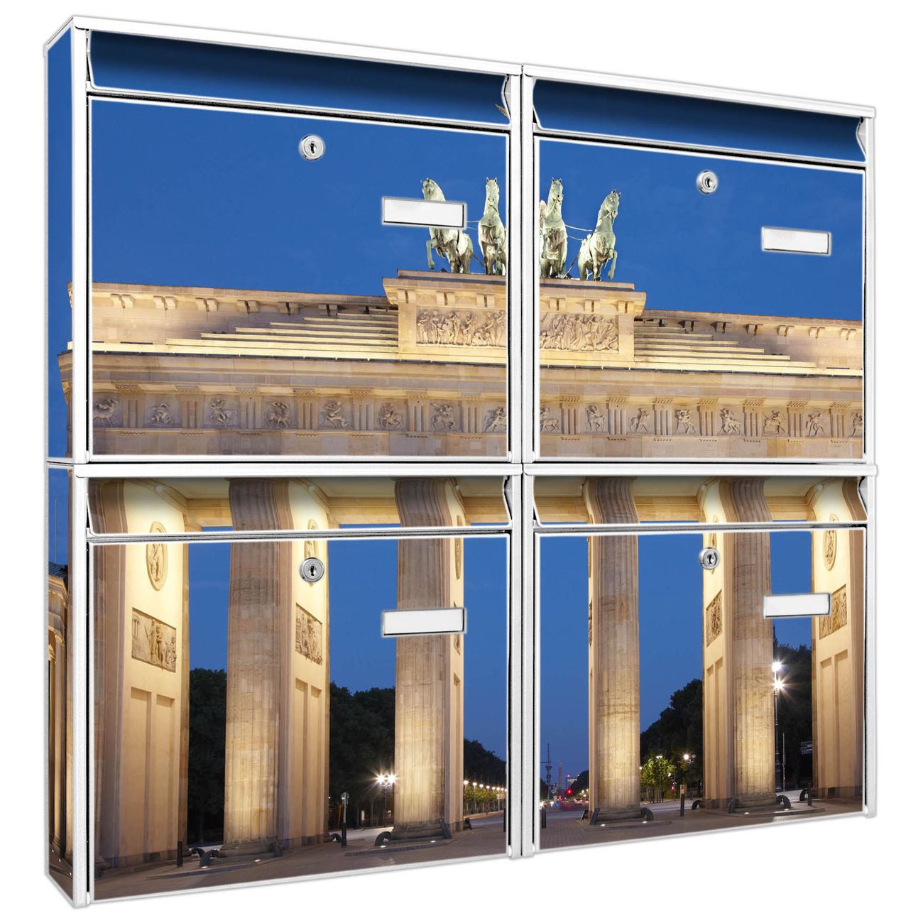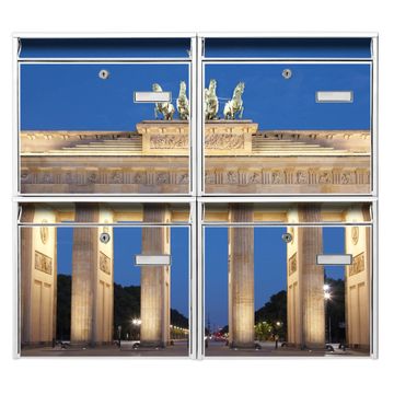 FUNKTION: Die Burg-Wächter Briefkastenanlage mit Motiv Brandenburger Tor 2 bietet Ihnen ausreichend Fassungsvermögen um auch A4 und C4 Sendungen zu empfangen. Das integrierte Namensschild lässt sich individuell beschriften. Wählen Sie aus den Grundfarben weiß, silber und schwarz. DESIGN: Die 4 Briefkästen haben ein ansprechendes und zeitloses Design, ohne dabei auf Funktionalität zu verzichten. Das Material ist sehr stabil, wetterfest und rostfrei. Durch das Motiv Brandenburger Tor 2 werden die Postkästen zu einem Blickfang. DETAILS: Die Postkästen bestehen aus verzinktem Stahl der zusätzlich mit Klarlack versiegelt wurde. Die Kästen sind gesamt 64,5cm hoch, 72,5cm breit und 10cm tief. Das Motiv besteht aus einer wetter- und UV-festen Folie, die Ihren Briefkasten zusätzlich vor Kratzern schützt. Die Postkästen werden mit Montagematerial, je einem Namensschild und je zwei Schlüsseln geliefert. NUTZEN: Das Briefkastenset eignet sich für die Wandmontage, die Größe bietet genügend Platz für Sendungen aller Art. Das zeitlose Design sowie die stabile Bauart bieten Ihnen einen treuen Begleiter für Ihre Post. BANJADO: