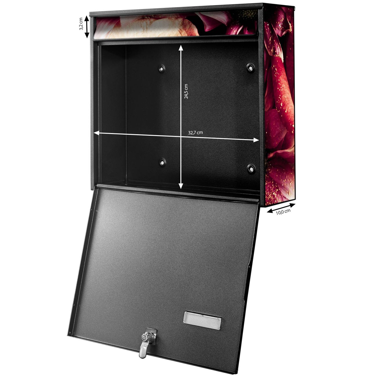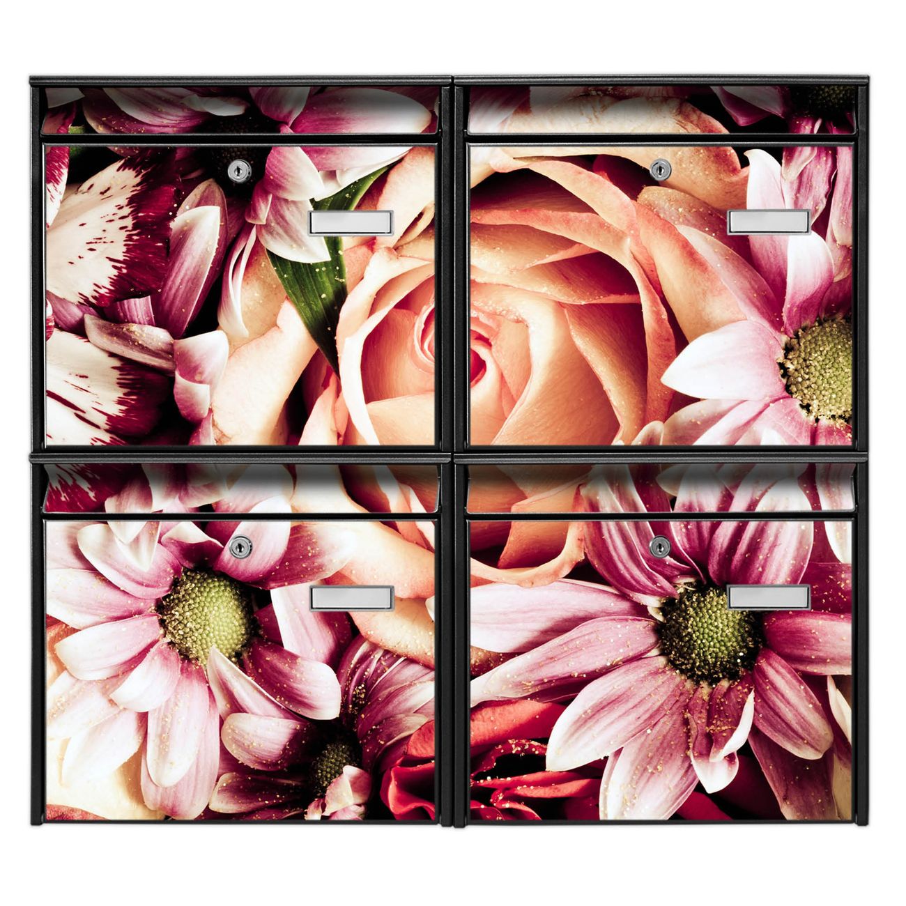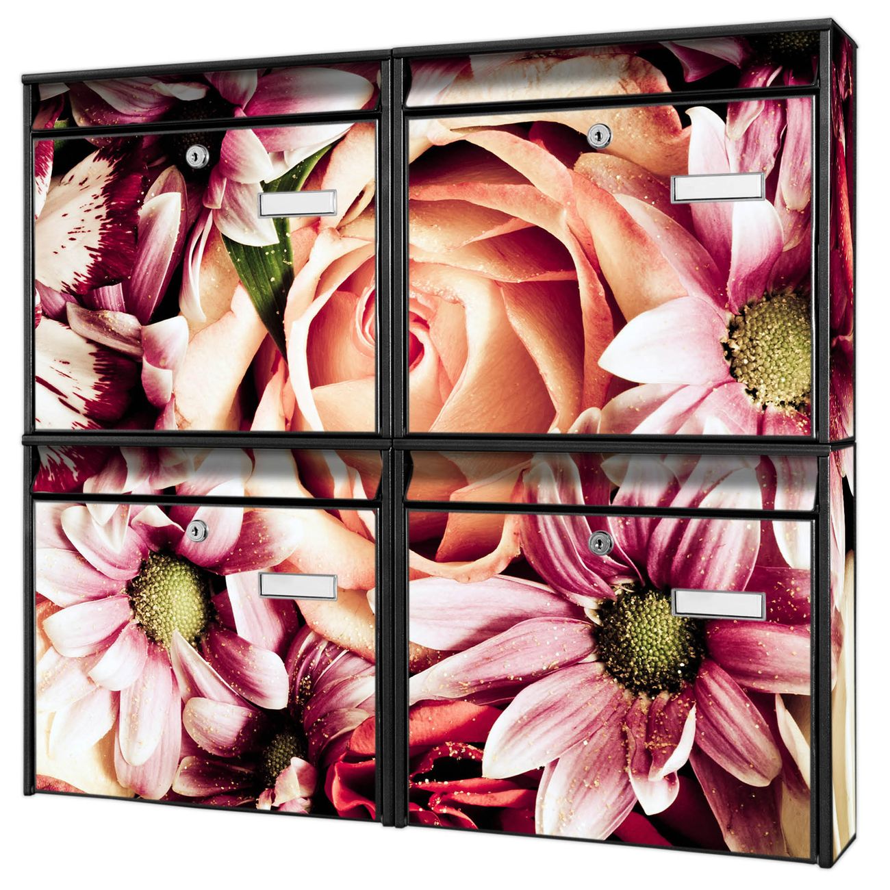 FUNKTION: Die Burg-Wächter Briefkastenanlage mit Motiv Brautstrauss bietet Ihnen ausreichend Fassungsvermögen um auch A4 und C4 Sendungen zu empfangen. Das integrierte Namensschild lässt sich individuell beschriften. Wählen Sie aus den Grundfarben weiß, silber und schwarz. DESIGN: Die 4 Briefkästen haben ein ansprechendes und zeitloses Design, ohne dabei auf Funktionalität zu verzichten. Das Material ist sehr stabil, wetterfest und rostfrei. Durch das Motiv Brautstrauss werden die Postkästen zu einem Blickfang. DETAILS: Die Postkästen bestehen aus verzinktem Stahl der zusätzlich mit Klarlack versiegelt wurde. Die Kästen sind gesamt 64,5cm hoch, 72,5cm breit und 10cm tief. Das Motiv besteht aus einer wetter- und UV-festen Folie, die Ihren Briefkasten zusätzlich vor Kratzern schützt. Die Postkästen werden mit Montagematerial, je einem Namensschild und je zwei Schlüsseln geliefert. NUTZEN: Das Briefkastenset eignet sich für die Wandmontage, die Größe bietet genügend Platz für Sendungen aller Art. Das zeitlose Design sowie die stabile Bauart bieten Ihnen einen treuen Begleiter für Ihre Post. BANJADO: