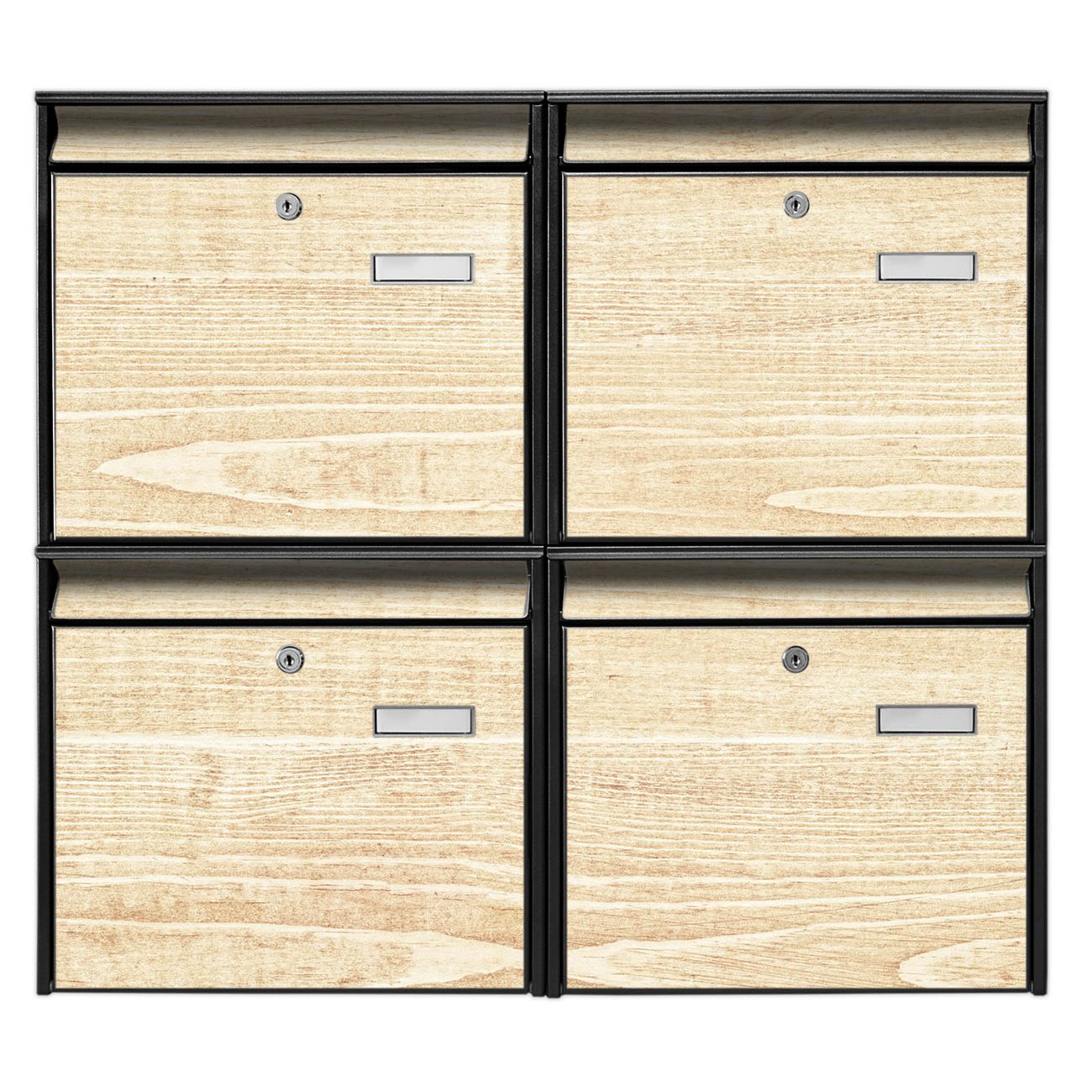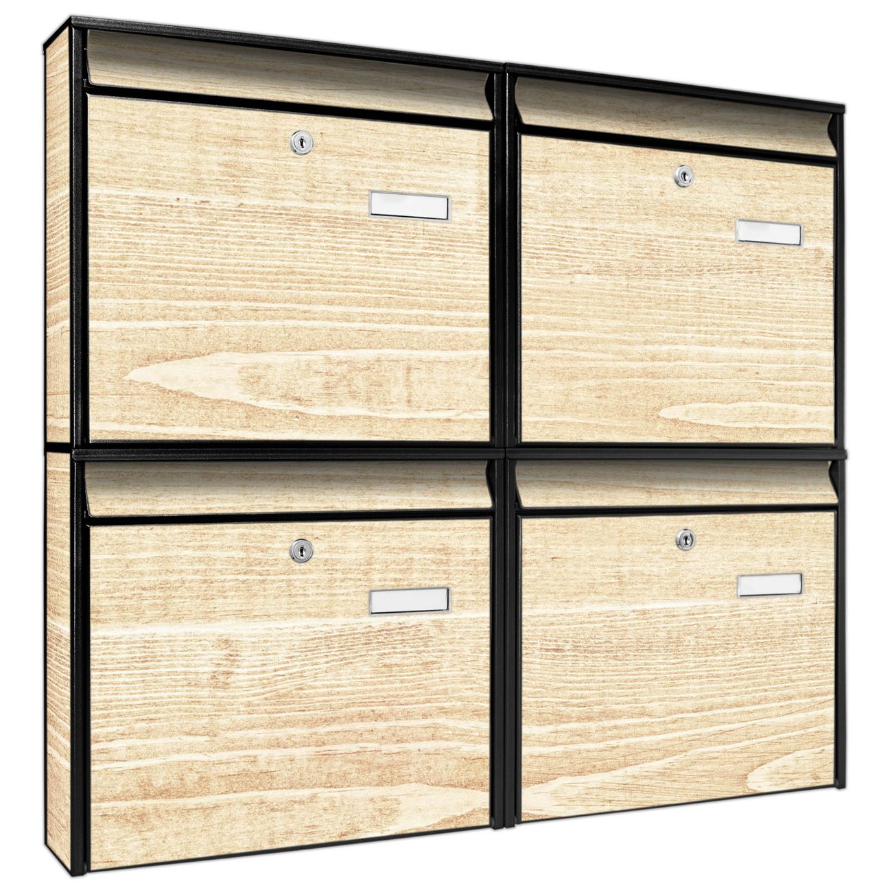 FUNKTION: Die Burg-Wächter Briefkastenanlage mit Motiv Bretter bietet Ihnen ausreichend Fassungsvermögen um auch A4 und C4 Sendungen zu empfangen. Das integrierte Namensschild lässt sich individuell beschriften. Wählen Sie aus den Grundfarben weiß, silber und schwarz. DESIGN: Die 4 Briefkästen haben ein ansprechendes und zeitloses Design, ohne dabei auf Funktionalität zu verzichten. Das Material ist sehr stabil, wetterfest und rostfrei. Durch das Motiv Bretter werden die Postkästen zu einem Blickfang. DETAILS: Die Postkästen bestehen aus verzinktem Stahl der zusätzlich mit Klarlack versiegelt wurde. Die Kästen sind gesamt 64,5cm hoch, 72,5cm breit und 10cm tief. Das Motiv besteht aus einer wetter- und UV-festen Folie, die Ihren Briefkasten zusätzlich vor Kratzern schützt. Die Postkästen werden mit Montagematerial, je einem Namensschild und je zwei Schlüsseln geliefert. NUTZEN: Das Briefkastenset eignet sich für die Wandmontage, die Größe bietet genügend Platz für Sendungen aller Art. Das zeitlose Design sowie die stabile Bauart bieten Ihnen einen treuen Begleiter für Ihre Post. BANJADO: