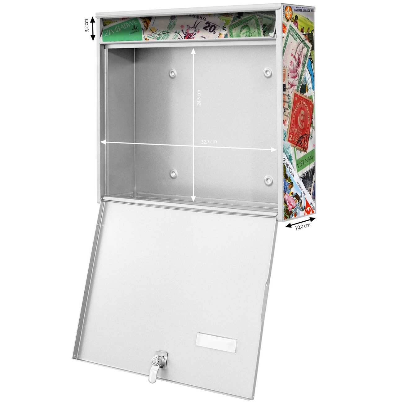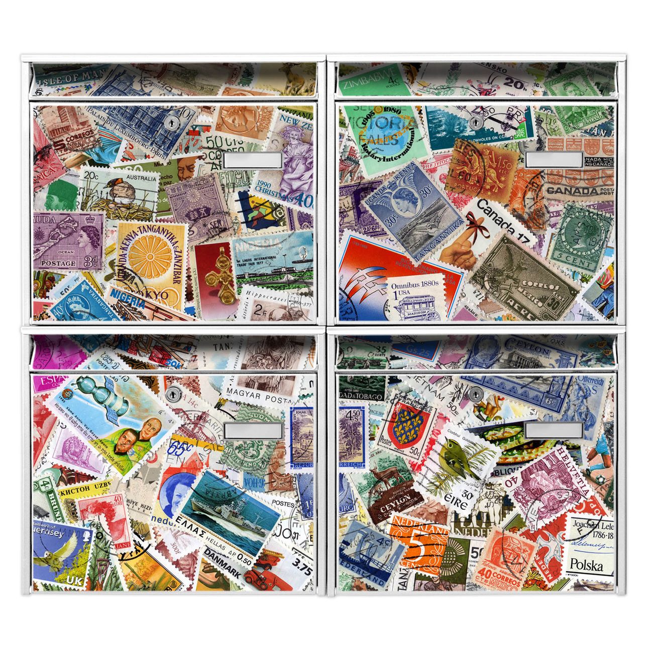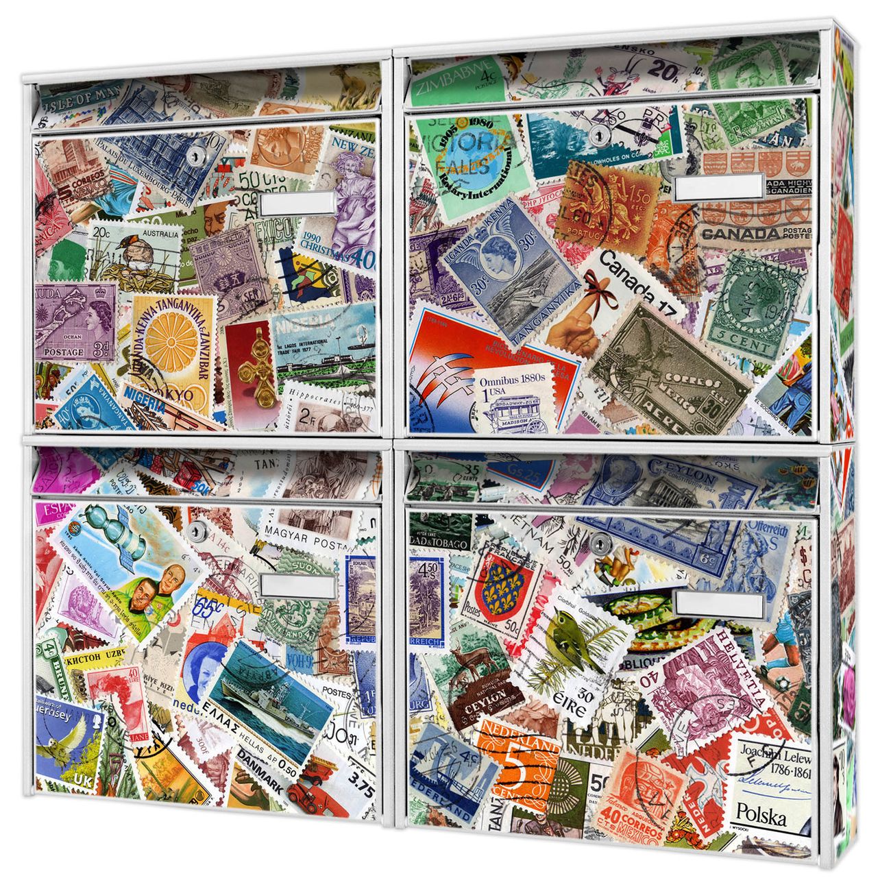 FUNKTION: Die Burg-Wächter Briefkastenanlage mit Motiv Briefmarken bietet Ihnen ausreichend Fassungsvermögen um auch A4 und C4 Sendungen zu empfangen. Das integrierte Namensschild lässt sich individuell beschriften. Wählen Sie aus den Grundfarben weiß, silber und schwarz. DESIGN: Die 4 Briefkästen haben ein ansprechendes und zeitloses Design, ohne dabei auf Funktionalität zu verzichten. Das Material ist sehr stabil, wetterfest und rostfrei. Durch das Motiv Briefmarken werden die Postkästen zu einem Blickfang. DETAILS: Die Postkästen bestehen aus verzinktem Stahl der zusätzlich mit Klarlack versiegelt wurde. Die Kästen sind gesamt 64,5cm hoch, 72,5cm breit und 10cm tief. Das Motiv besteht aus einer wetter- und UV-festen Folie, die Ihren Briefkasten zusätzlich vor Kratzern schützt. Die Postkästen werden mit Montagematerial, je einem Namensschild und je zwei Schlüsseln geliefert. NUTZEN: Das Briefkastenset eignet sich für die Wandmontage, die Größe bietet genügend Platz für Sendungen aller Art. Das zeitlose Design sowie die stabile Bauart bieten Ihnen einen treuen Begleiter für Ihre Post. BANJADO: