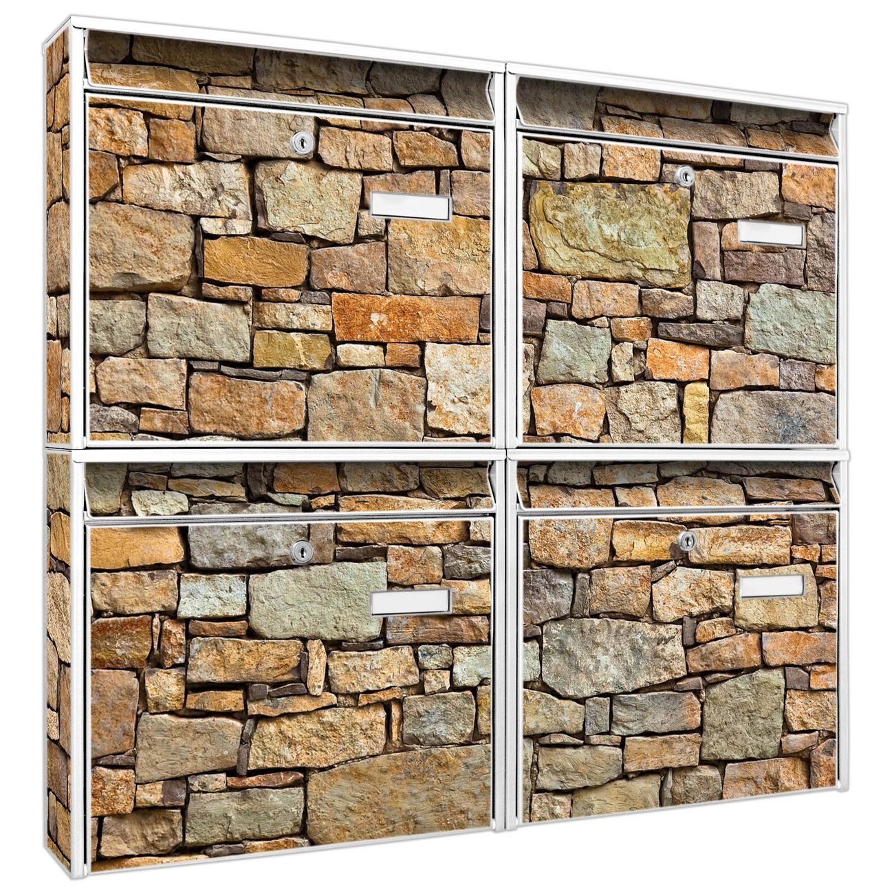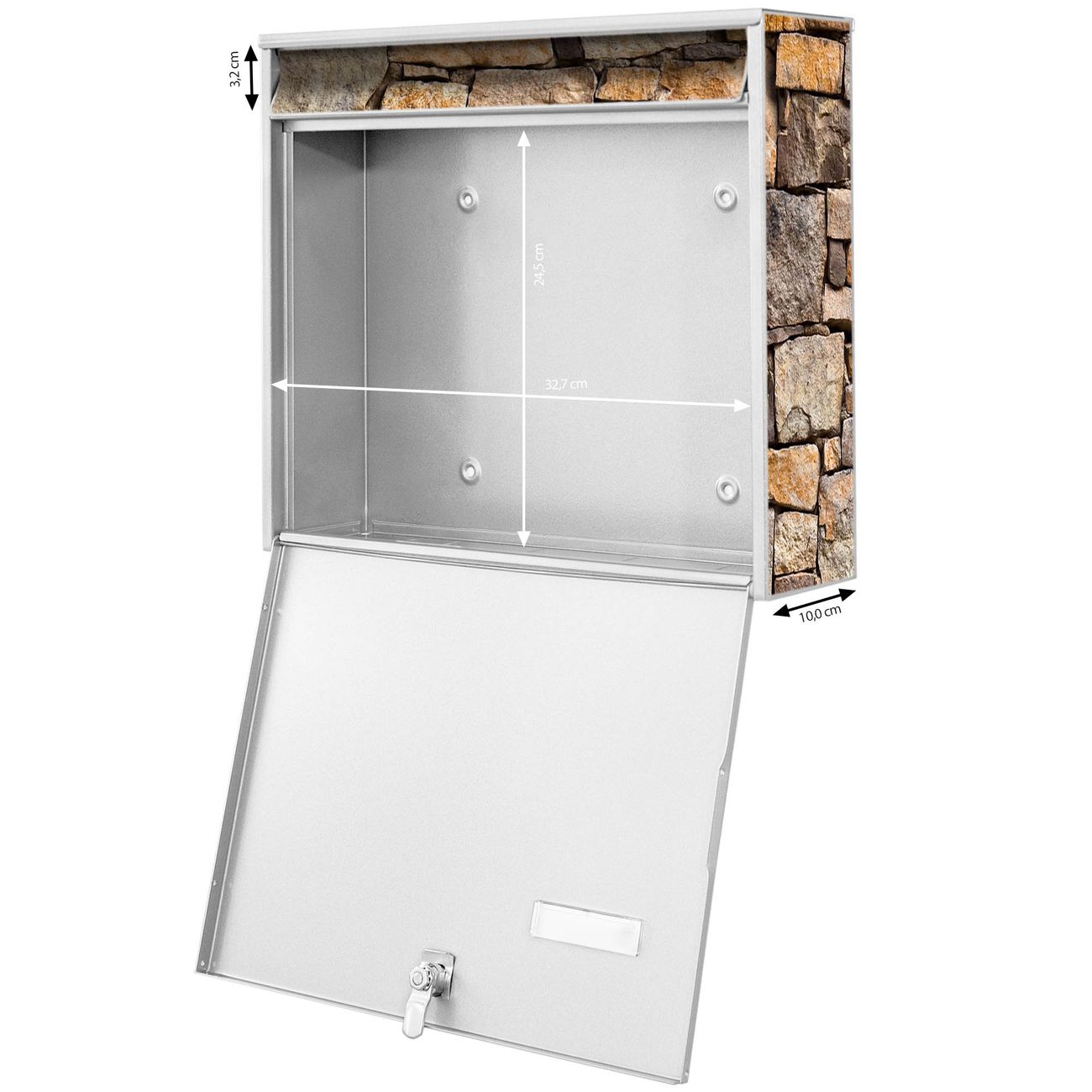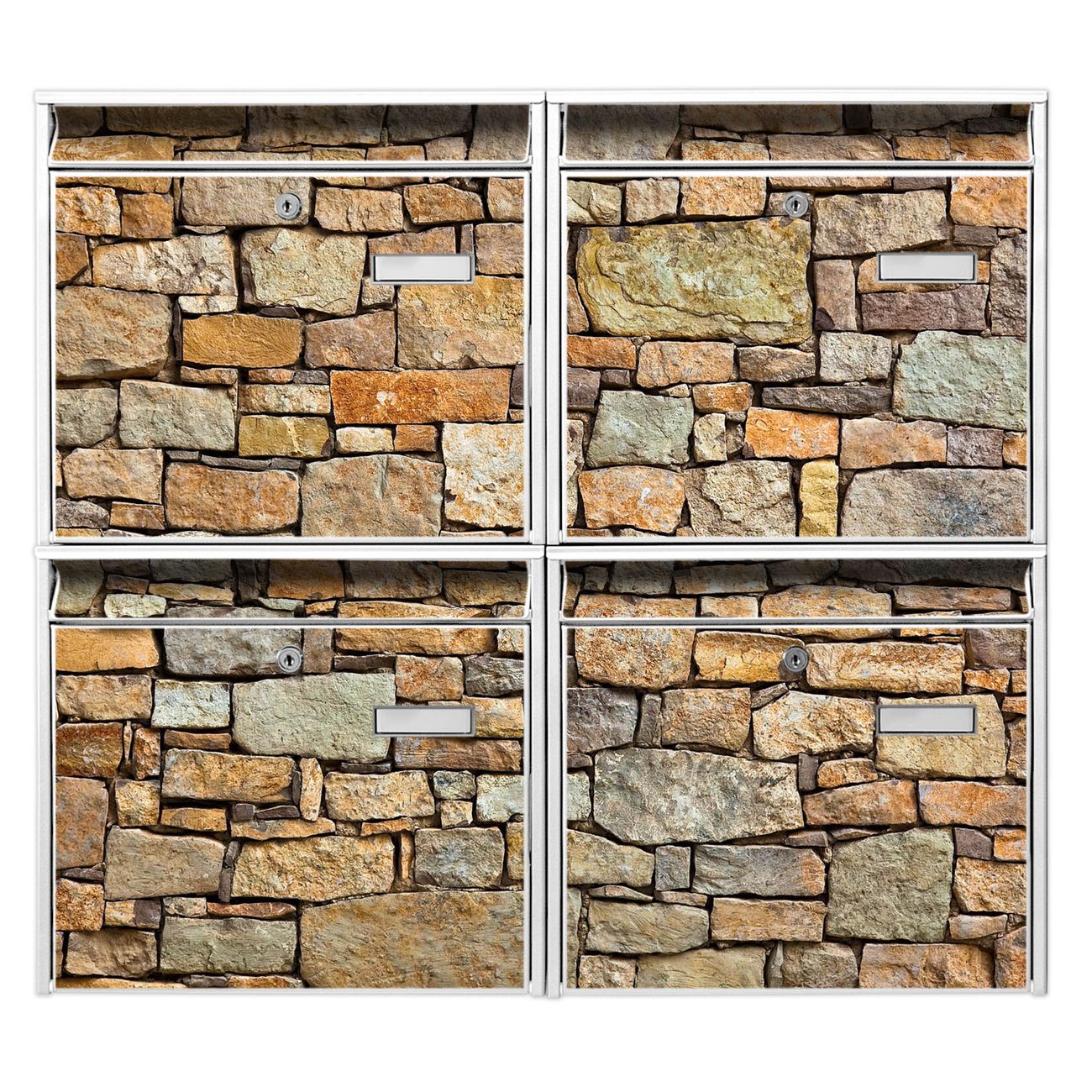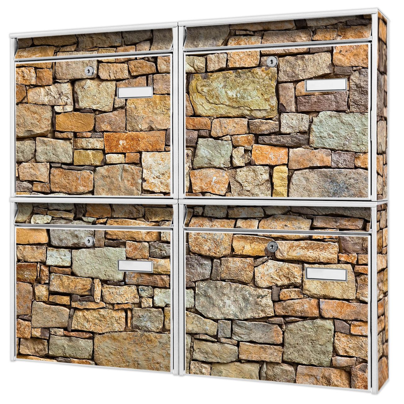 FUNKTION: Die Burg-Wächter Briefkastenanlage mit Motiv Bruchsteinmauer bietet Ihnen ausreichend Fassungsvermögen um auch A4 und C4 Sendungen zu empfangen. Das integrierte Namensschild lässt sich individuell beschriften. Wählen Sie aus den Grundfarben weiß, silber und schwarz. DESIGN: Die 4 Briefkästen haben ein ansprechendes und zeitloses Design, ohne dabei auf Funktionalität zu verzichten. Das Material ist sehr stabil, wetterfest und rostfrei. Durch das Motiv Bruchsteinmauer werden die Postkästen zu einem Blickfang. DETAILS: Die Postkästen bestehen aus verzinktem Stahl der zusätzlich mit Klarlack versiegelt wurde. Die Kästen sind gesamt 64,5cm hoch, 72,5cm breit und 10cm tief. Das Motiv besteht aus einer wetter- und UV-festen Folie, die Ihren Briefkasten zusätzlich vor Kratzern schützt. Die Postkästen werden mit Montagematerial, je einem Namensschild und je zwei Schlüsseln geliefert. NUTZEN: Das Briefkastenset eignet sich für die Wandmontage, die Größe bietet genügend Platz für Sendungen aller Art. Das zeitlose Design sowie die stabile Bauart bieten Ihnen einen treuen Begleiter für Ihre Post. BANJADO: