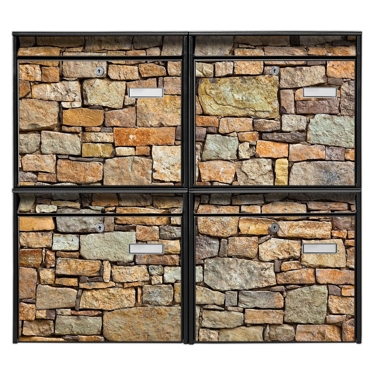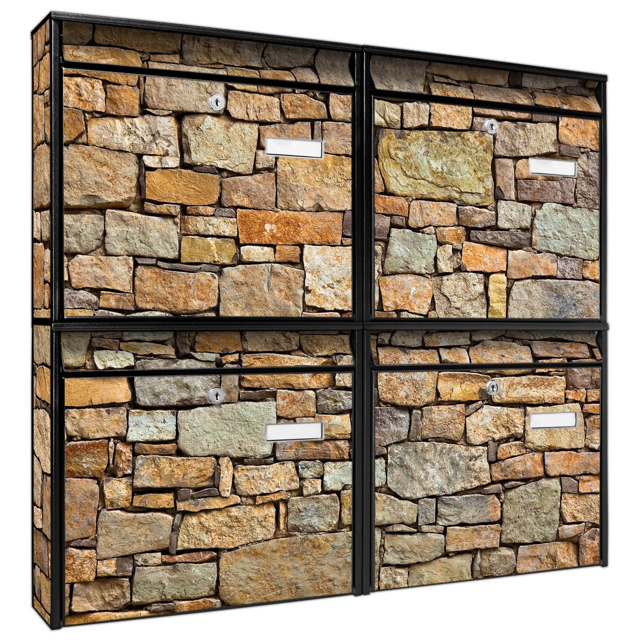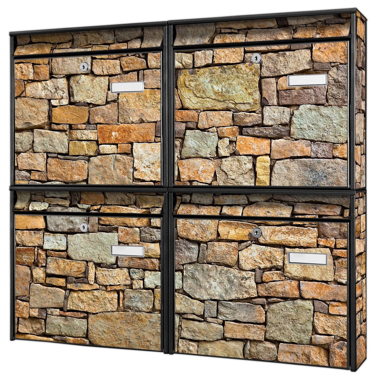 FUNKTION: Die Burg-Wächter Briefkastenanlage mit Motiv Bruchsteinmauer bietet Ihnen ausreichend Fassungsvermögen um auch A4 und C4 Sendungen zu empfangen. Das integrierte Namensschild lässt sich individuell beschriften. Wählen Sie aus den Grundfarben weiß, silber und schwarz. DESIGN: Die 4 Briefkästen haben ein ansprechendes und zeitloses Design, ohne dabei auf Funktionalität zu verzichten. Das Material ist sehr stabil, wetterfest und rostfrei. Durch das Motiv Bruchsteinmauer werden die Postkästen zu einem Blickfang. DETAILS: Die Postkästen bestehen aus verzinktem Stahl der zusätzlich mit Klarlack versiegelt wurde. Die Kästen sind gesamt 64,5cm hoch, 72,5cm breit und 10cm tief. Das Motiv besteht aus einer wetter- und UV-festen Folie, die Ihren Briefkasten zusätzlich vor Kratzern schützt. Die Postkästen werden mit Montagematerial, je einem Namensschild und je zwei Schlüsseln geliefert. NUTZEN: Das Briefkastenset eignet sich für die Wandmontage, die Größe bietet genügend Platz für Sendungen aller Art. Das zeitlose Design sowie die stabile Bauart bieten Ihnen einen treuen Begleiter für Ihre Post. BANJADO: