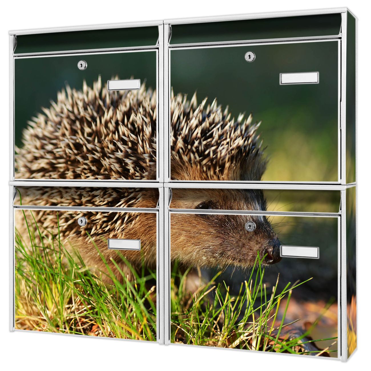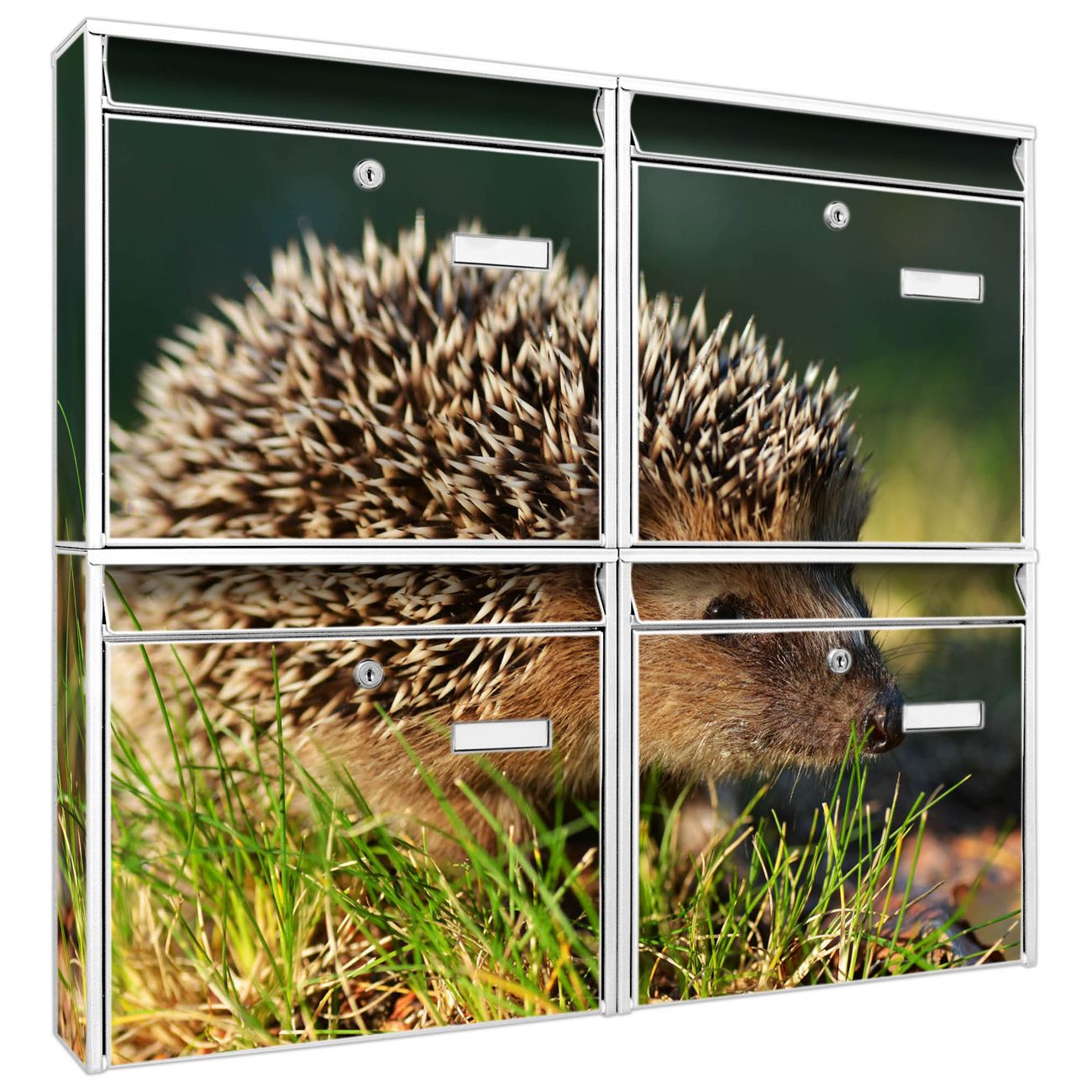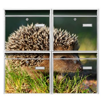 FUNKTION: Die Burg-Wächter Briefkastenanlage mit Motiv Bruno bietet Ihnen ausreichend Fassungsvermögen um auch A4 und C4 Sendungen zu empfangen. Das integrierte Namensschild lässt sich individuell beschriften. Wählen Sie aus den Grundfarben weiß, silber und schwarz. DESIGN: Die 4 Briefkästen haben ein ansprechendes und zeitloses Design, ohne dabei auf Funktionalität zu verzichten. Das Material ist sehr stabil, wetterfest und rostfrei. Durch das Motiv Bruno werden die Postkästen zu einem Blickfang. DETAILS: Die Postkästen bestehen aus verzinktem Stahl der zusätzlich mit Klarlack versiegelt wurde. Die Kästen sind gesamt 64,5cm hoch, 72,5cm breit und 10cm tief. Das Motiv besteht aus einer wetter- und UV-festen Folie, die Ihren Briefkasten zusätzlich vor Kratzern schützt. Die Postkästen werden mit Montagematerial, je einem Namensschild und je zwei Schlüsseln geliefert. NUTZEN: Das Briefkastenset eignet sich für die Wandmontage, die Größe bietet genügend Platz für Sendungen aller Art. Das zeitlose Design sowie die stabile Bauart bieten Ihnen einen treuen Begleiter für Ihre Post. BANJADO: