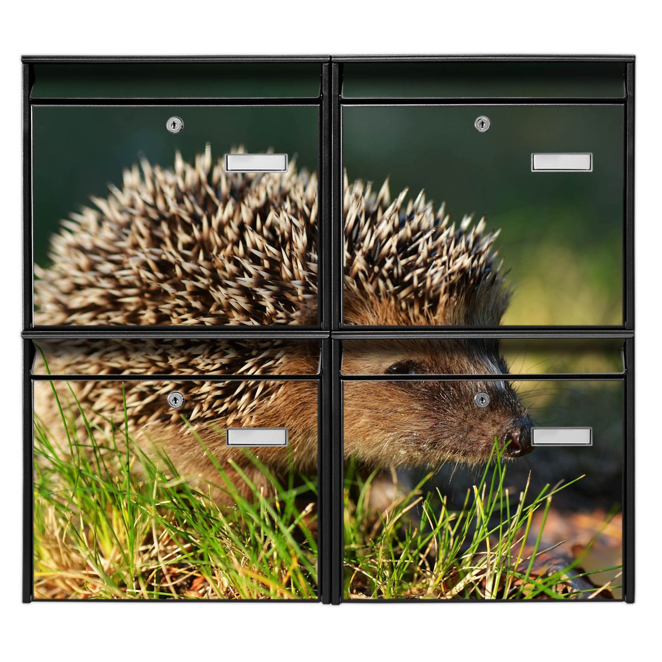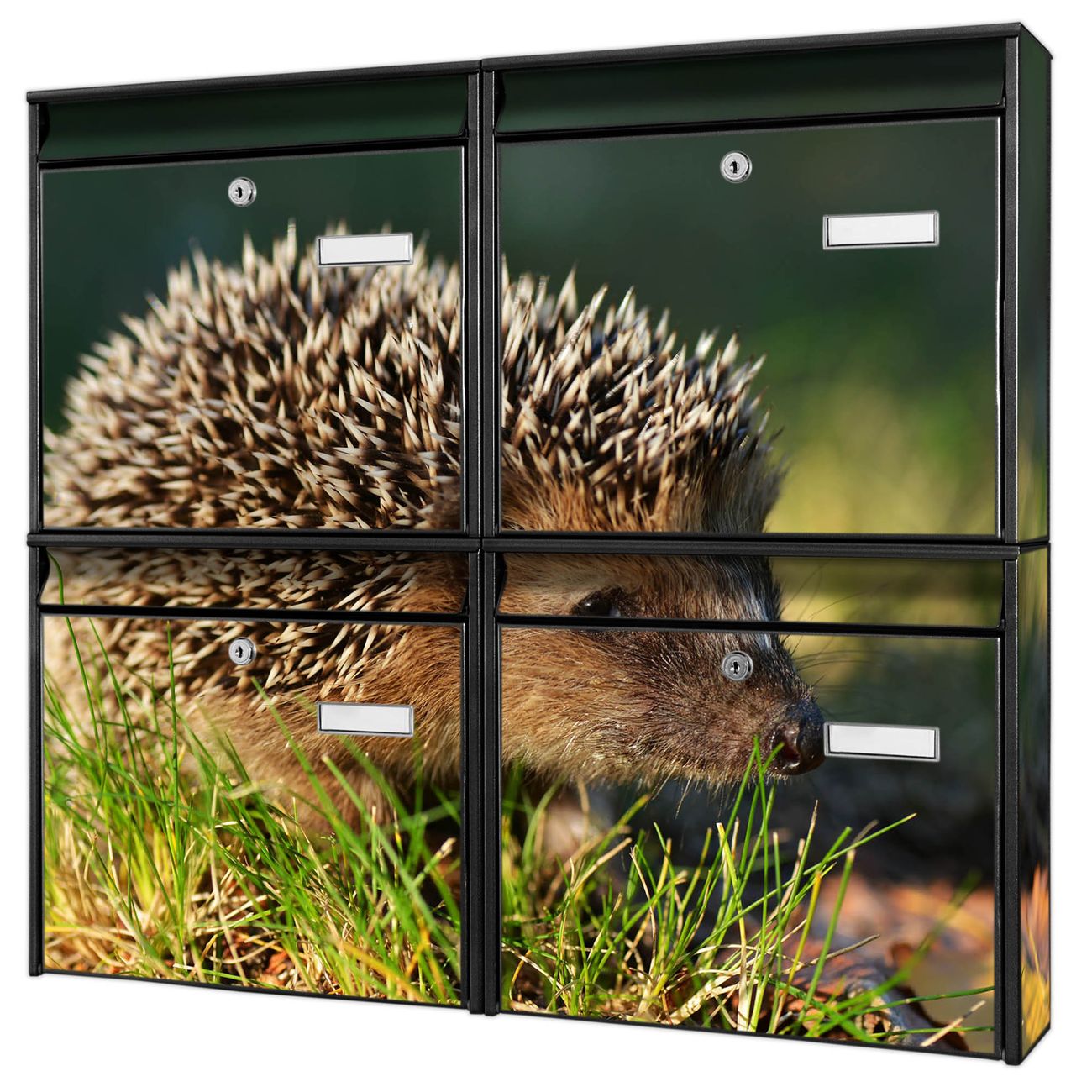 FUNKTION: Die Burg-Wächter Briefkastenanlage mit Motiv Bruno bietet Ihnen ausreichend Fassungsvermögen um auch A4 und C4 Sendungen zu empfangen. Das integrierte Namensschild lässt sich individuell beschriften. Wählen Sie aus den Grundfarben weiß, silber und schwarz. DESIGN: Die 4 Briefkästen haben ein ansprechendes und zeitloses Design, ohne dabei auf Funktionalität zu verzichten. Das Material ist sehr stabil, wetterfest und rostfrei. Durch das Motiv Bruno werden die Postkästen zu einem Blickfang. DETAILS: Die Postkästen bestehen aus verzinktem Stahl der zusätzlich mit Klarlack versiegelt wurde. Die Kästen sind gesamt 64,5cm hoch, 72,5cm breit und 10cm tief. Das Motiv besteht aus einer wetter- und UV-festen Folie, die Ihren Briefkasten zusätzlich vor Kratzern schützt. Die Postkästen werden mit Montagematerial, je einem Namensschild und je zwei Schlüsseln geliefert. NUTZEN: Das Briefkastenset eignet sich für die Wandmontage, die Größe bietet genügend Platz für Sendungen aller Art. Das zeitlose Design sowie die stabile Bauart bieten Ihnen einen treuen Begleiter für Ihre Post. BANJADO: