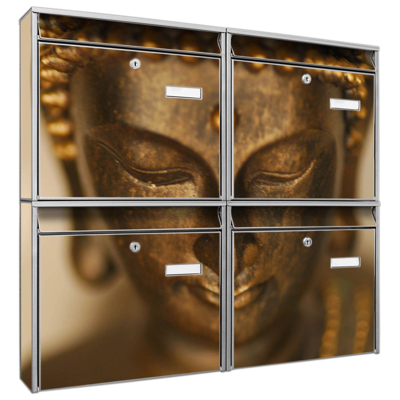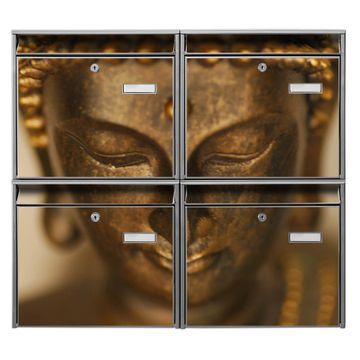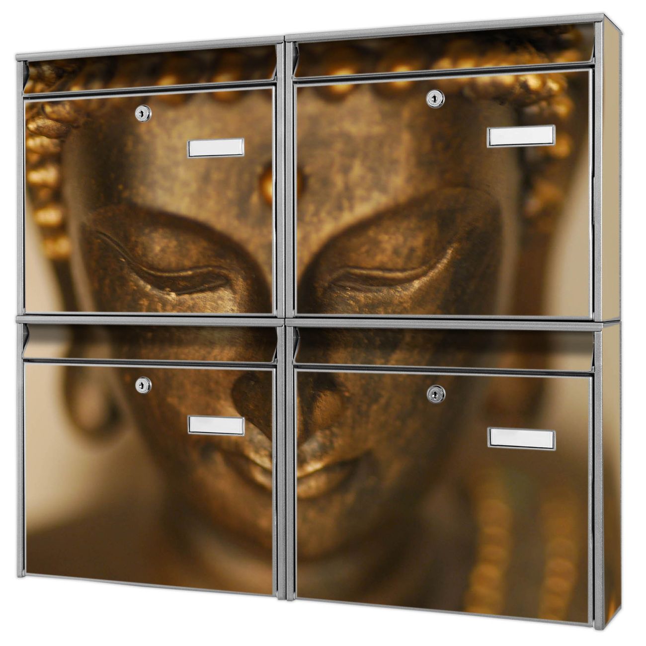 FUNKTION: Die Burg-Wächter Briefkastenanlage mit Motiv Buddha Gold bietet Ihnen ausreichend Fassungsvermögen um auch A4 und C4 Sendungen zu empfangen. Das integrierte Namensschild lässt sich individuell beschriften. Wählen Sie aus den Grundfarben weiß, silber und schwarz. DESIGN: Die 4 Briefkästen haben ein ansprechendes und zeitloses Design, ohne dabei auf Funktionalität zu verzichten. Das Material ist sehr stabil, wetterfest und rostfrei. Durch das Motiv Buddha Gold werden die Postkästen zu einem Blickfang. DETAILS: Die Postkästen bestehen aus verzinktem Stahl der zusätzlich mit Klarlack versiegelt wurde. Die Kästen sind gesamt 64,5cm hoch, 72,5cm breit und 10cm tief. Das Motiv besteht aus einer wetter- und UV-festen Folie, die Ihren Briefkasten zusätzlich vor Kratzern schützt. Die Postkästen werden mit Montagematerial, je einem Namensschild und je zwei Schlüsseln geliefert. NUTZEN: Das Briefkastenset eignet sich für die Wandmontage, die Größe bietet genügend Platz für Sendungen aller Art. Das zeitlose Design sowie die stabile Bauart bieten Ihnen einen treuen Begleiter für Ihre Post. BANJADO: