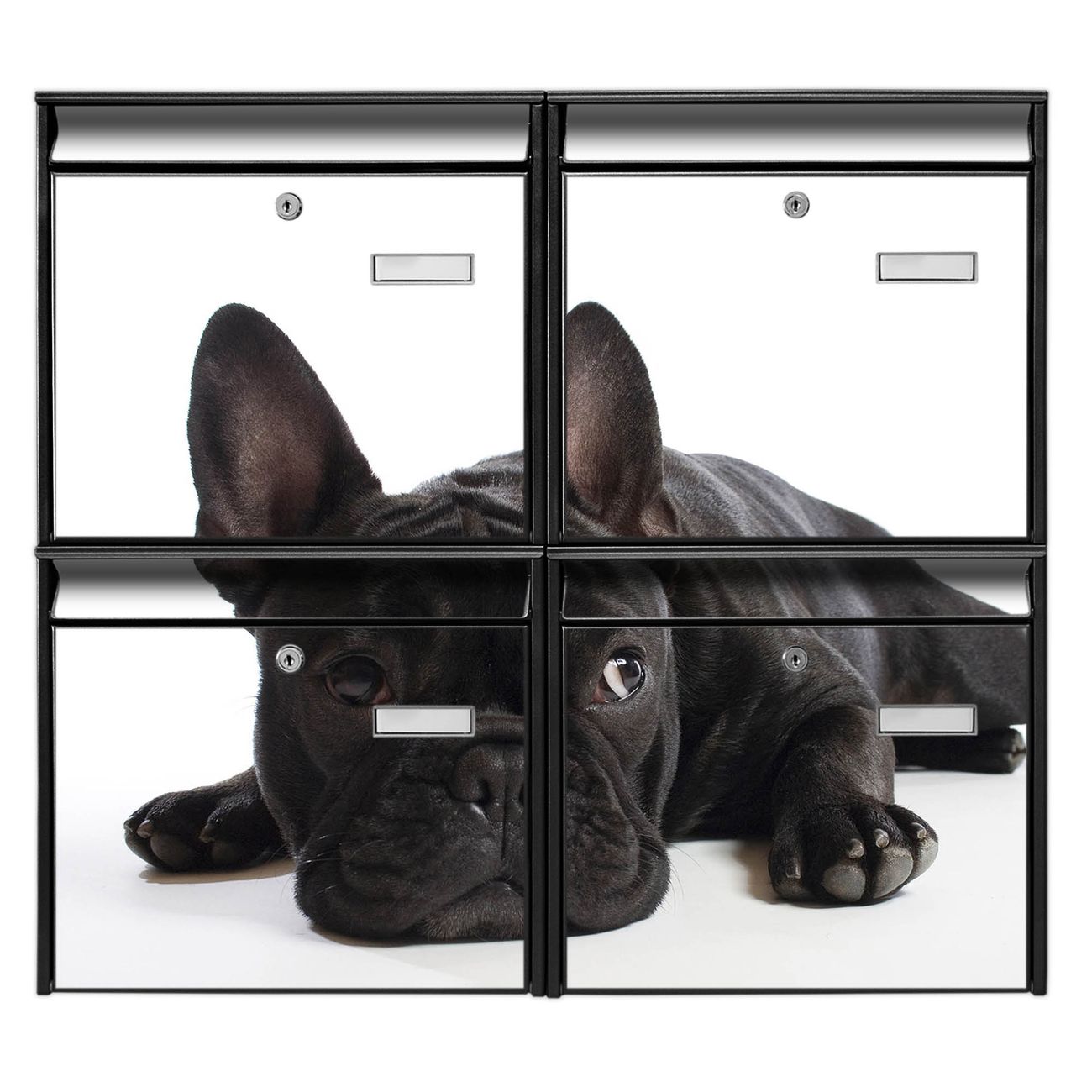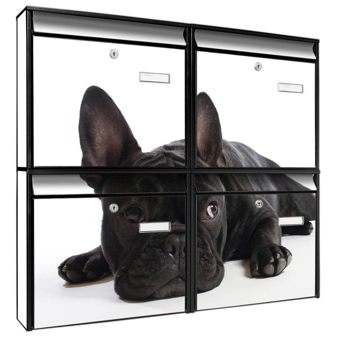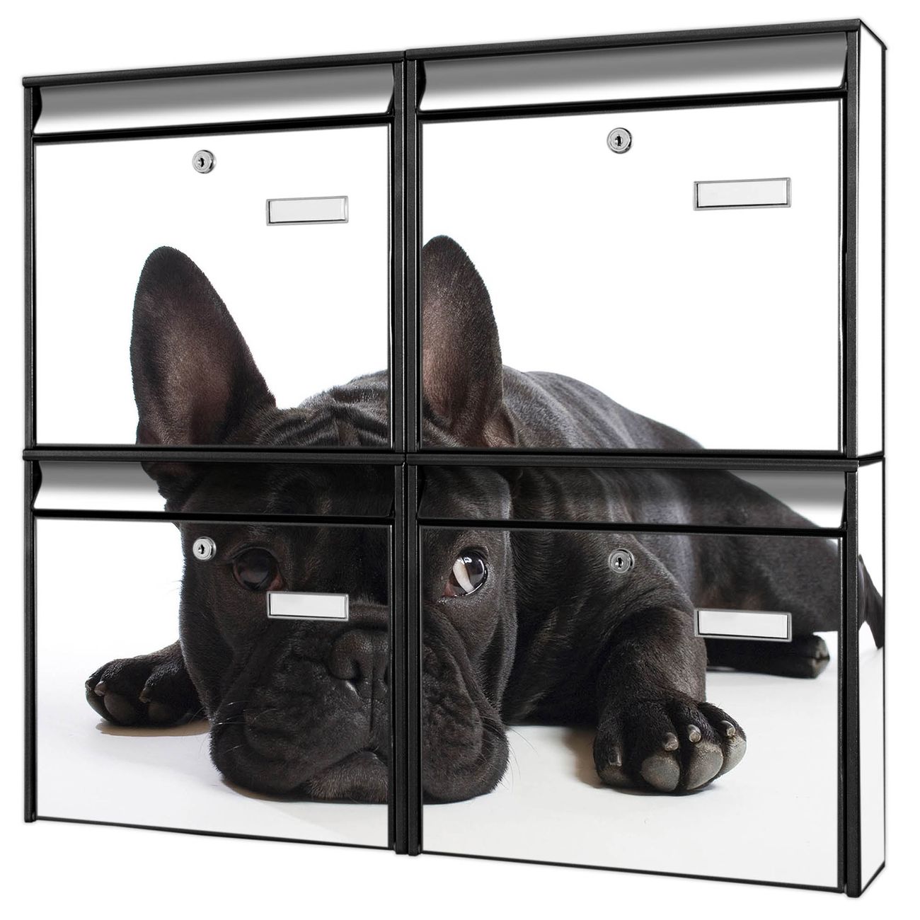 FUNKTION: Die Burg-Wächter Briefkastenanlage mit Motiv Bulldogge bietet Ihnen ausreichend Fassungsvermögen um auch A4 und C4 Sendungen zu empfangen. Das integrierte Namensschild lässt sich individuell beschriften. Wählen Sie aus den Grundfarben weiß, silber und schwarz. DESIGN: Die 4 Briefkästen haben ein ansprechendes und zeitloses Design, ohne dabei auf Funktionalität zu verzichten. Das Material ist sehr stabil, wetterfest und rostfrei. Durch das Motiv Bulldogge werden die Postkästen zu einem Blickfang. DETAILS: Die Postkästen bestehen aus verzinktem Stahl der zusätzlich mit Klarlack versiegelt wurde. Die Kästen sind gesamt 64,5cm hoch, 72,5cm breit und 10cm tief. Das Motiv besteht aus einer wetter- und UV-festen Folie, die Ihren Briefkasten zusätzlich vor Kratzern schützt. Die Postkästen werden mit Montagematerial, je einem Namensschild und je zwei Schlüsseln geliefert. NUTZEN: Das Briefkastenset eignet sich für die Wandmontage, die Größe bietet genügend Platz für Sendungen aller Art. Das zeitlose Design sowie die stabile Bauart bieten Ihnen einen treuen Begleiter für Ihre Post. BANJADO: