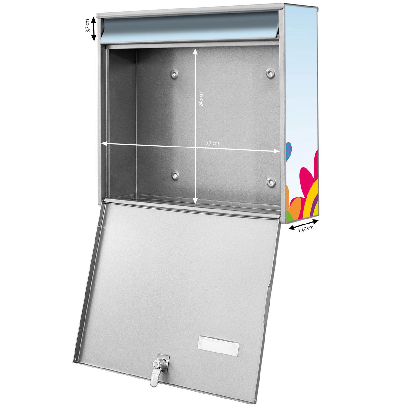 FUNKTION: Die Burg-Wächter Briefkastenanlage mit Motiv Bunte Blumen bietet Ihnen ausreichend Fassungsvermögen um auch A4 und C4 Sendungen zu empfangen. Das integrierte Namensschild lässt sich individuell beschriften. Wählen Sie aus den Grundfarben weiß, silber und schwarz. DESIGN: Die 4 Briefkästen haben ein ansprechendes und zeitloses Design, ohne dabei auf Funktionalität zu verzichten. Das Material ist sehr stabil, wetterfest und rostfrei. Durch das Motiv Bunte Blumen werden die Postkästen zu einem Blickfang. DETAILS: Die Postkästen bestehen aus verzinktem Stahl der zusätzlich mit Klarlack versiegelt wurde. Die Kästen sind gesamt 64,5cm hoch, 72,5cm breit und 10cm tief. Das Motiv besteht aus einer wetter- und UV-festen Folie, die Ihren Briefkasten zusätzlich vor Kratzern schützt. Die Postkästen werden mit Montagematerial, je einem Namensschild und je zwei Schlüsseln geliefert. NUTZEN: Das Briefkastenset eignet sich für die Wandmontage, die Größe bietet genügend Platz für Sendungen aller Art. Das zeitlose Design sowie die stabile Bauart bieten Ihnen einen treuen Begleiter für Ihre Post. BANJADO: